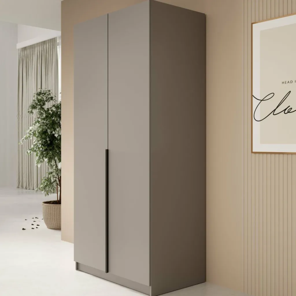 Kledingkast Bruno is een moderne en praktische kast met een stijlvolle uitstraling. De kast is uitgevoerd in beige met een opvallende, zwarte handgreep over de volledige lengte van de deuren. Dankzij het tijdloze ontwerp past deze 2-deurs kledingkast perfect in uiteenlopende interieurs.