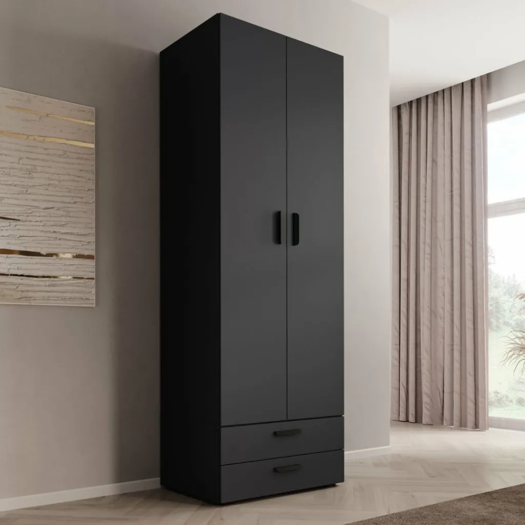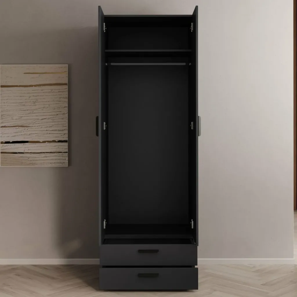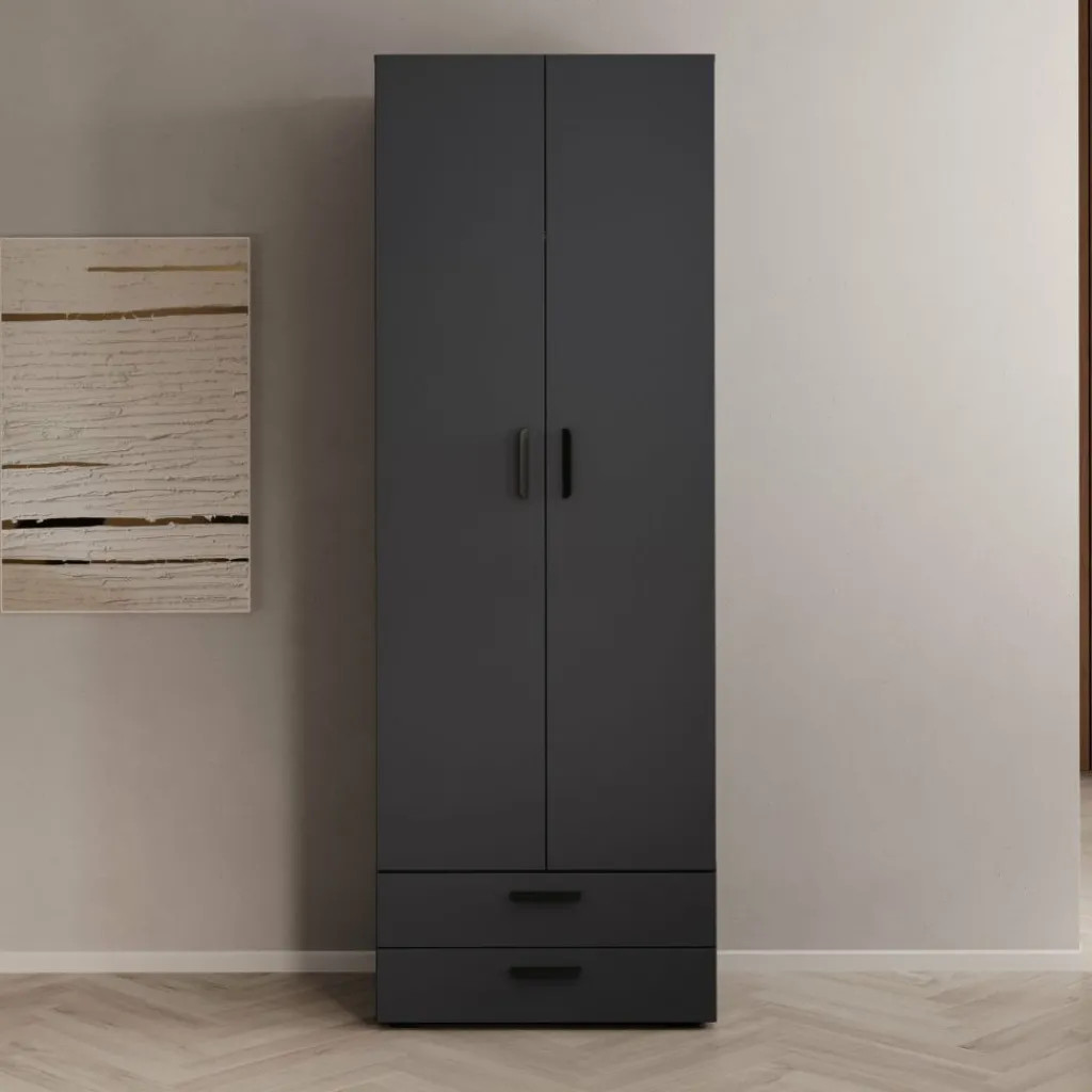 Kledingkast Brussel is een smalle, praktische garderobekast in de kleur antraciet. De kast beschikt over twee scharnierdeuren en is aan de onderzijde voorzien van twee ruime opberglades. Dankzij de inkeping tussen de deuren open je de kast eenvoudig zonder grepen.