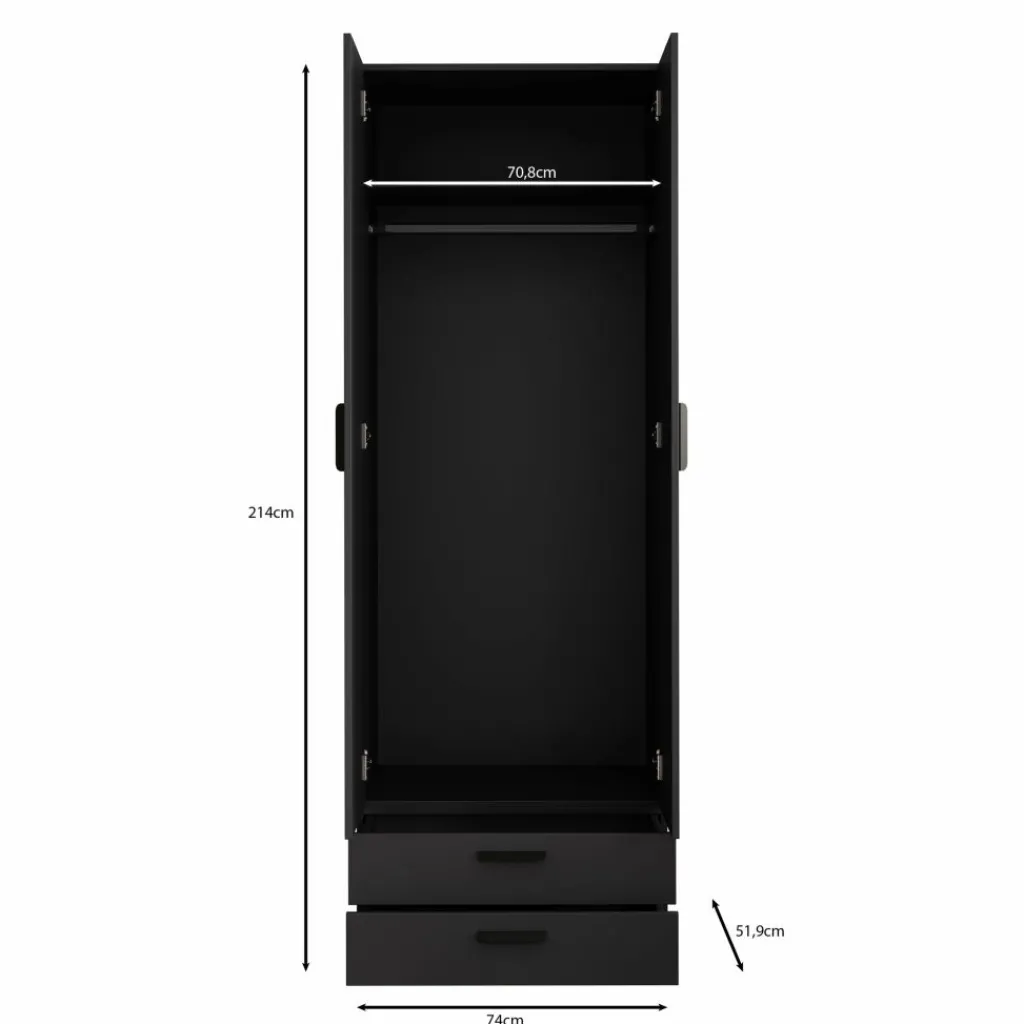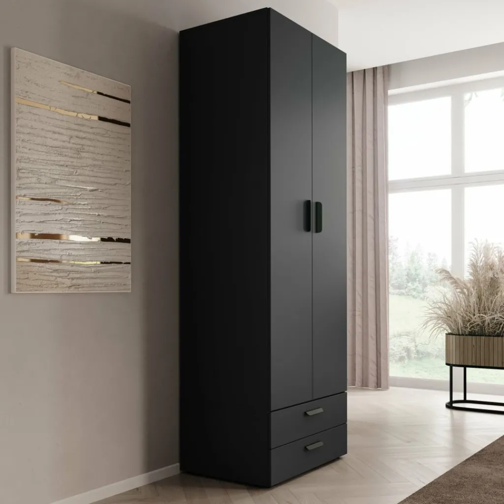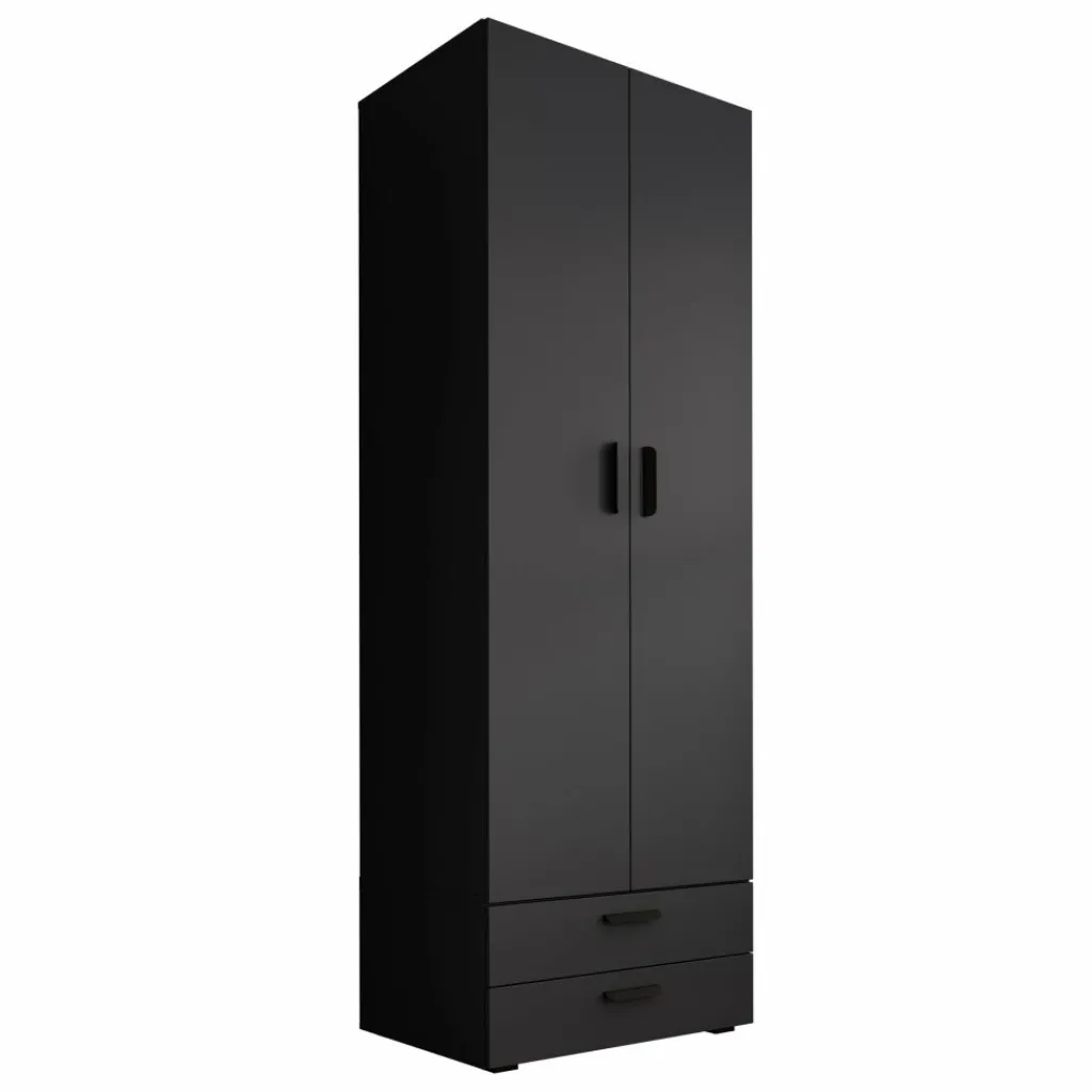 Kledingkast Brussel is een smalle, praktische garderobekast in de kleur antraciet. De kast beschikt over twee scharnierdeuren en is aan de onderzijde voorzien van twee ruime opberglades. Dankzij de inkeping tussen de deuren open je de kast eenvoudig zonder grepen.