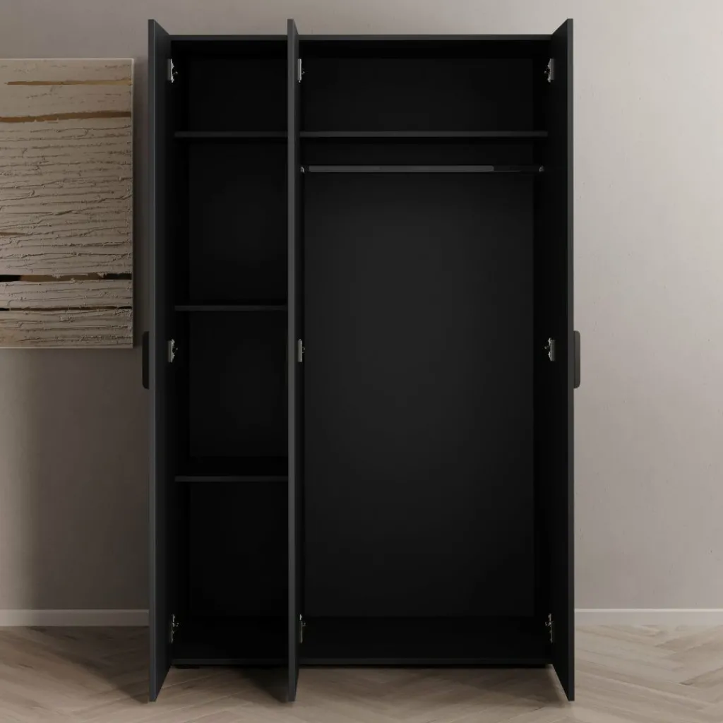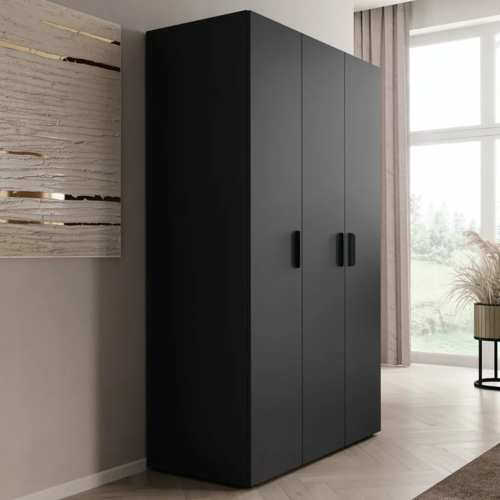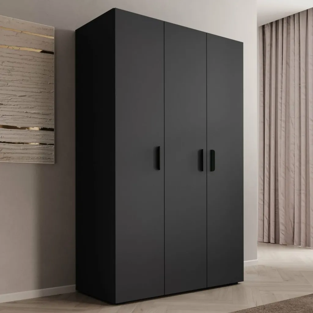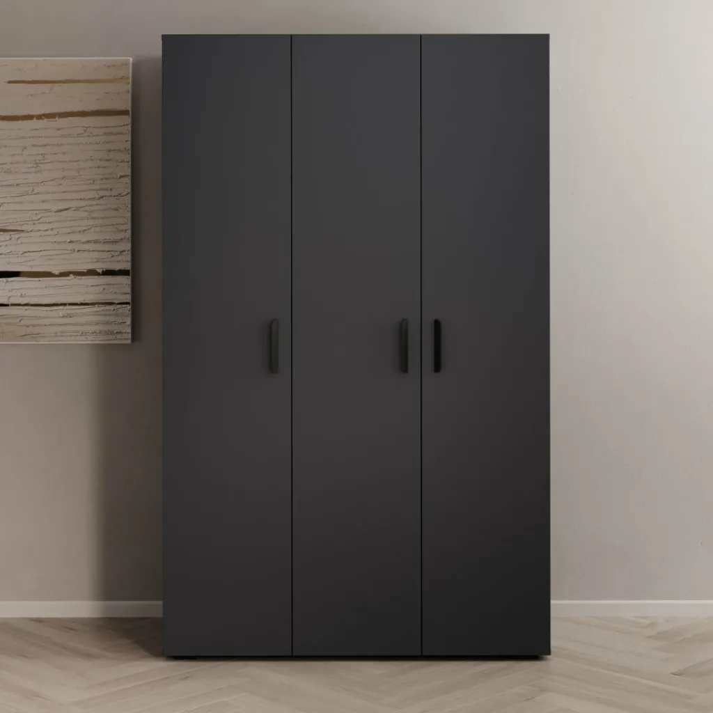 Kledingkast Brussel is uitgevoerd in strak antraciet en voorzien van drie deuren met handgrepen. De kast is 111 cm breed en 179 cm hoog, wat hem geschikt maakt voor kleinere slaapkamers of extra opbergruimte.