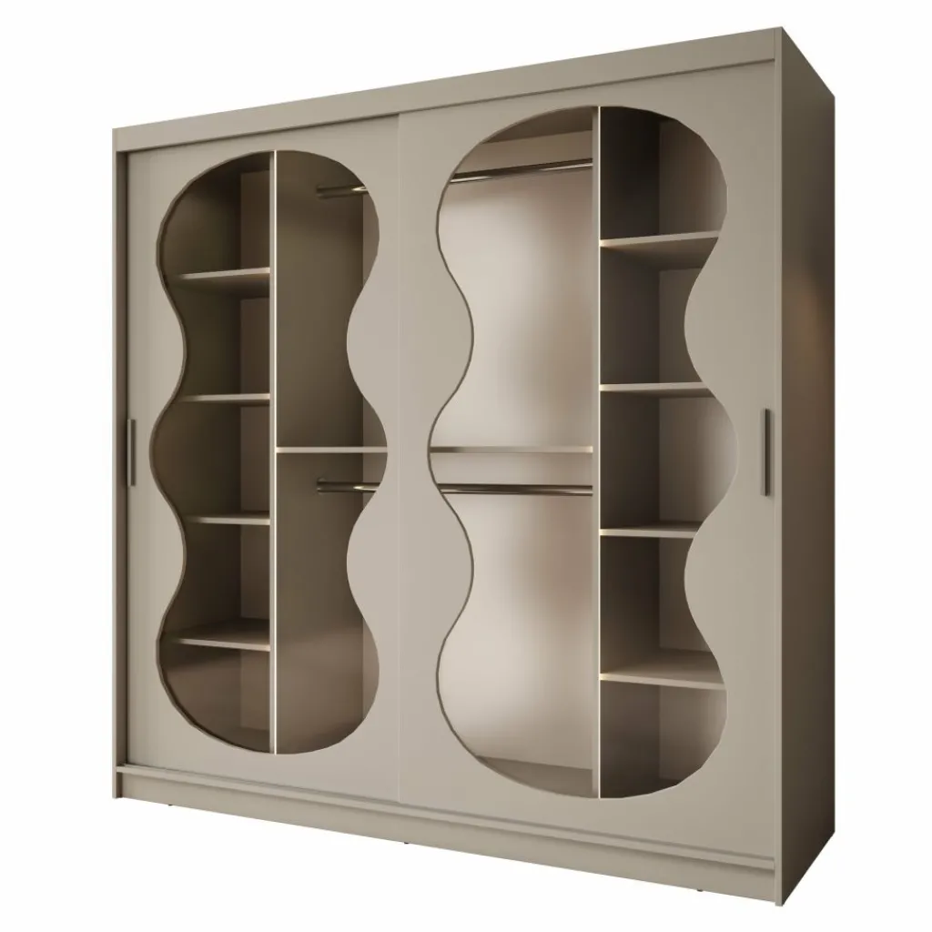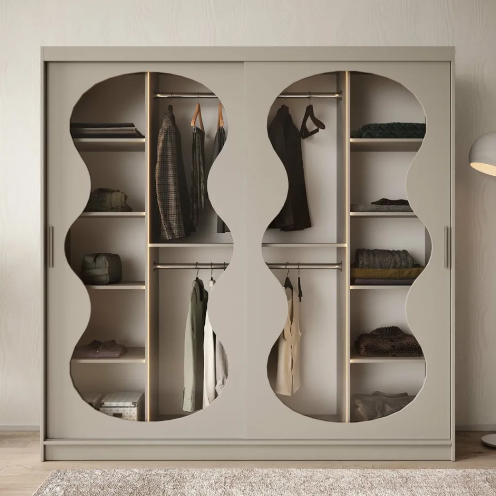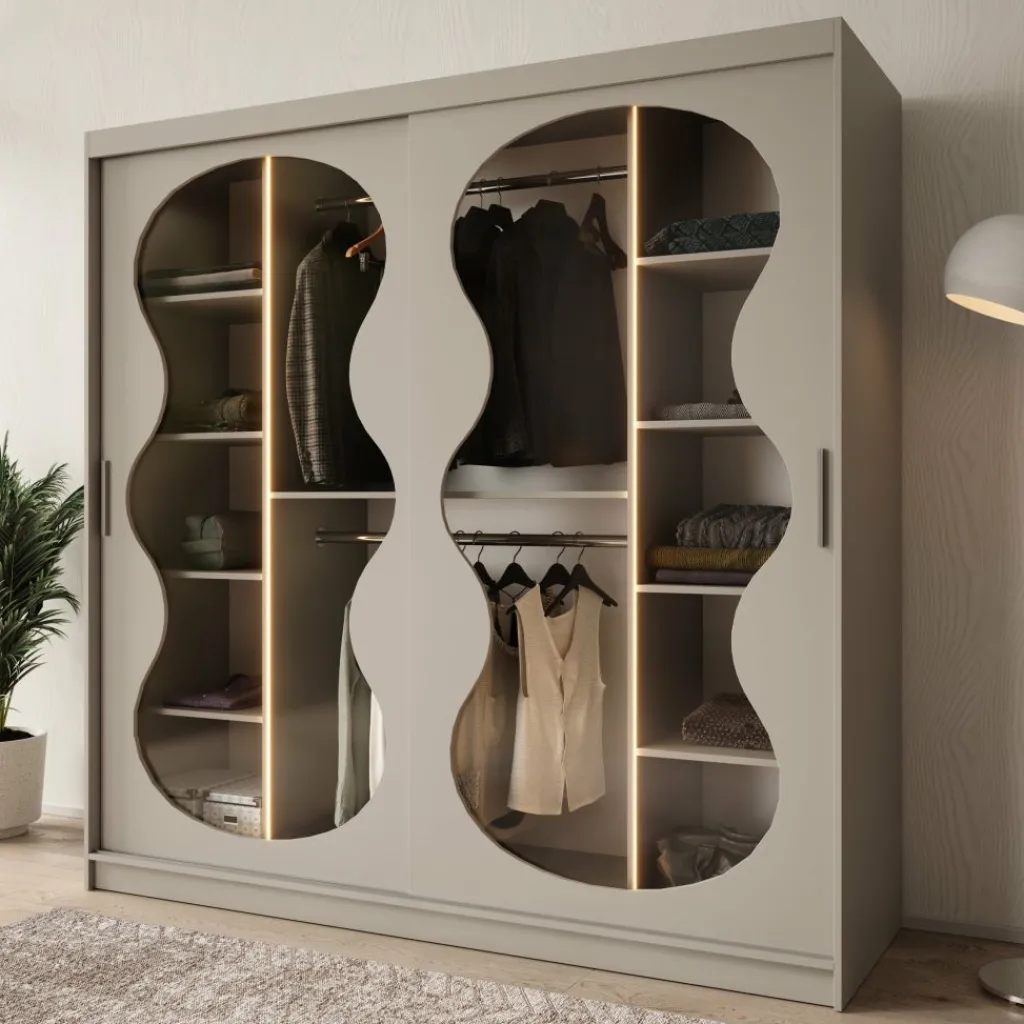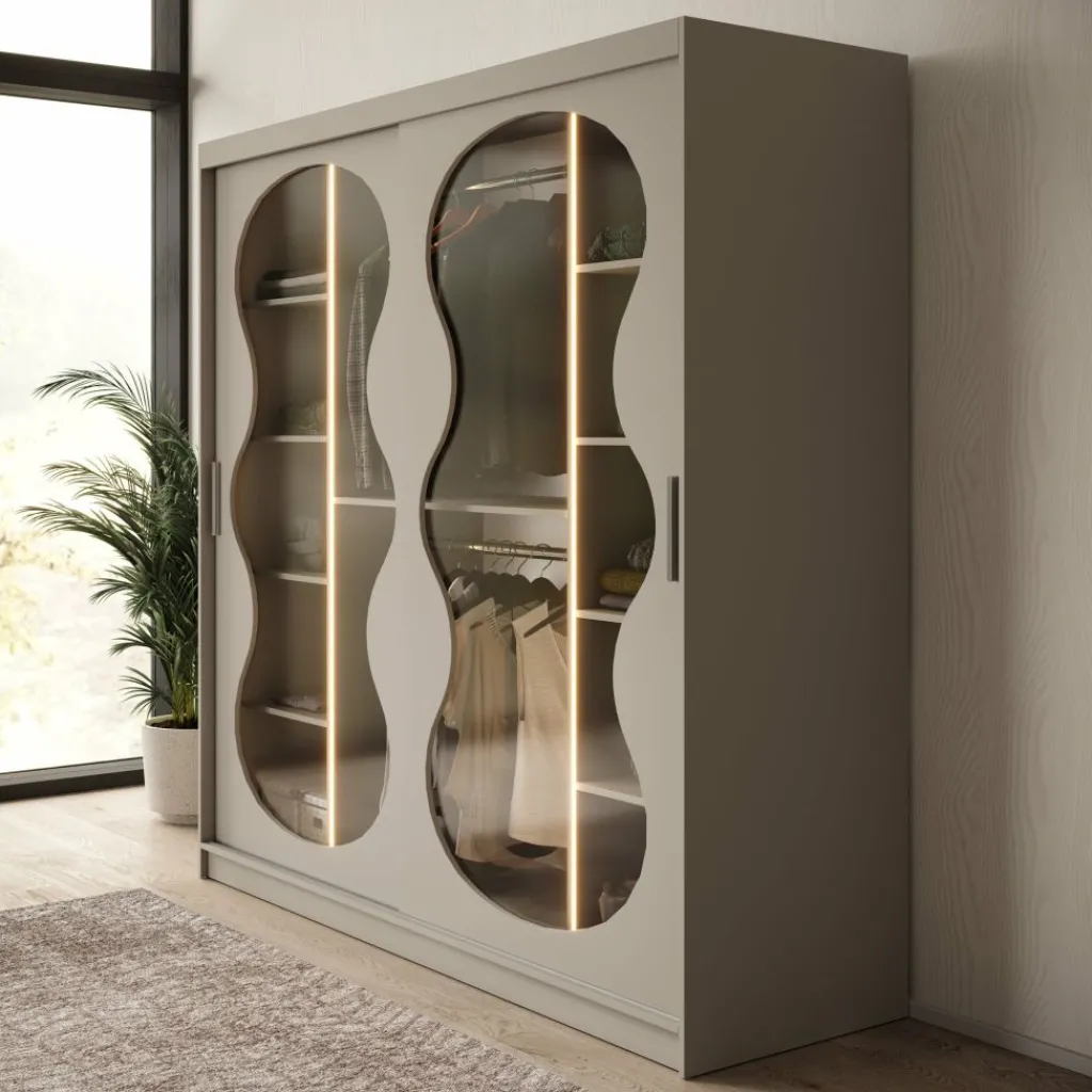 De Bunaro kledingkast in beige is een stijlvolle toevoeging aan iedere slaapkamer. De lichte kleur, gecombineerd met de elegante golvende deuren en geïntegreerde verlichting, zorgt voor een rustige en verfijnde uitstraling. Binnenin biedt de kast volop ruimte met brede planken en een handig hanggedeelte.