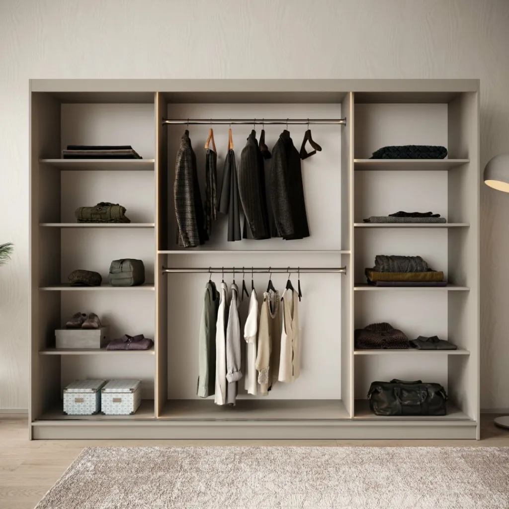Binnenin is de Bunaro overzichtelijk ingedeeld met brede legplanken en meerdere hanggedeeltes, zodat kleding, beddengoed en accessoires eenvoudig kunnen worden opgeborgen. De schuifdeuren lopen soepel over stevige rails, wat het gebruiksgemak vergroot.