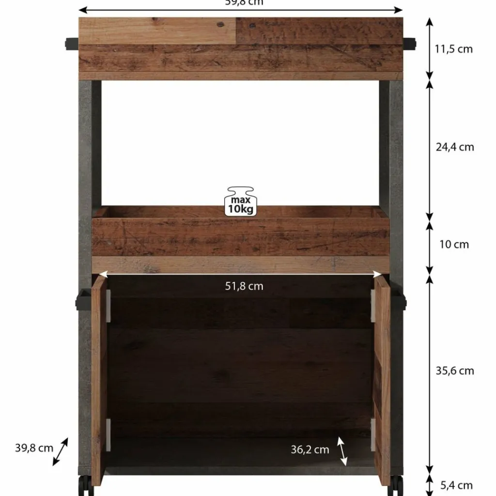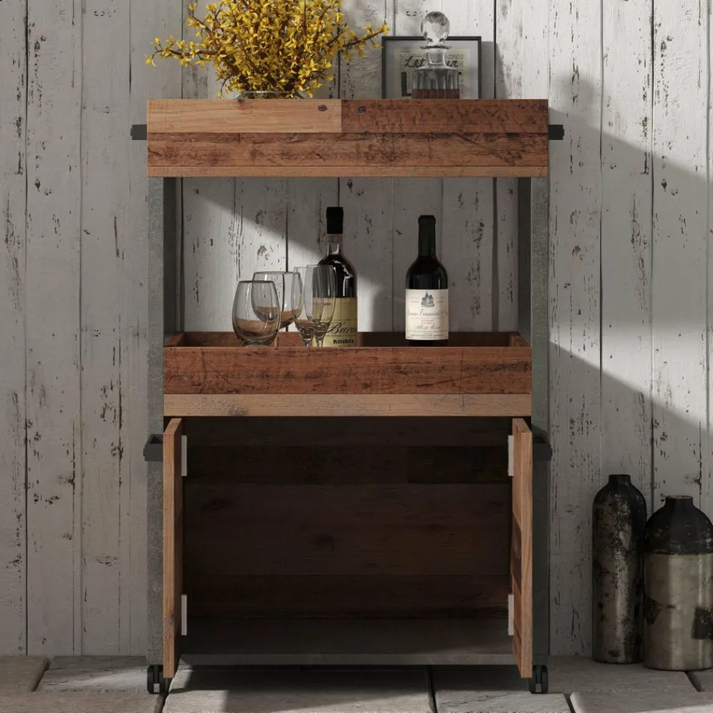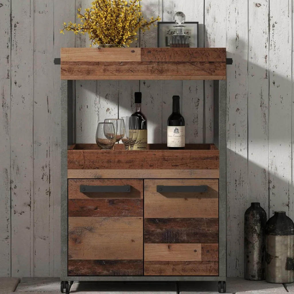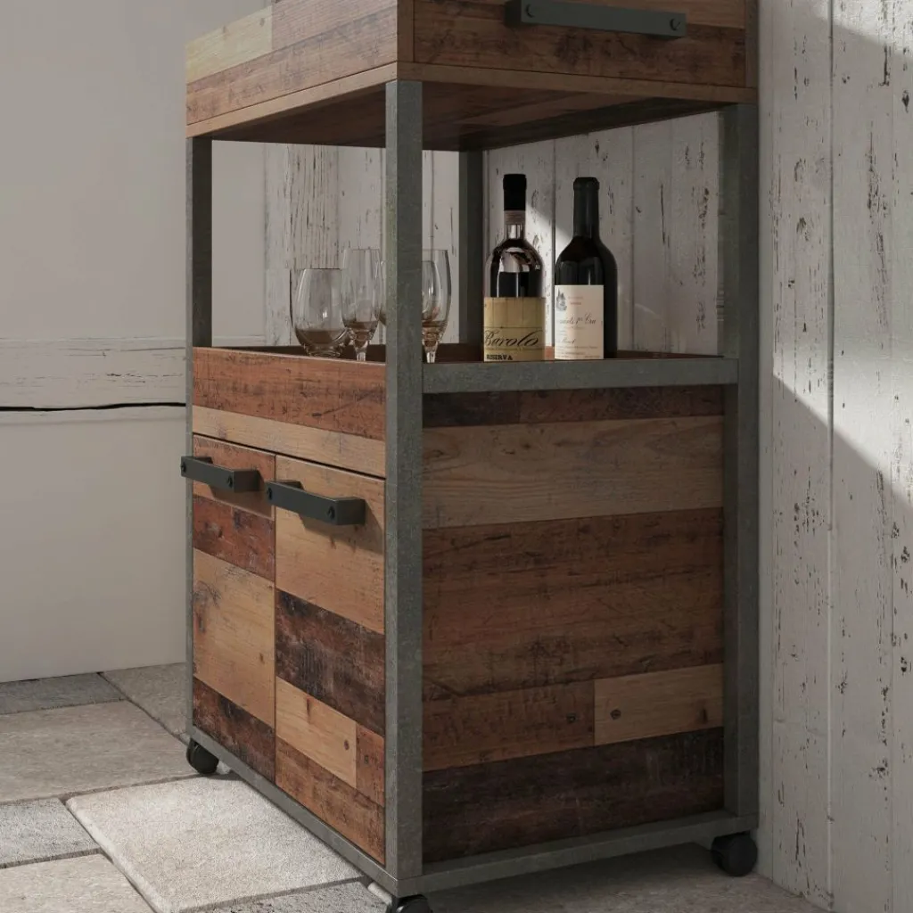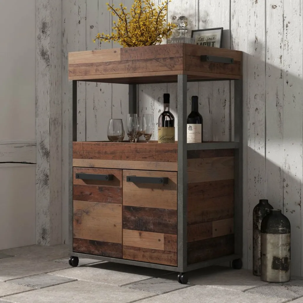 Barkast Cade is een ideaal item voor borrelavondjes! De kast is verrijdbaar op wieltjes en is van alle gemakken voorzien: Zo bevindt zich bovenop een dienblad van 47×38 cm. Aan het dienblad zitten aan beide kanten twee grote brede handgrepen. Daaronder bevindt zich een tweede dienblad. Vervolgens beschikt de barkast over een opbergvak welke af te sluiten is met twee klapdeuren.