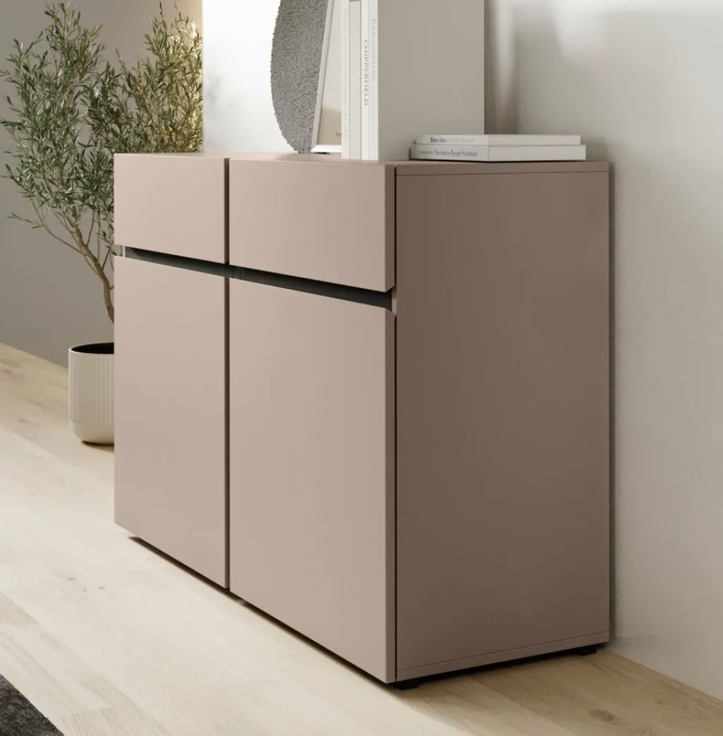 De kast heeft twee deuren met daarachter vier opbergvakken. Daarboven bevinden zich twee lades. De deuren en lades zijn greeploos en vanaf de bovenzijde via een inkeping te openen.