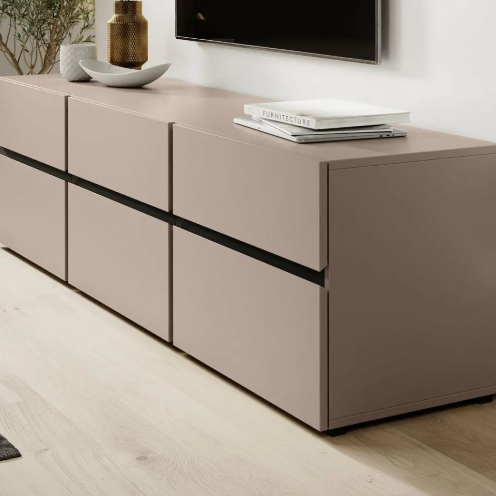 De Cainen heeft 3 kleppen. Daarachter bevinden zich 3 opbergvakken. Hierboven zitten 3 handige opberglades. De lades en kleppen zijn greeploos en via een inkeping te openen. Het tv-meubel staat op lage, zwarte pootjes.
