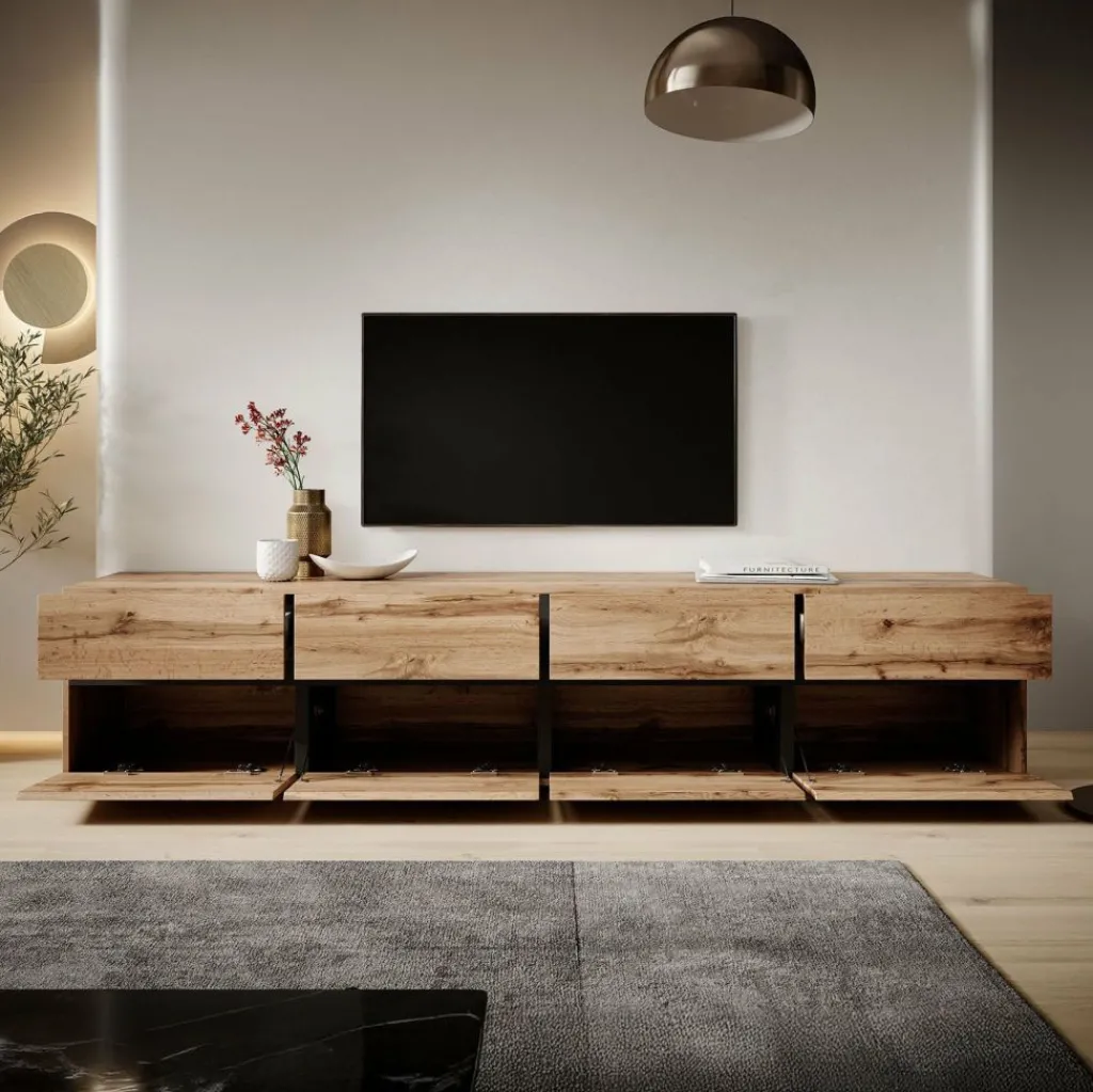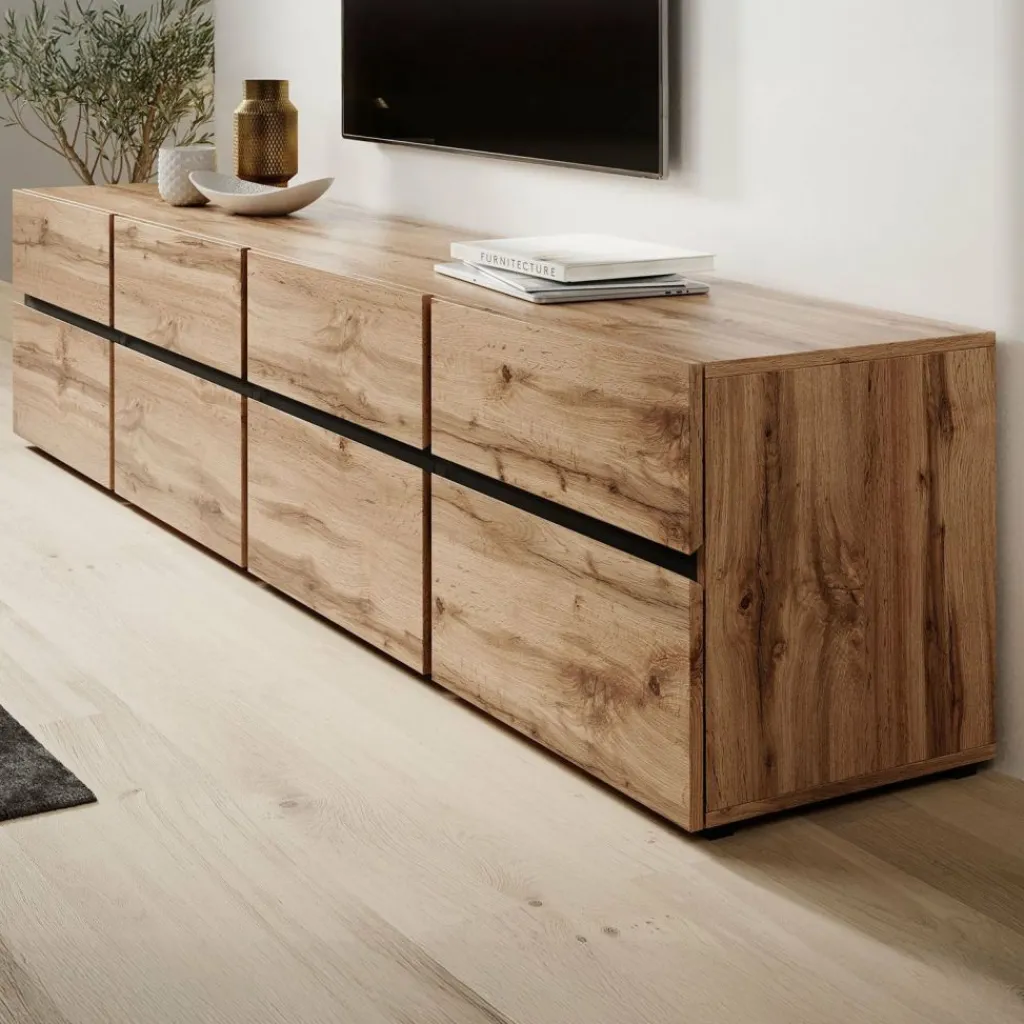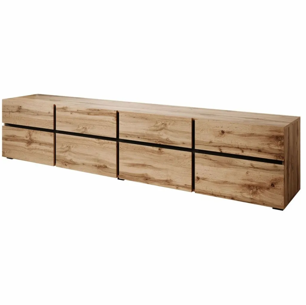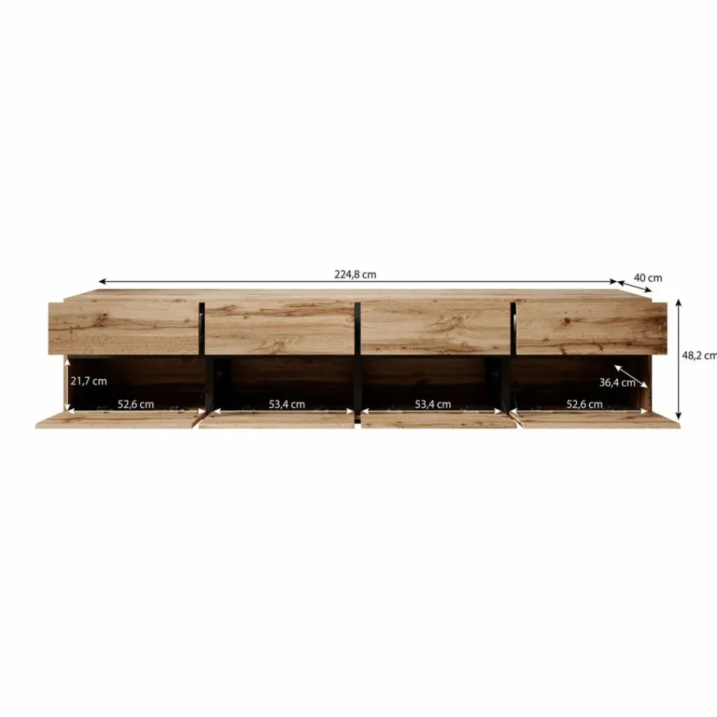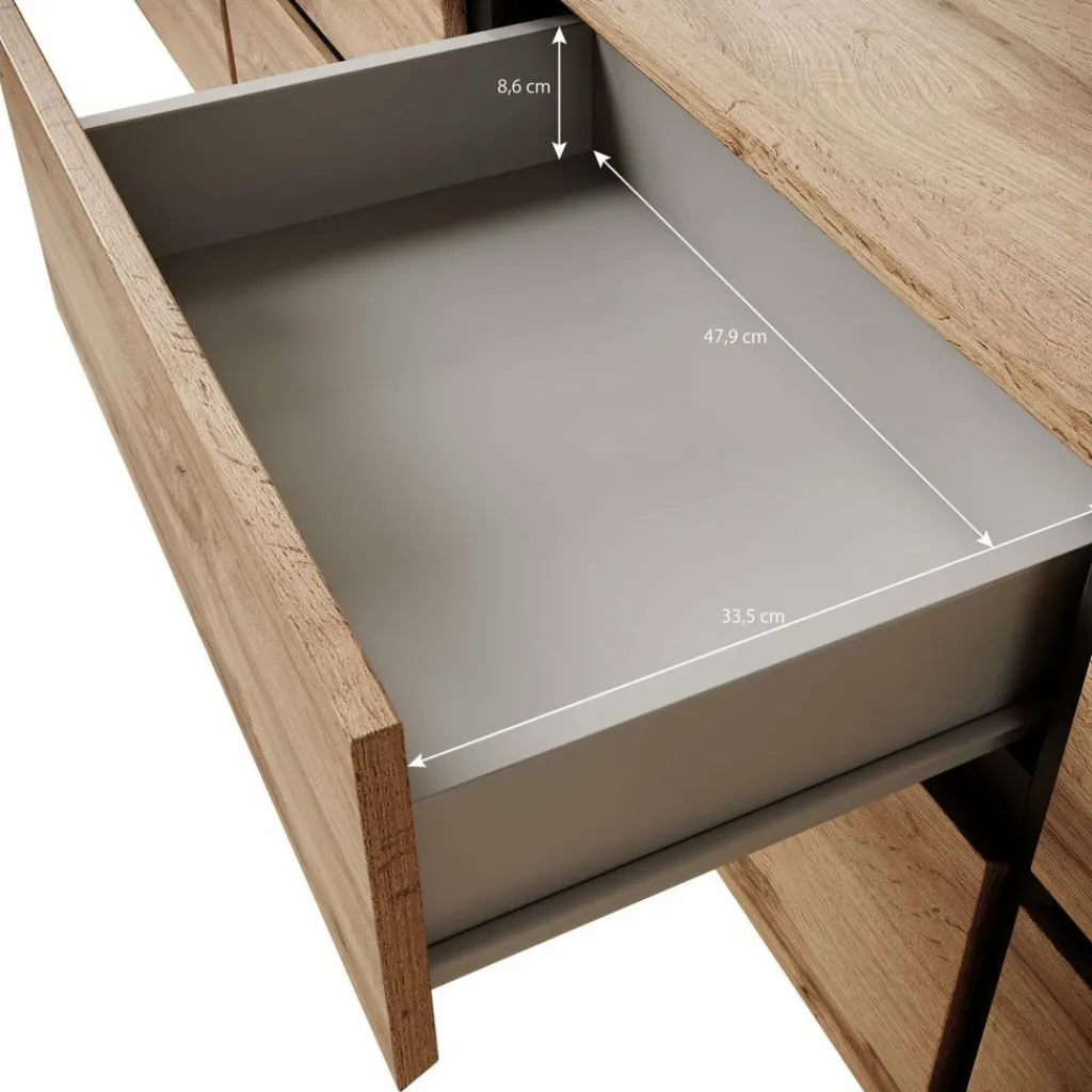 De Cainen heeft 4 kleppen. Daarachter bevinden zich 4 opbergvakken. Hierboven zitten 4 handige opberglades. De lades en kleppen zijn greeploos en via een inkeping te openen. Het tv-meubel staat op lage, zwarte pootjes.