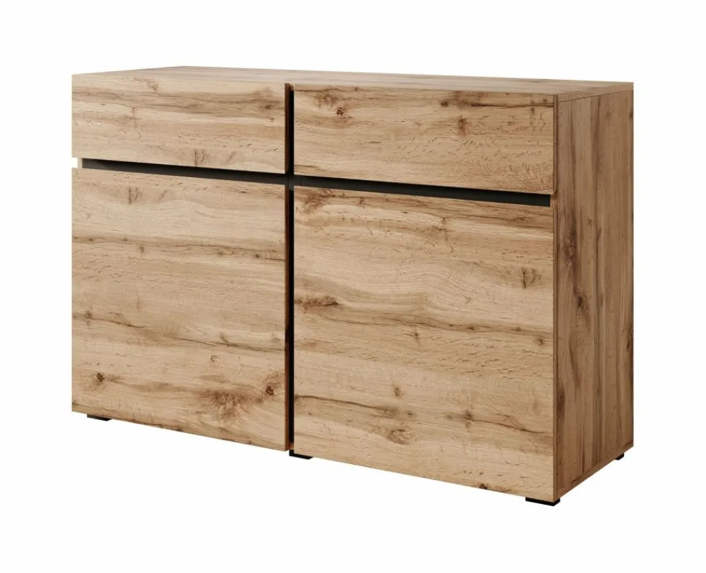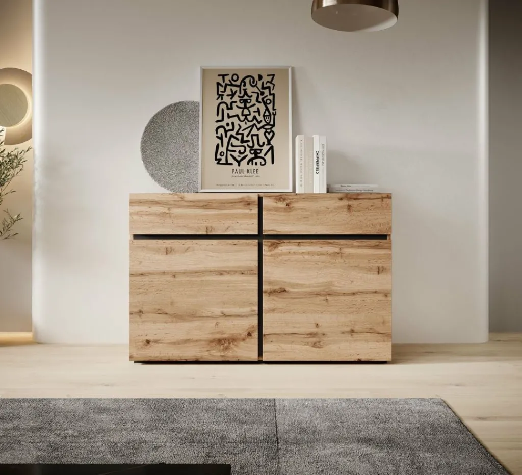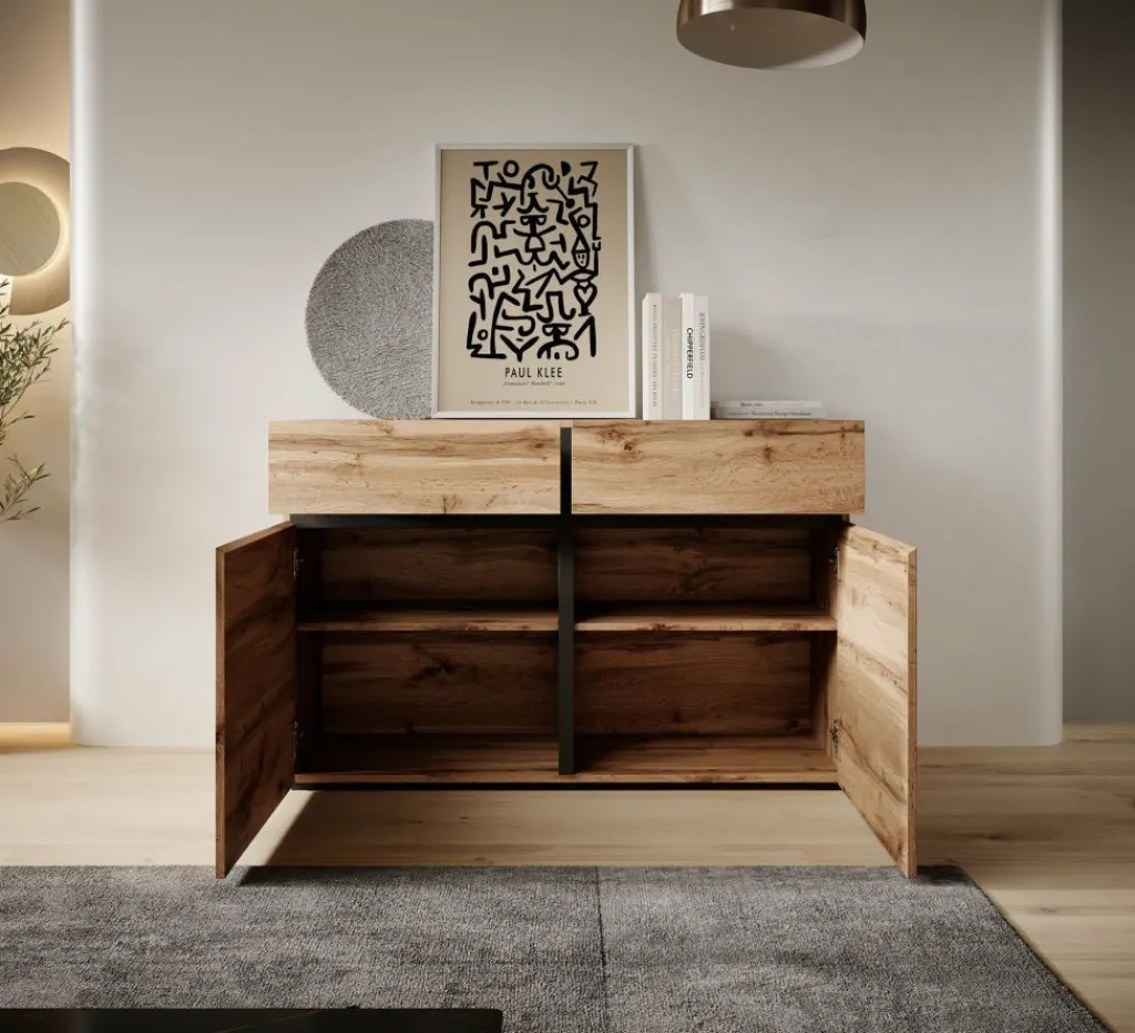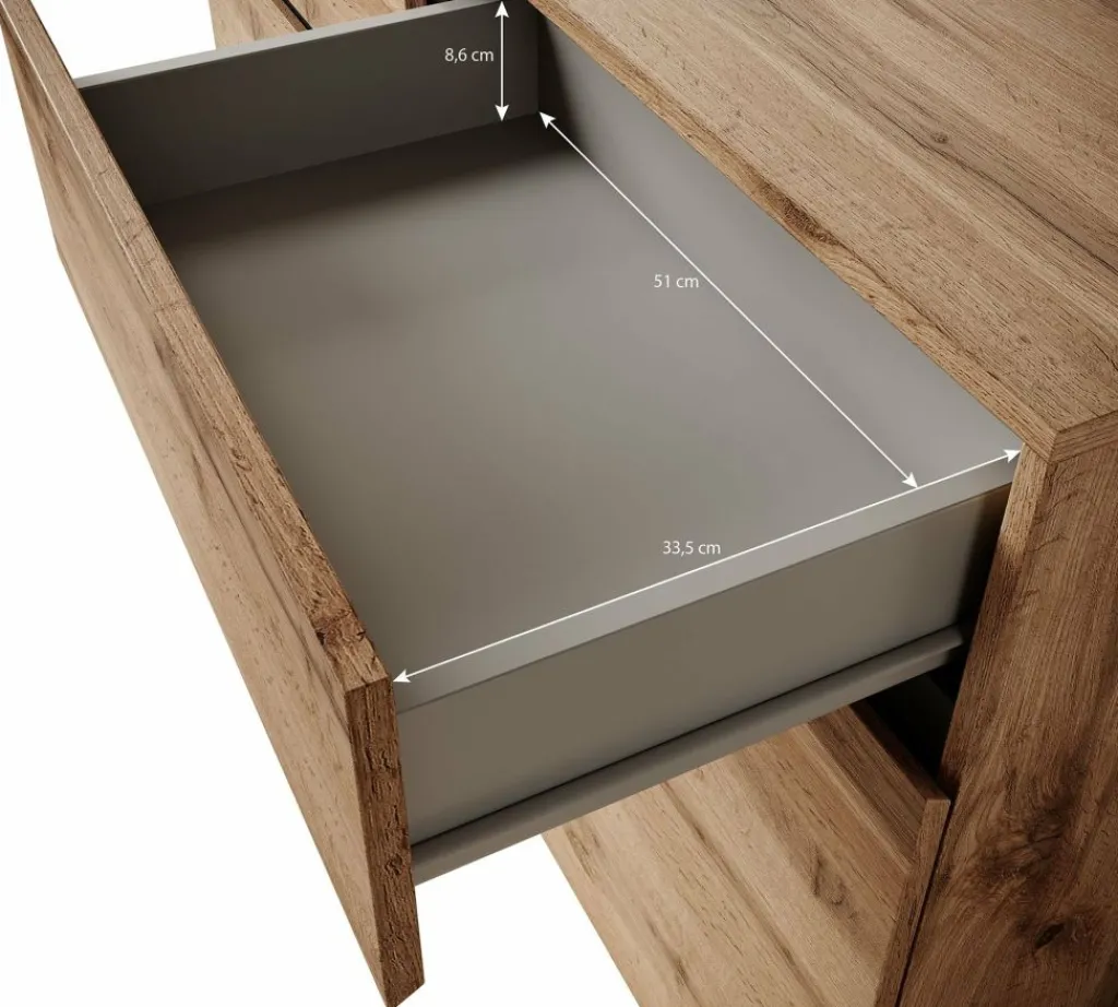 De kast heeft twee deuren met daarachter vier opbergvakken. Daarboven bevinden zich twee lades. De deuren en lades zijn greeploos en vanaf de bovenzijde via een inkeping te openen.