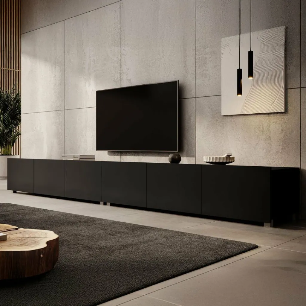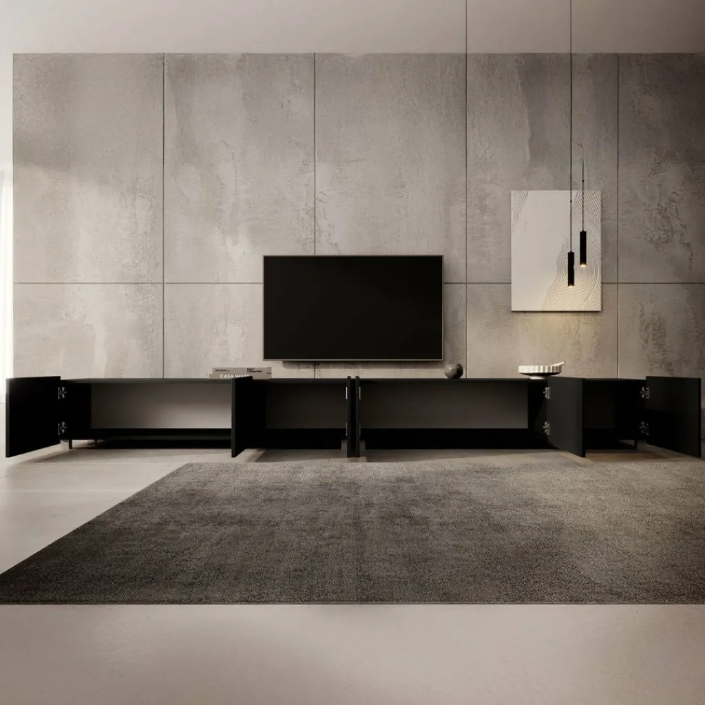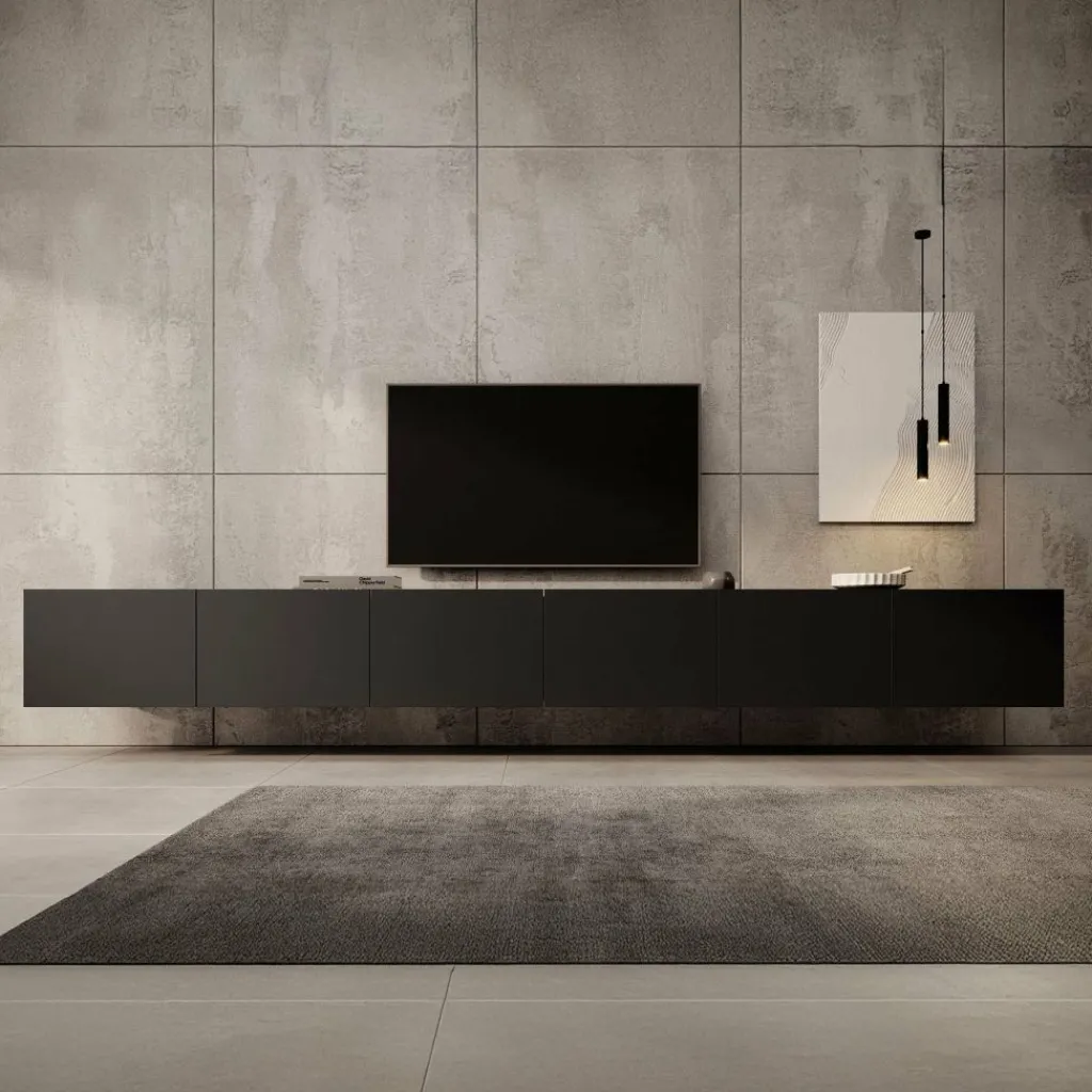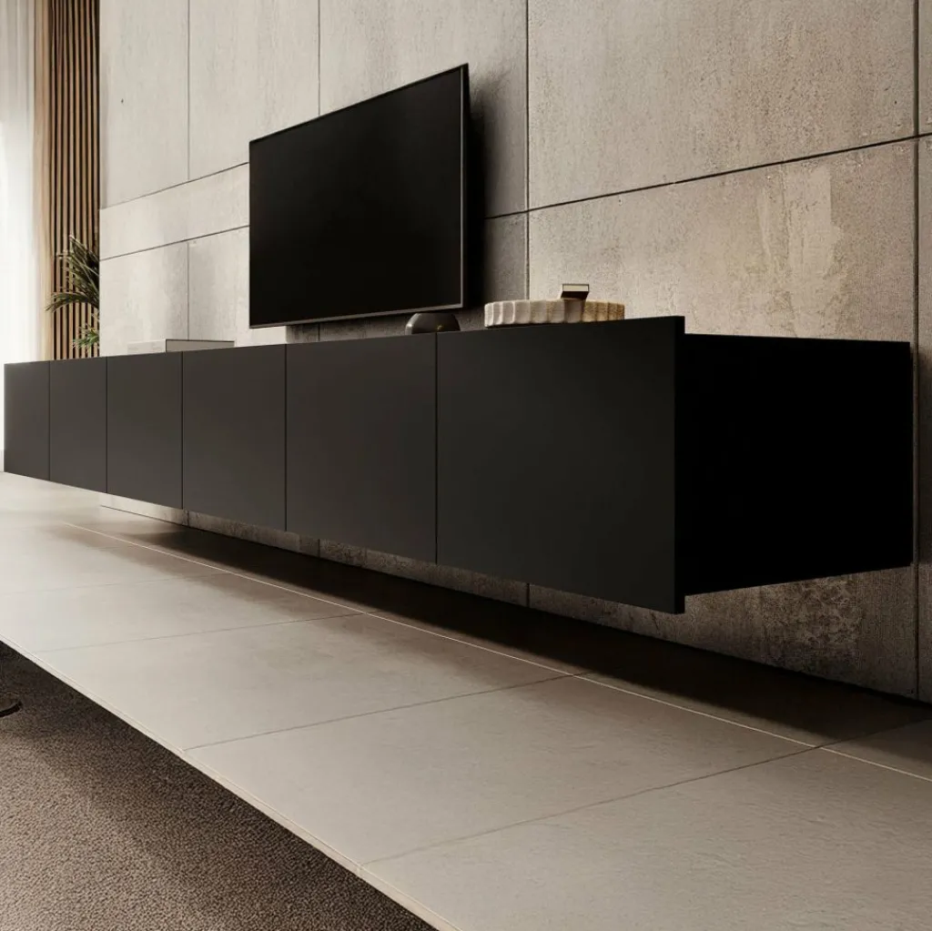 Het tv-meubel Calabas is aan de muur op te hangen. Toch liever een staand model? Dat kan ook, door eenvoudig de bijgeleverde pootjes te monteren onder het meubel. De pootjes zijn zilverkleurig, gemaakt van kunststof en hebben een hoogte van 5 cm.