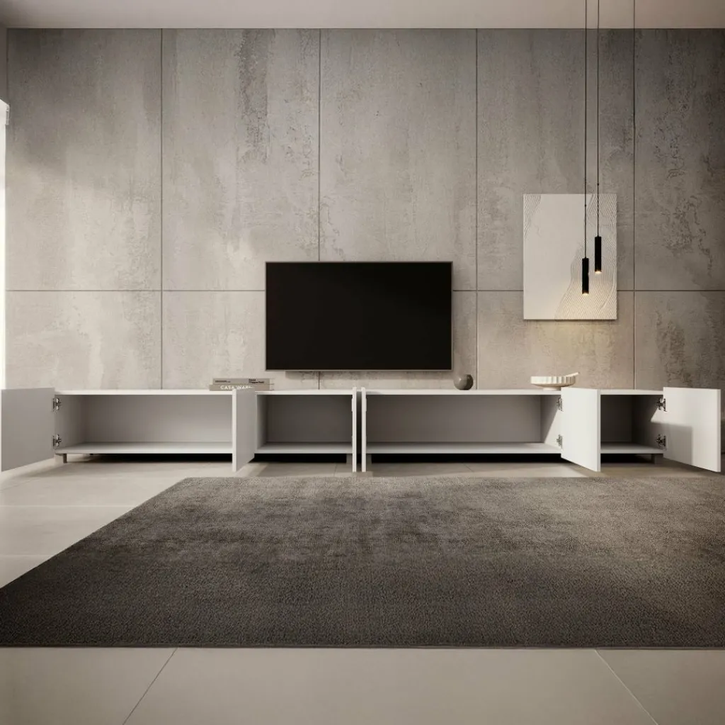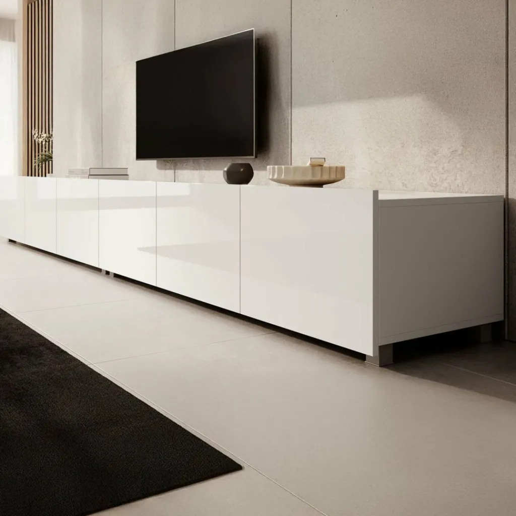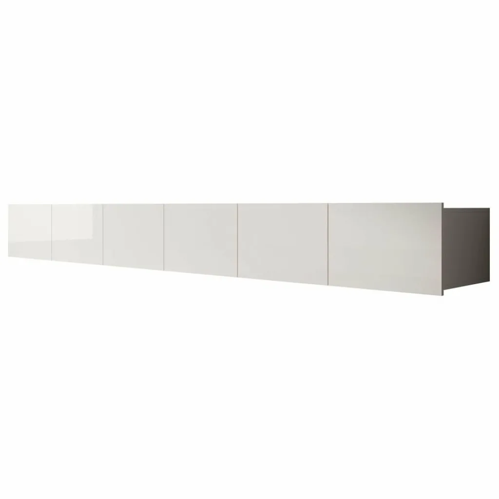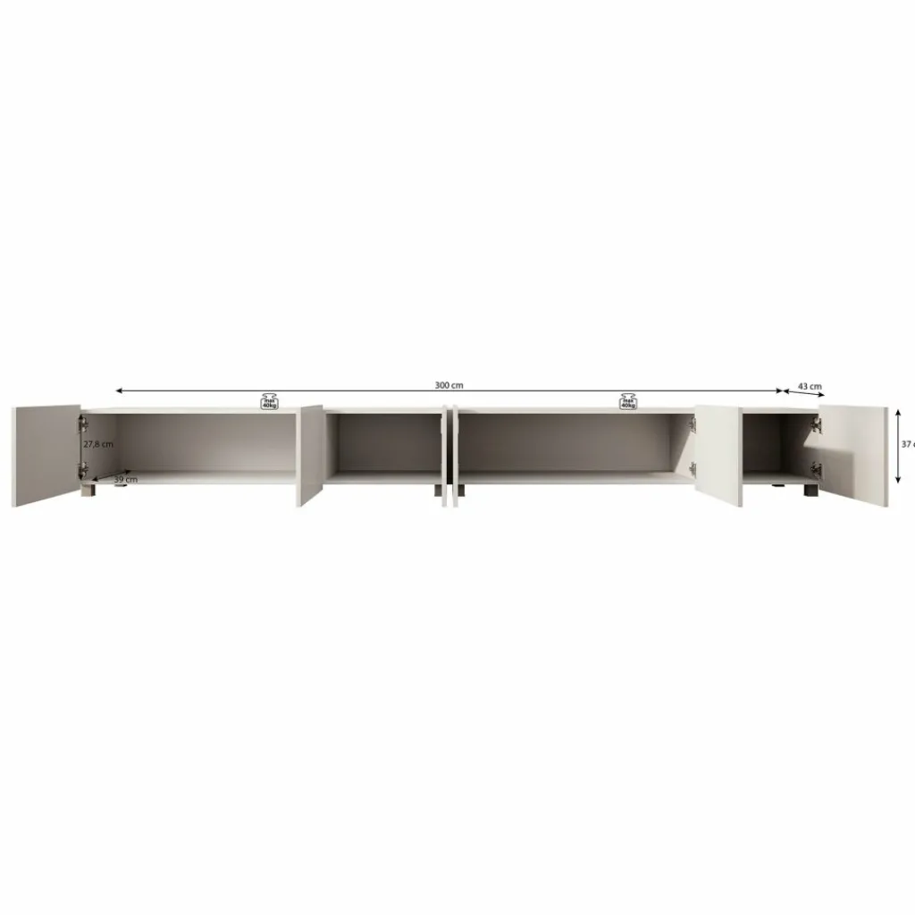 TV-Meubel Calabas is een opbergkast voor onder de tv in moderne stijl. De Calabas is gemaakt van een stevige spaanplaat constructie in een witte kleur. Het model beschikt over 6 deuren met daarachter 6 opbergvakken. De deuren zijn greeploos en via de boven- of onderkant te openen. De deuren hebben een hoogglans voorkant. Dit meubel bestaat uit 2 delen van 150 cm breed.