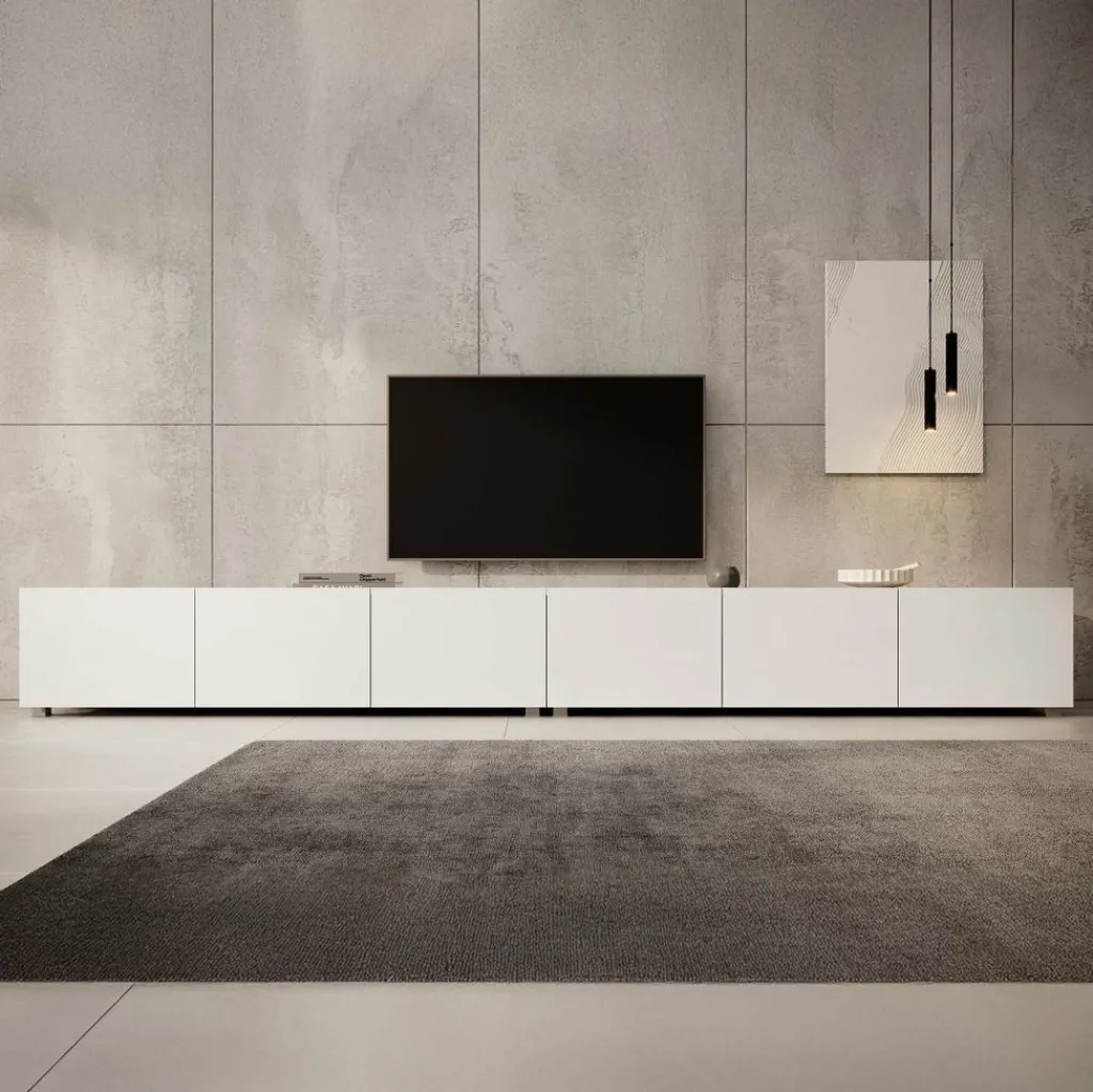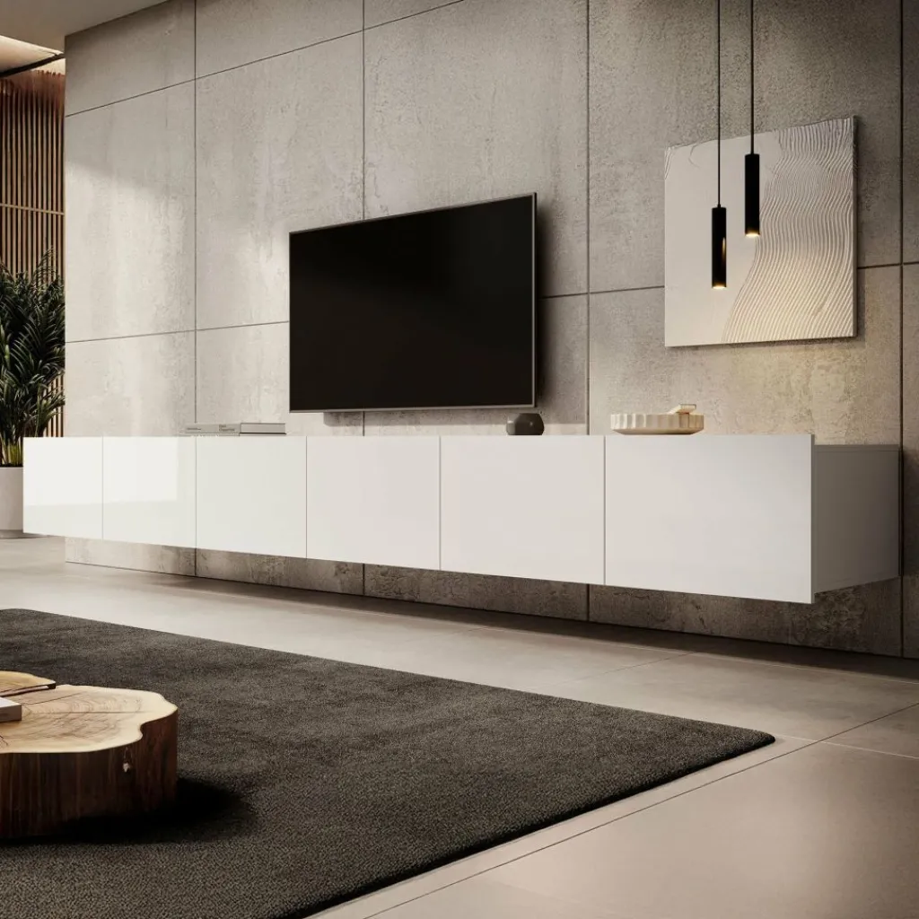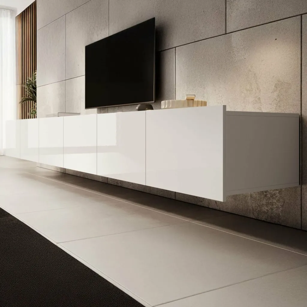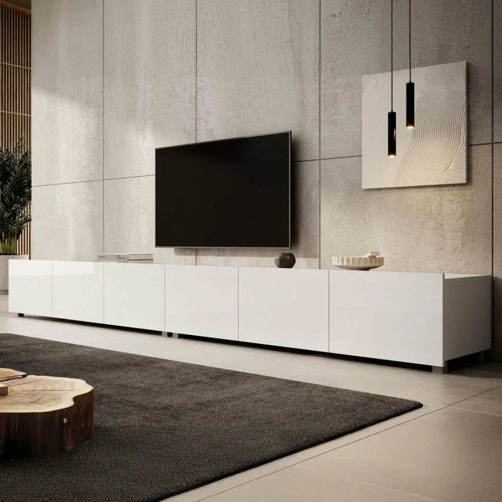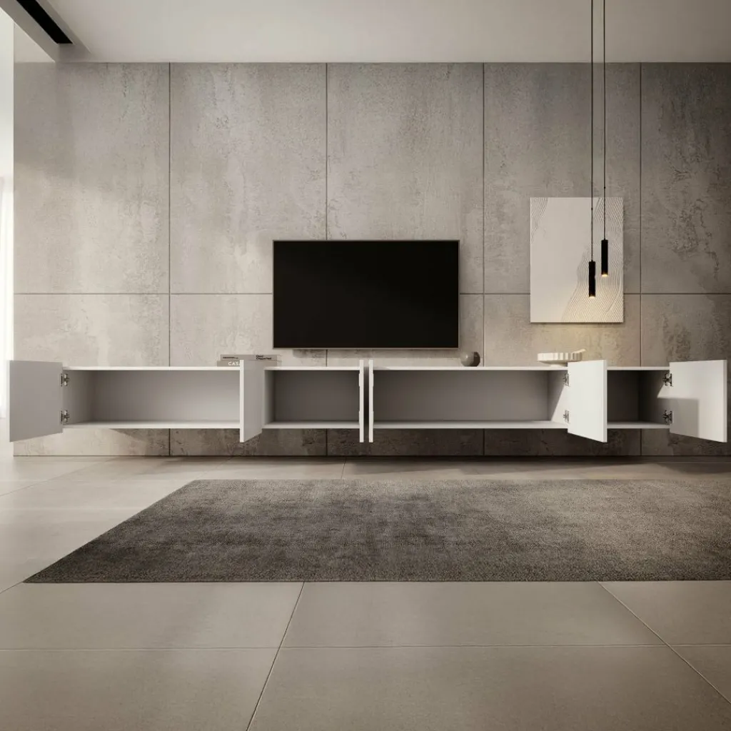TV-Meubel Calabas is een opbergkast voor onder de tv in moderne stijl. De Calabas is gemaakt van een stevige spaanplaat constructie in een witte kleur. Het model beschikt over 6 deuren met daarachter 6 opbergvakken. De deuren zijn greeploos en via de boven- of onderkant te openen. De deuren hebben een hoogglans voorkant. Dit meubel bestaat uit 2 delen van 150 cm breed.