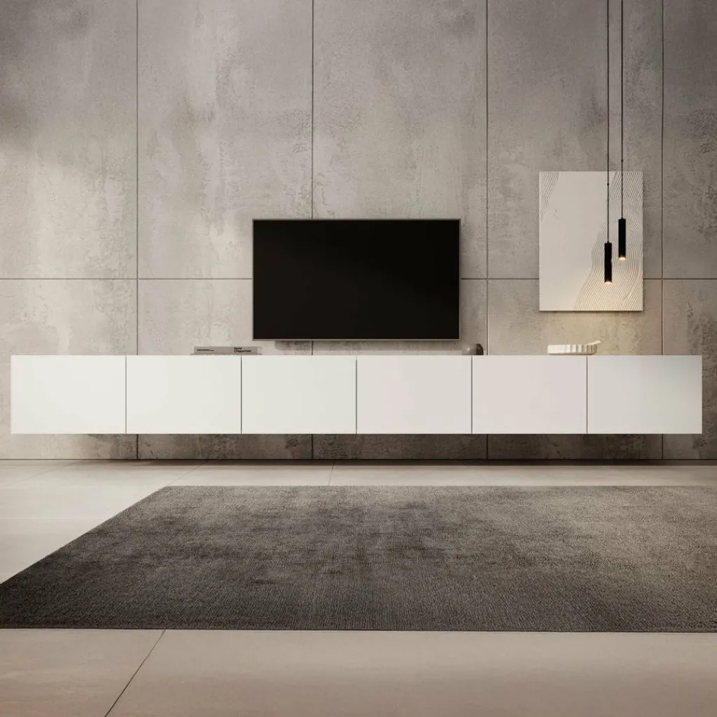 Het tv-meubel Calabas is aan de muur op te hangen. Toch liever een staand model? Dat kan ook, door eenvoudig de bijgeleverde pootjes te monteren onder het meubel. De pootjes zijn zilverkleurig, gemaakt van kunststof en hebben een hoogte van 5 cm.