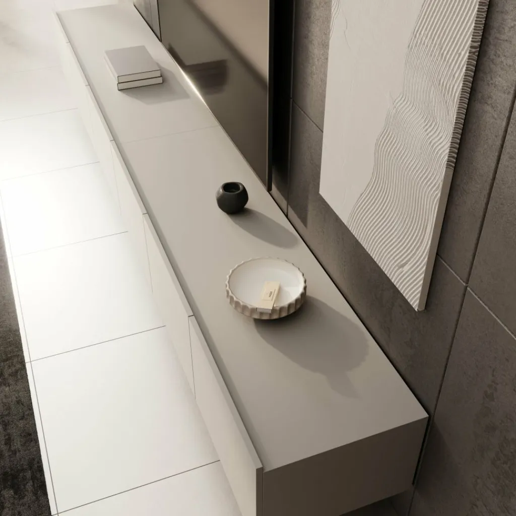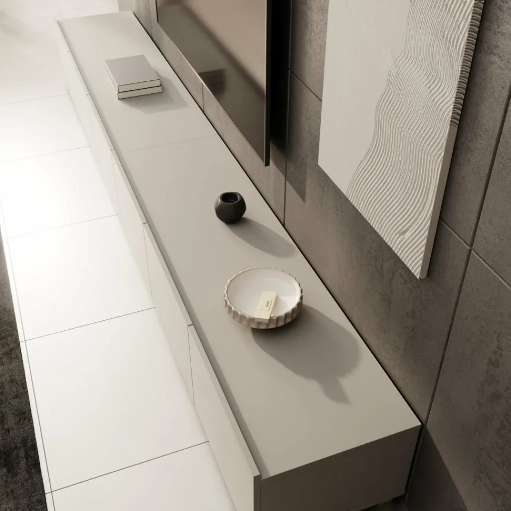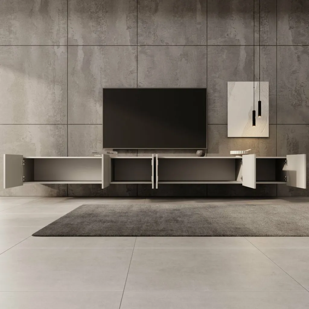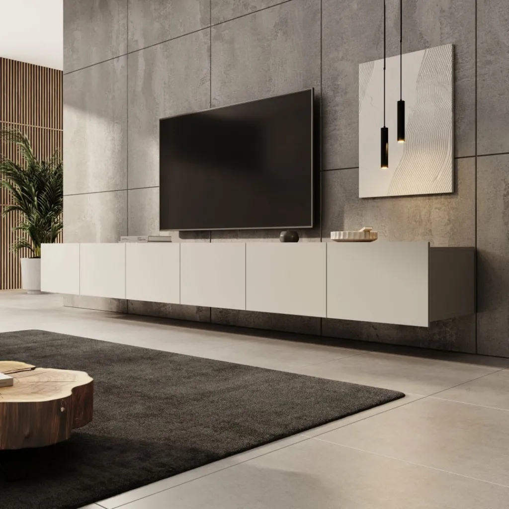 Het tv-meubel is bedoeld om aan de muur te hangen, waardoor de vloer vrij blijft en de opstelling ruimtelijk oogt. Wie het meubel liever staand gebruikt, kan de bijgeleverde pootjes eenvoudig monteren. Deze pootjes zijn zilverkleurig, gemaakt van kunststof en hebben een hoogte van 5 cm. Dankzij de zes opbergvakken is er volop ruimte om apparatuur en accessoires netjes uit het zicht op te bergen.