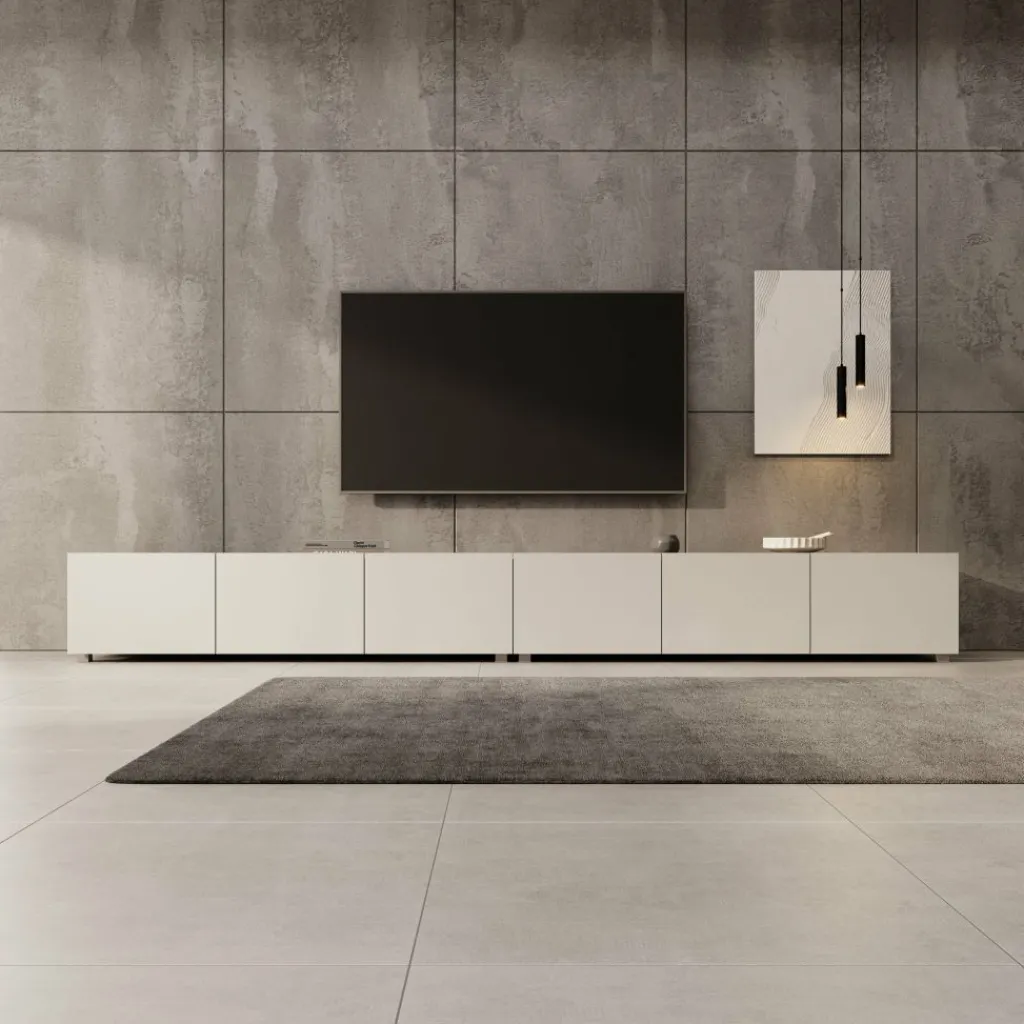TV-Meubel Calabas is een opbergkast voor onder de tv in moderne stijl. De Calabas is gemaakt van een stevige spaanplaatconstructie in een beige kleur. Het model beschikt over 6 greeploze deuren met daarachter 6 afzonderlijke opbergvakken. De deuren zijn via de boven- of onderkant te openen en houden het front strak en rustig. Dit meubel bestaat uit 2 delen van elk 150 cm breed.