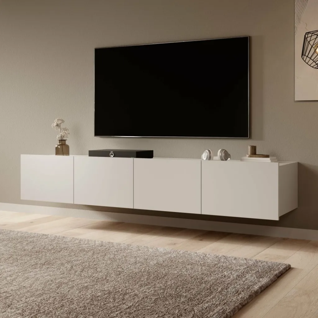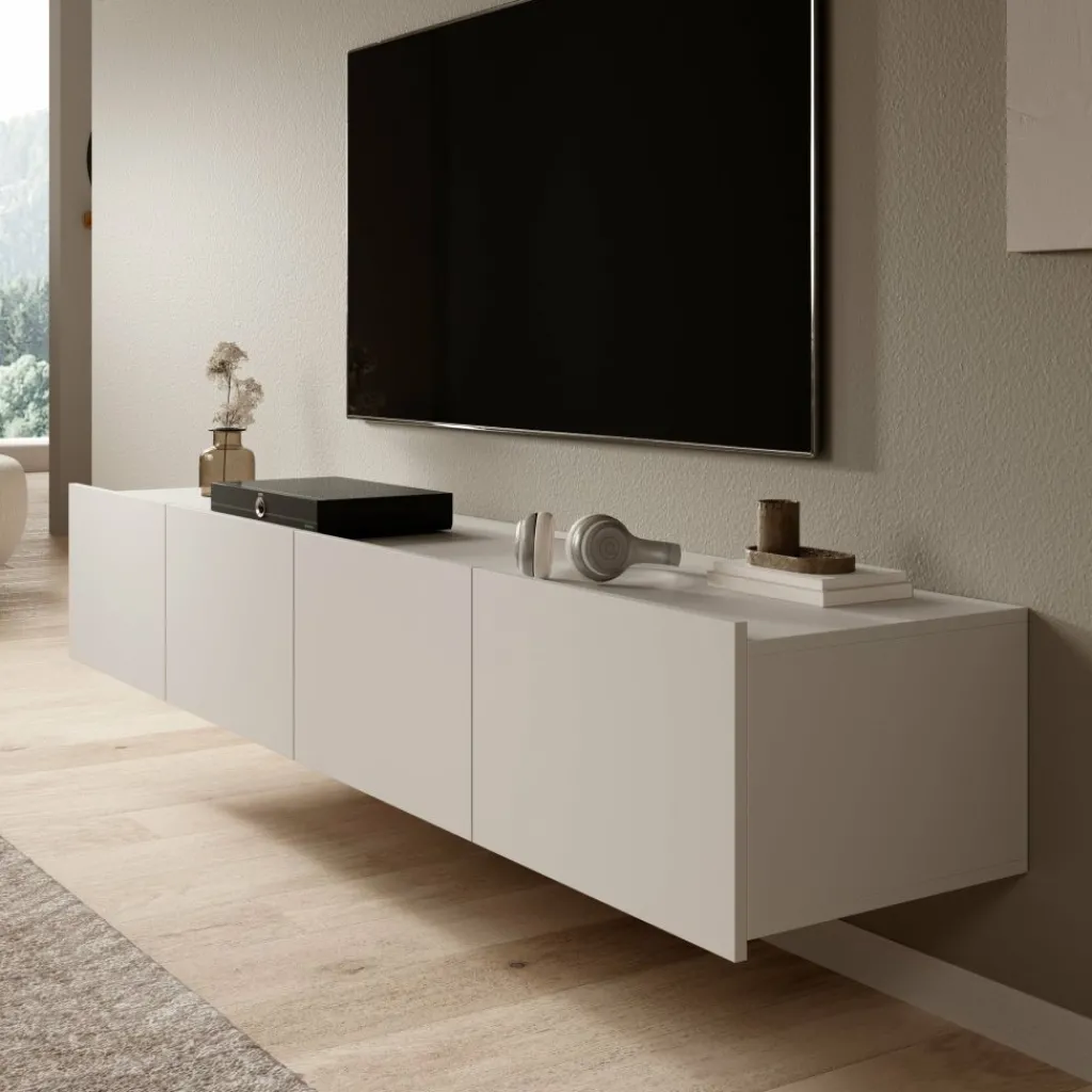 Het tv-meubel is afgewerkt in een warme beige kleur en uitgevoerd zonder handgrepen, wat zorgt voor een rustige en greeploze look.