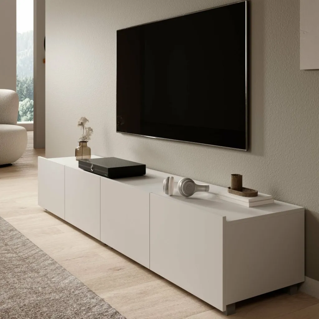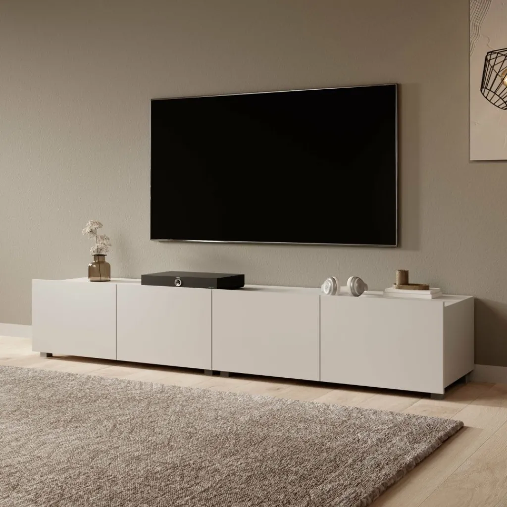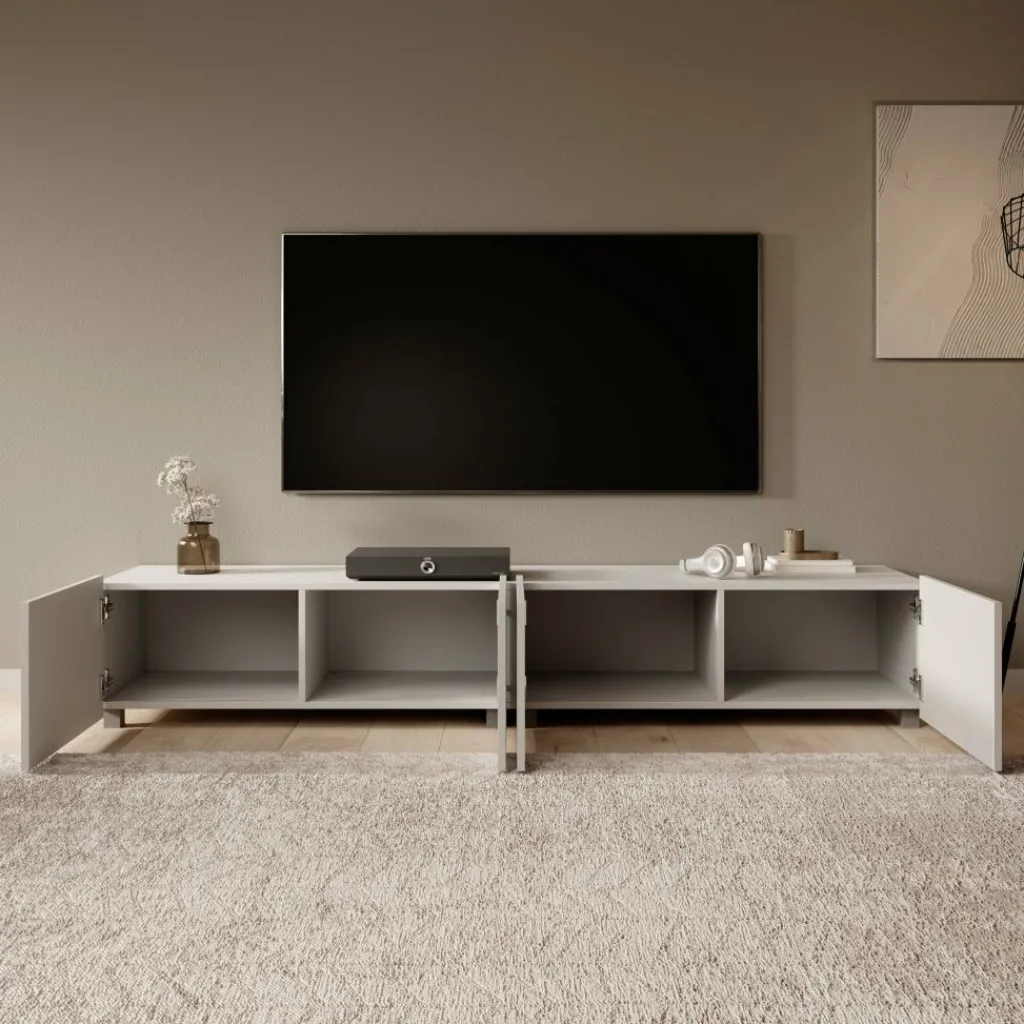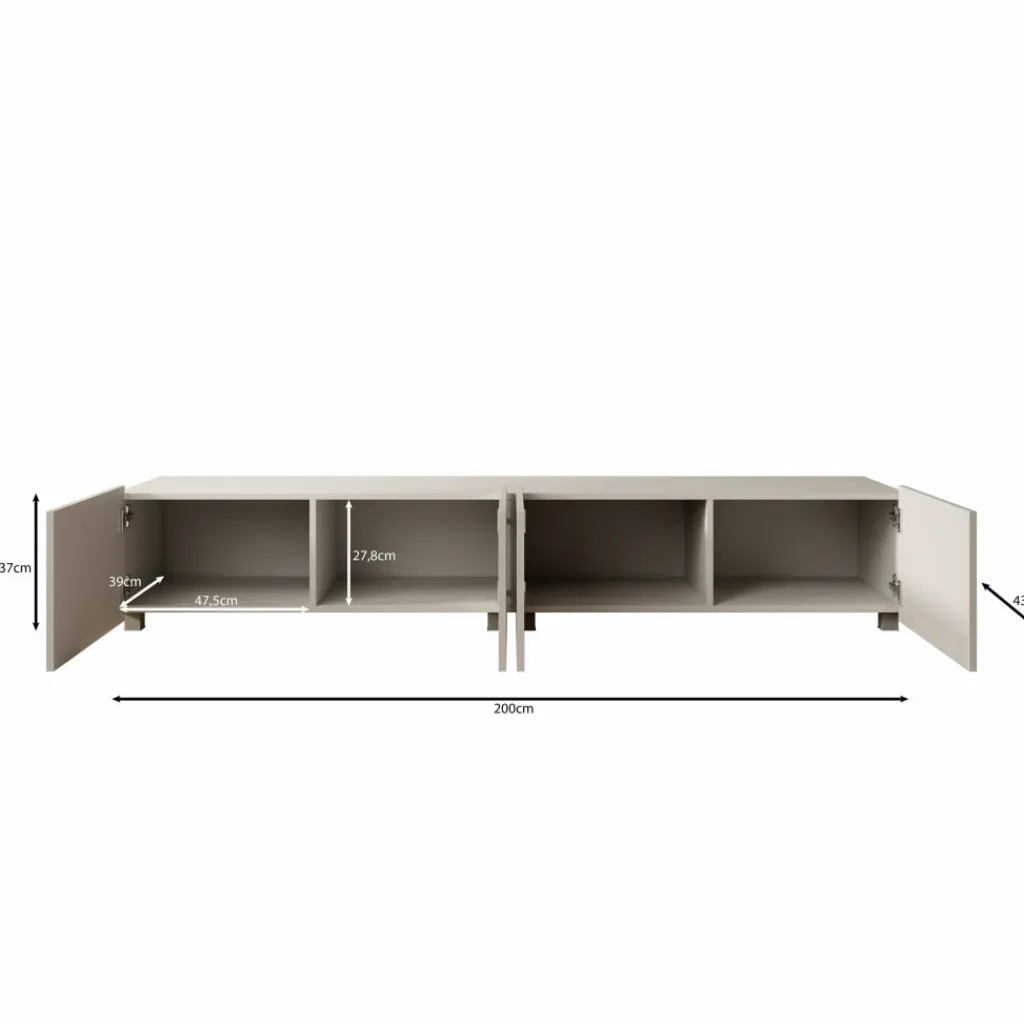 TV-meubel Calgary heeft een strak ontwerp en biedt praktische opbergruimte. De kast is 200 cm breed en bestaat uit twee kasten van elk 100 cm breed die samen één geheel vormen. Het meubel is uitgerust met vier deuren, met daarachter royale opbergruimtes voor apparatuur, kabels en accessoires.