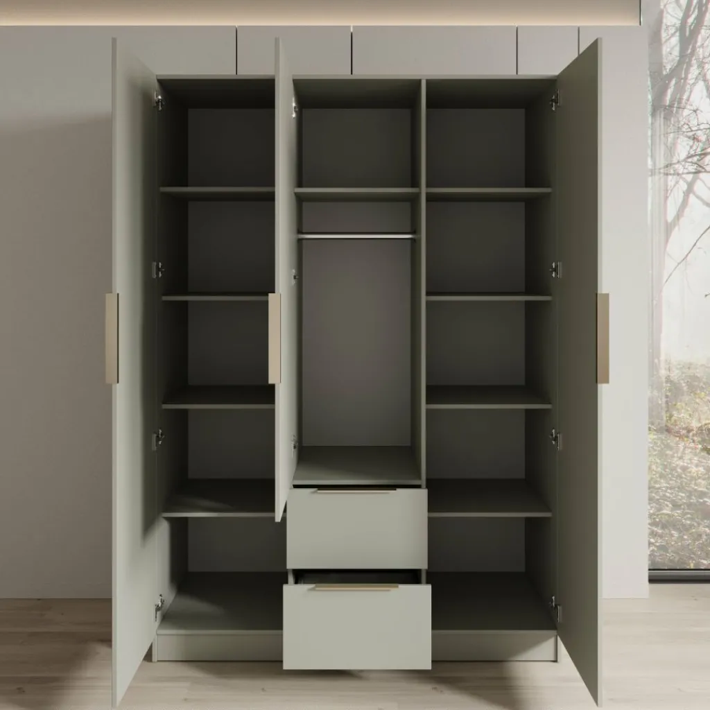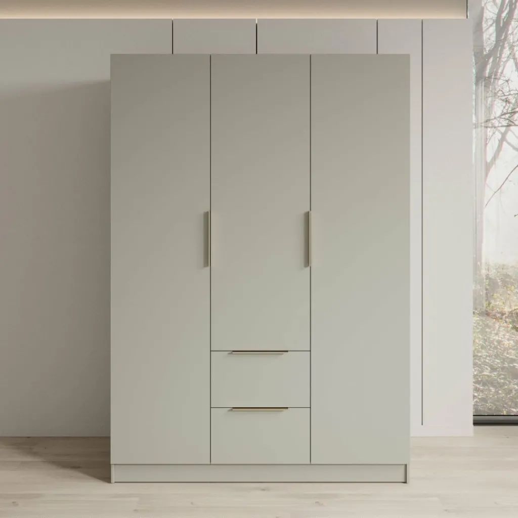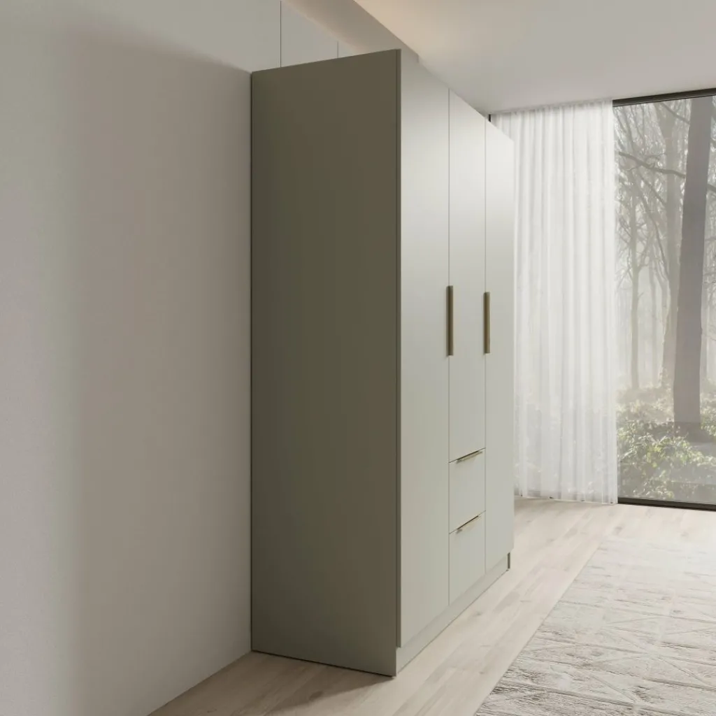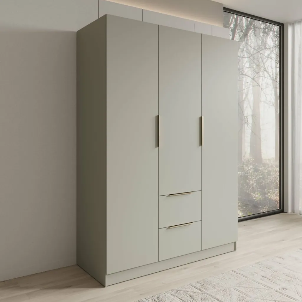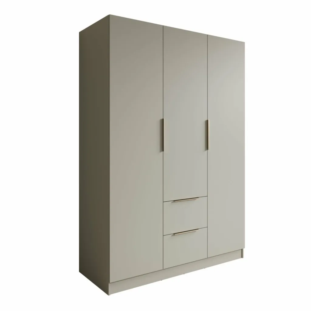 De deuren en lades zijn uitgerust met rechte handgrepen die passen bij het strakke uiterlijk van de kast. De kast staat op een doorlopende plint, waardoor hij stabiel op de vloer staat en eenvoudig te plaatsen is tegen een wand. Dankzij de neutrale beige kleur laat de Caliero kledingkast zich makkelijk combineren met verschillende interieurstijlen en andere meubels in de slaapkamer.