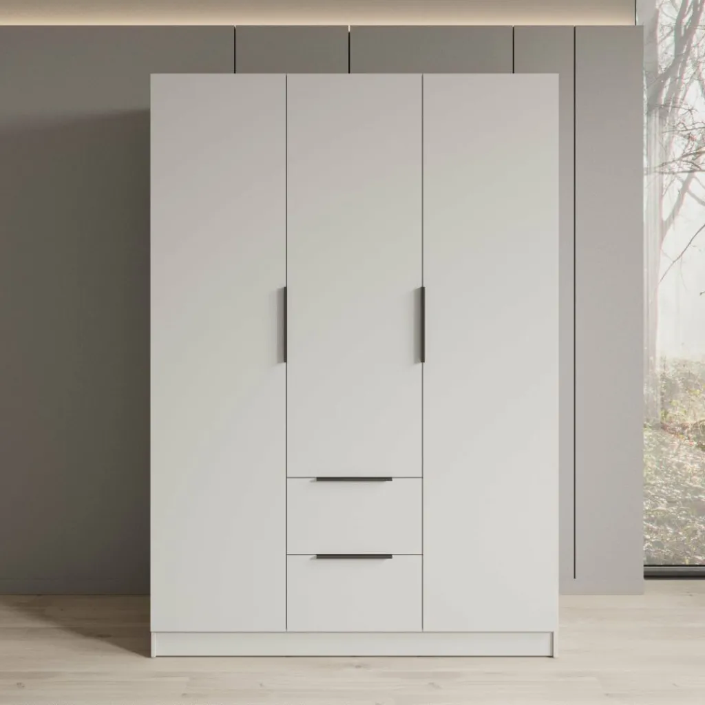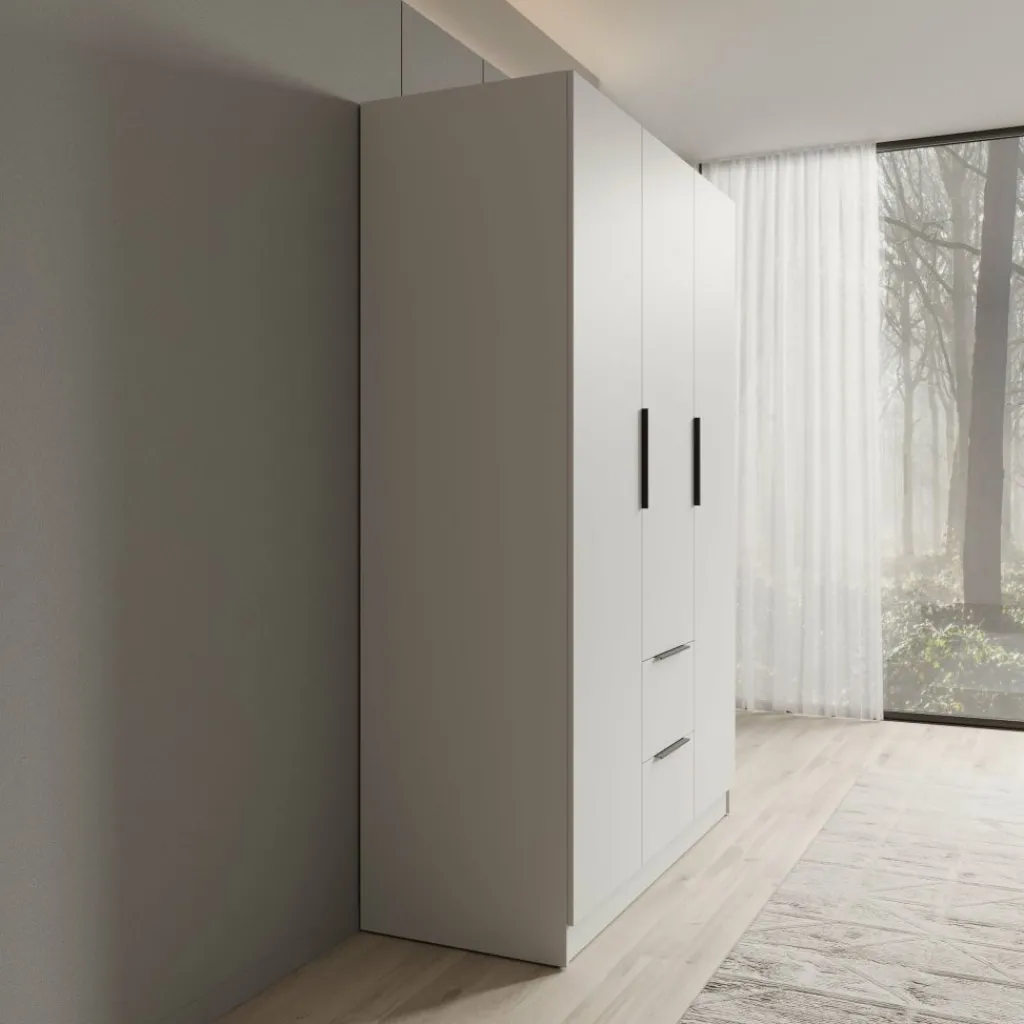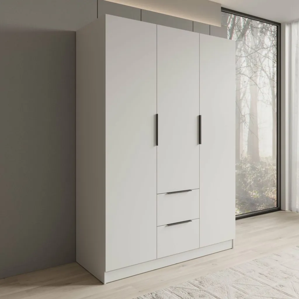 De deuren en lades zijn voorzien van rechte, metalen handgrepen die aansluiten bij het strakke ontwerp van de kast. De kast staat op een doorlopende plint, waardoor hij stabiel op de vloer staat en eenvoudig tegen een wand te plaatsen is. Dankzij de witte kleur laat de Caliero kledingkast zich makkelijk combineren met verschillende slaapkamerinterieurs en andere meubels.