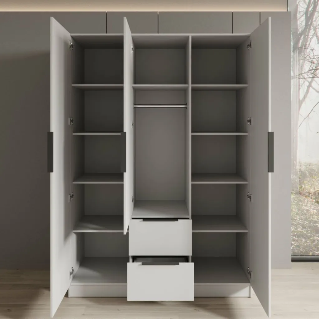 Caliero kledingkast is een staande kast met drie draaideuren en twee lades, uitgevoerd in een witte afwerking. Met een afmeting van 150x60x216 cm biedt deze kast een overzichtelijke indeling voor het opbergen van kleding en accessoires.