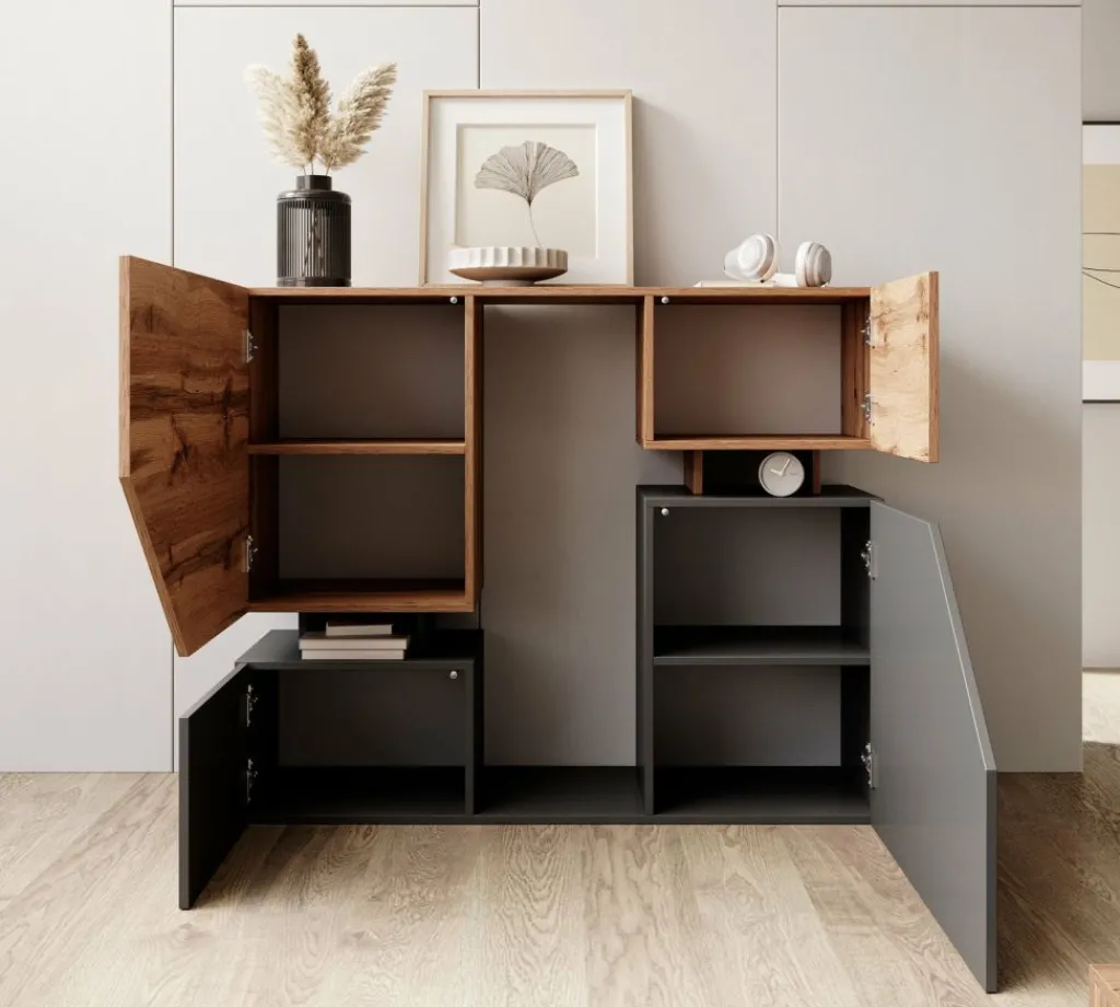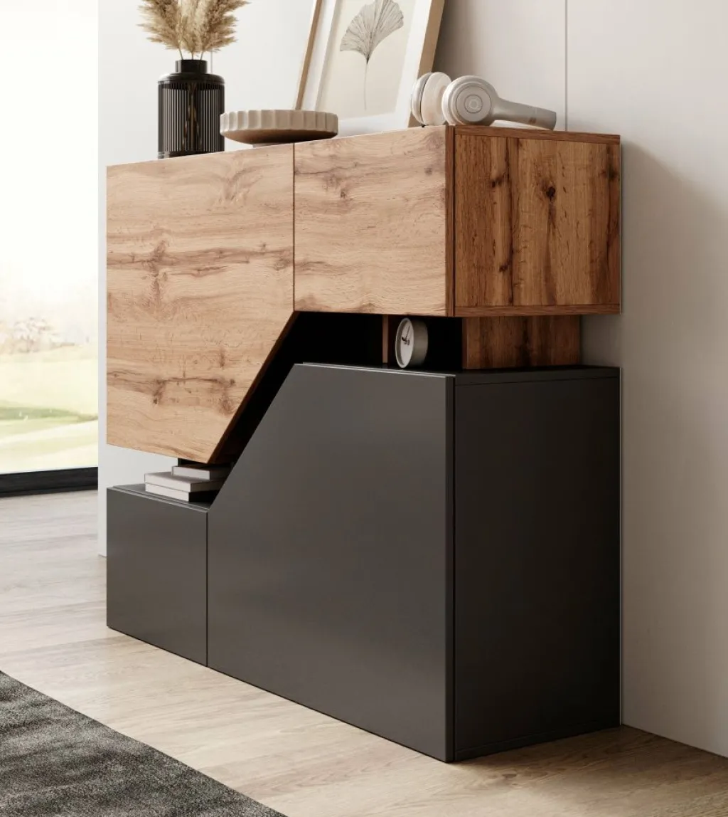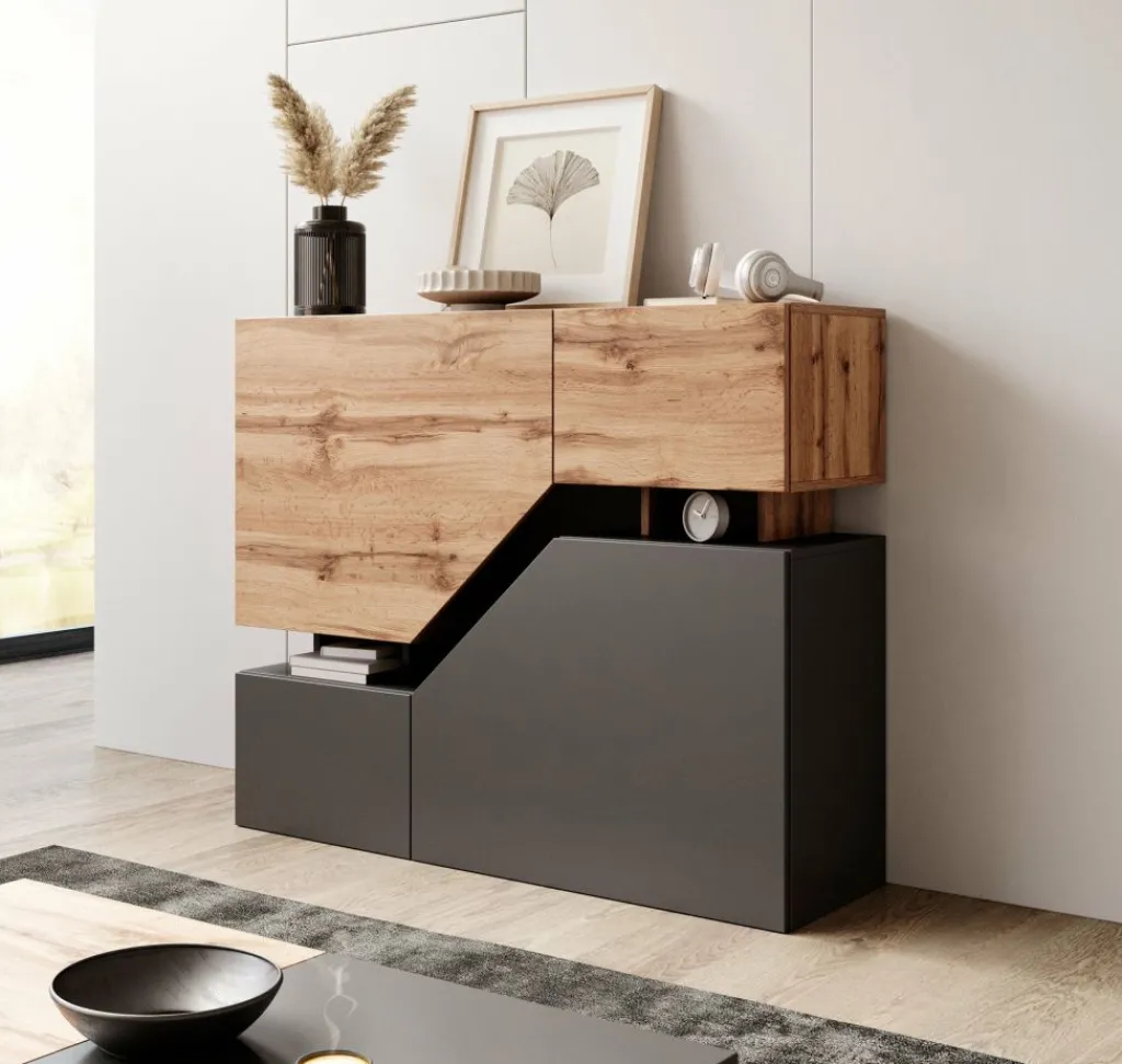 Dressoir Canberra is een opbergkast van 120 cm breed. De Canberra beschikt over 4 deuren en enkele open vakken in het midden. De kast is uitgevoerd in de kleuren antraciet met eiken.
