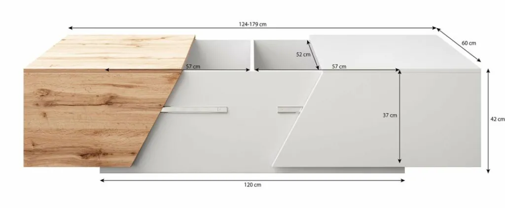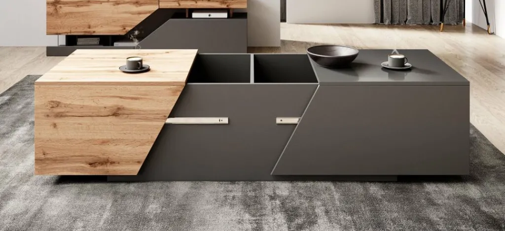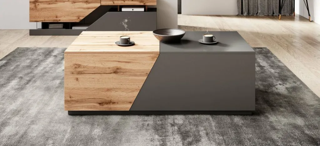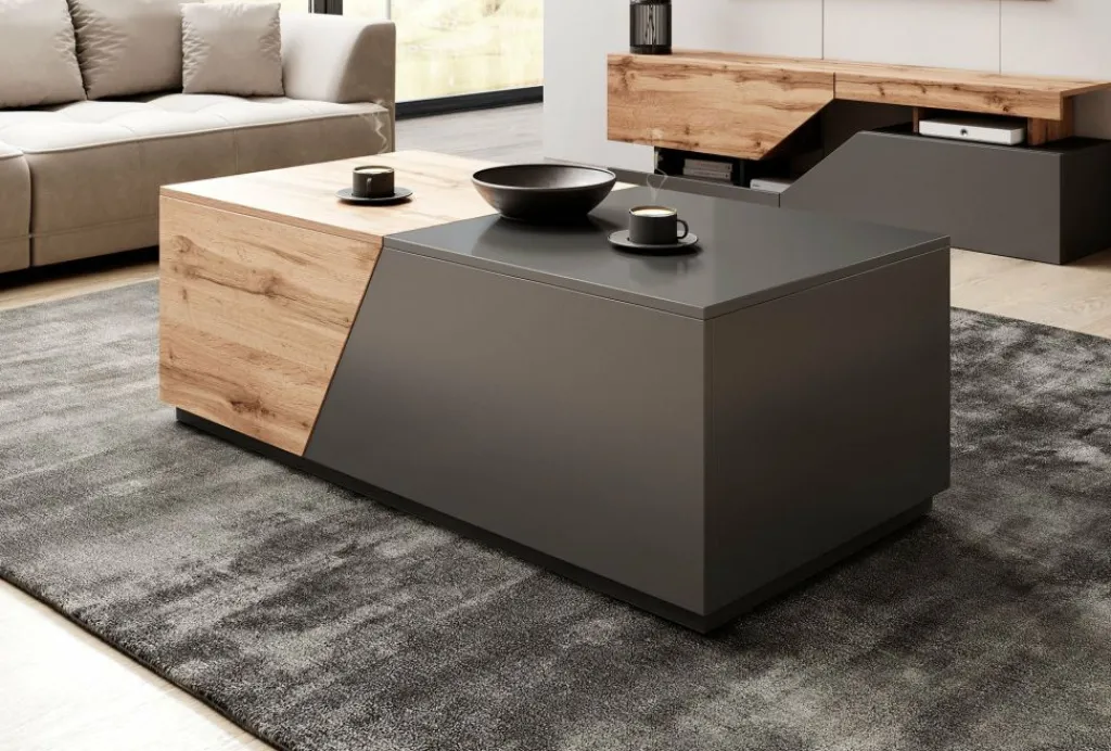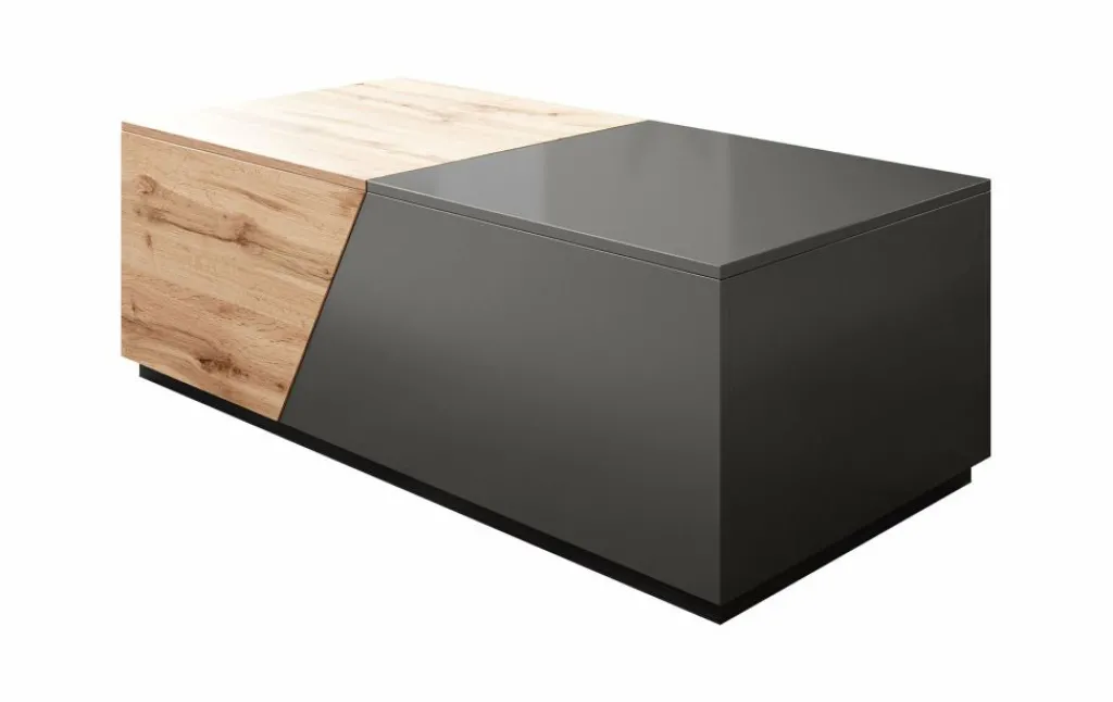 Salontafel Canberra is een moderne salontafel uitgevoerd in een eiken kleur met antraciet. De tafel is uitschuifbaar waardoor er twee grote opbergvakken ontstaan. Handig wanneer je veel op te bergen hebt!