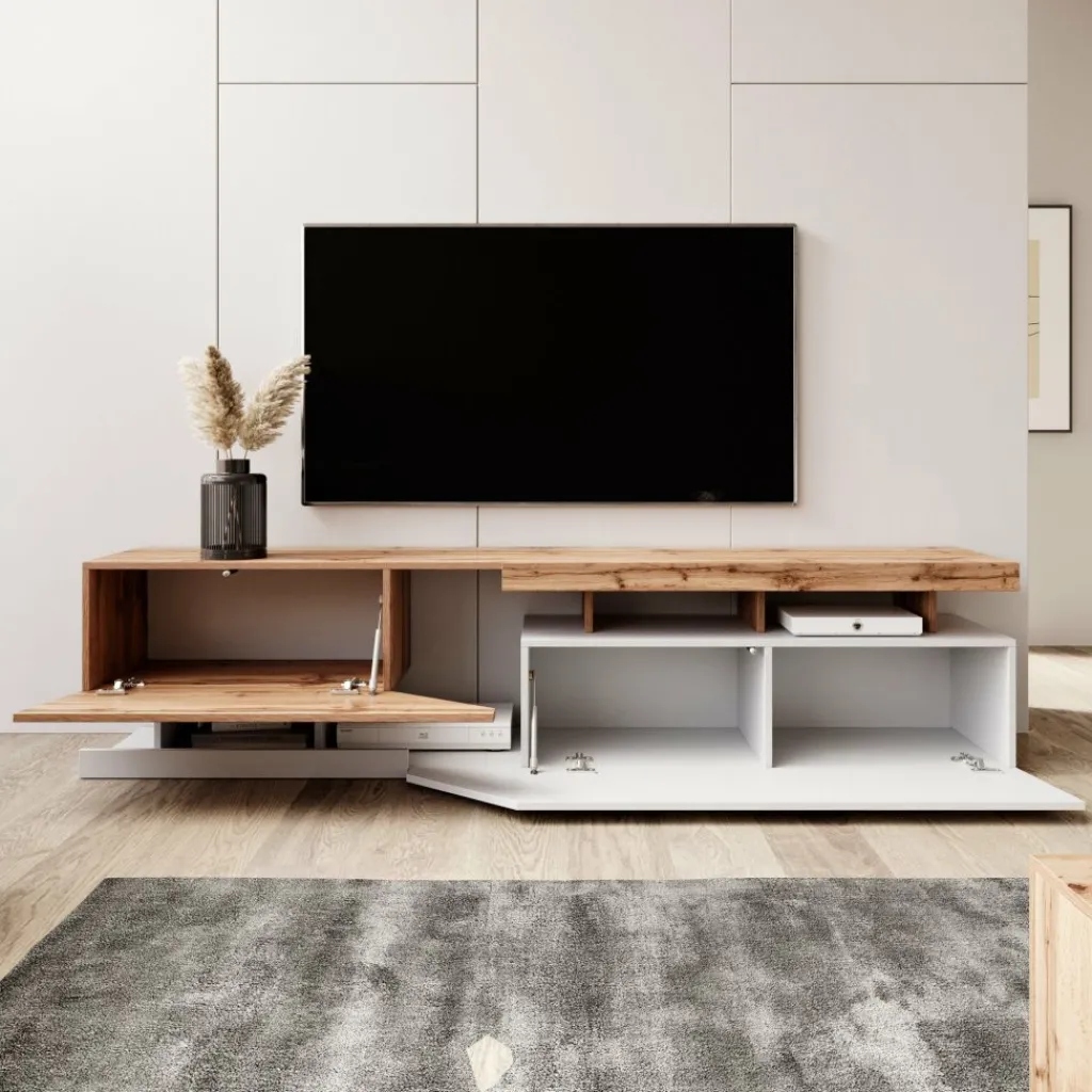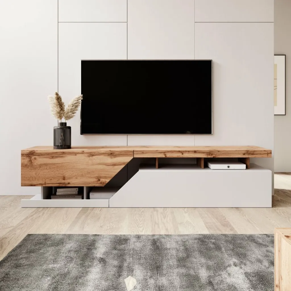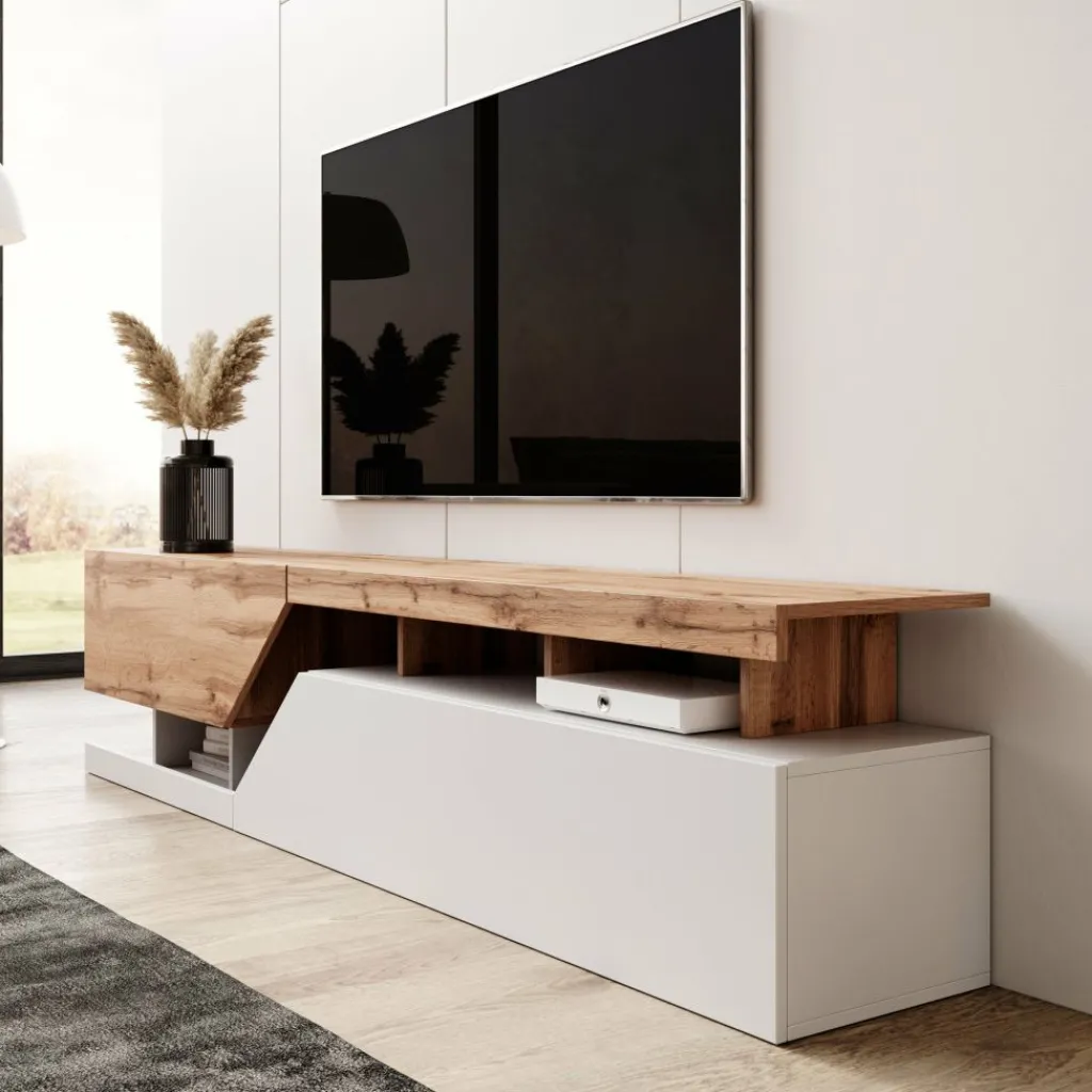 TV-Meubel Canberra combineert warme eikentinten met een frisse witkleurige basis.