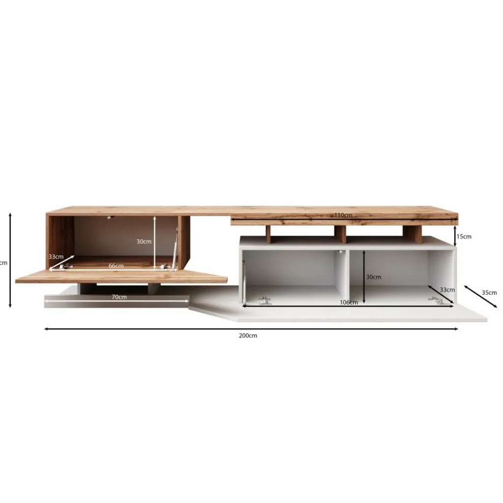 Het meubel heeft een breedte van 200 cm en biedt volop opbergruimte. Achter de twee kleppen bevinden zich drie ruime vakken, ideaal om losse spullen netjes uit het zicht te bewaren. De kleppen openen eenvoudig met een push-to-open systeem. Daarnaast beschikt de Canberra over vier open vakken die perfect zijn voor je mediabox, gameconsole of stijlvolle decoratie.