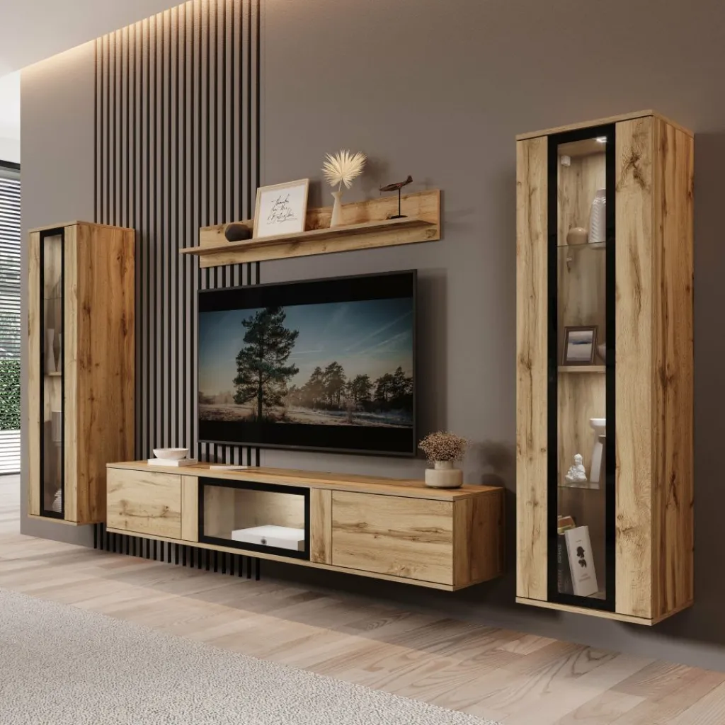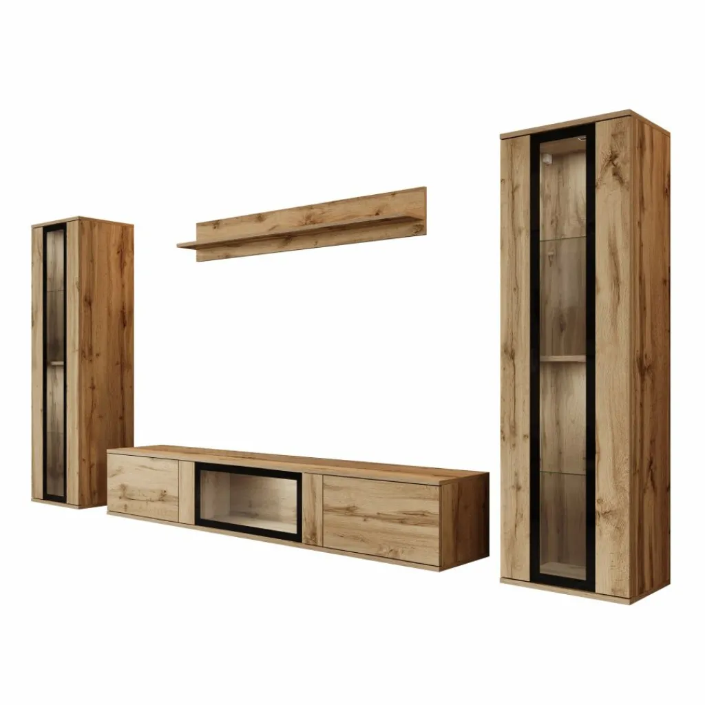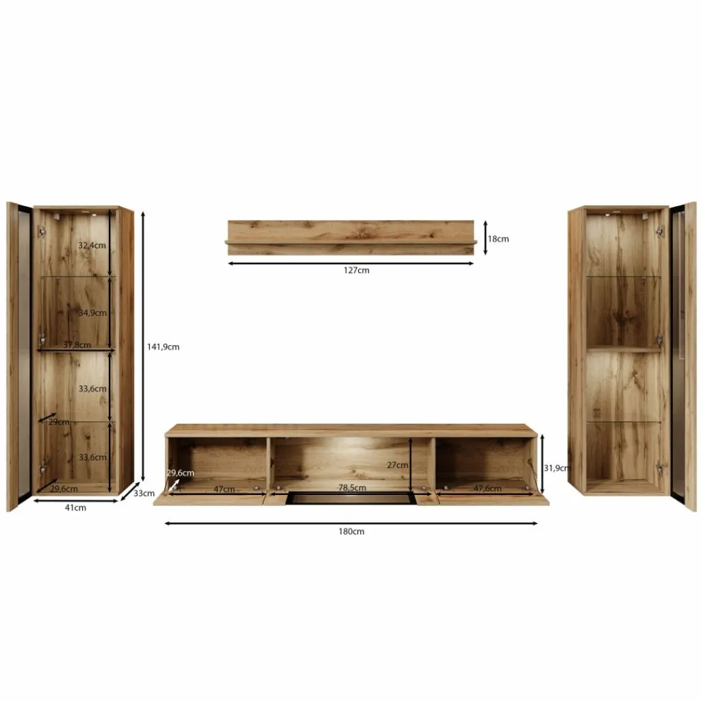 Met wandmeubel Capone in eiken kleur geef je jouw woonkamer een warme, stijlvolle uitstraling en profiteer je tegelijkertijd van slimme opbergruimte. Dit wandmeubel bestaat uit een tv-meubel met drie klepkasten, twee hoge vitrinekasten met glazen legplanken en een wandplank. De combinatie van het natuurlijke eiken decor en het strakke, greeploze design zorgt voor een moderne en toch huiselijke sfeer. Dankzij de ingebouwde LED-verlichting komen je favoriete accessoires goed tot hun recht achter de glazen deuren. Het meubel wordt zwevend gemonteerd, wat zorgt voor een ruimtelijk effect en een opgeruimde look.