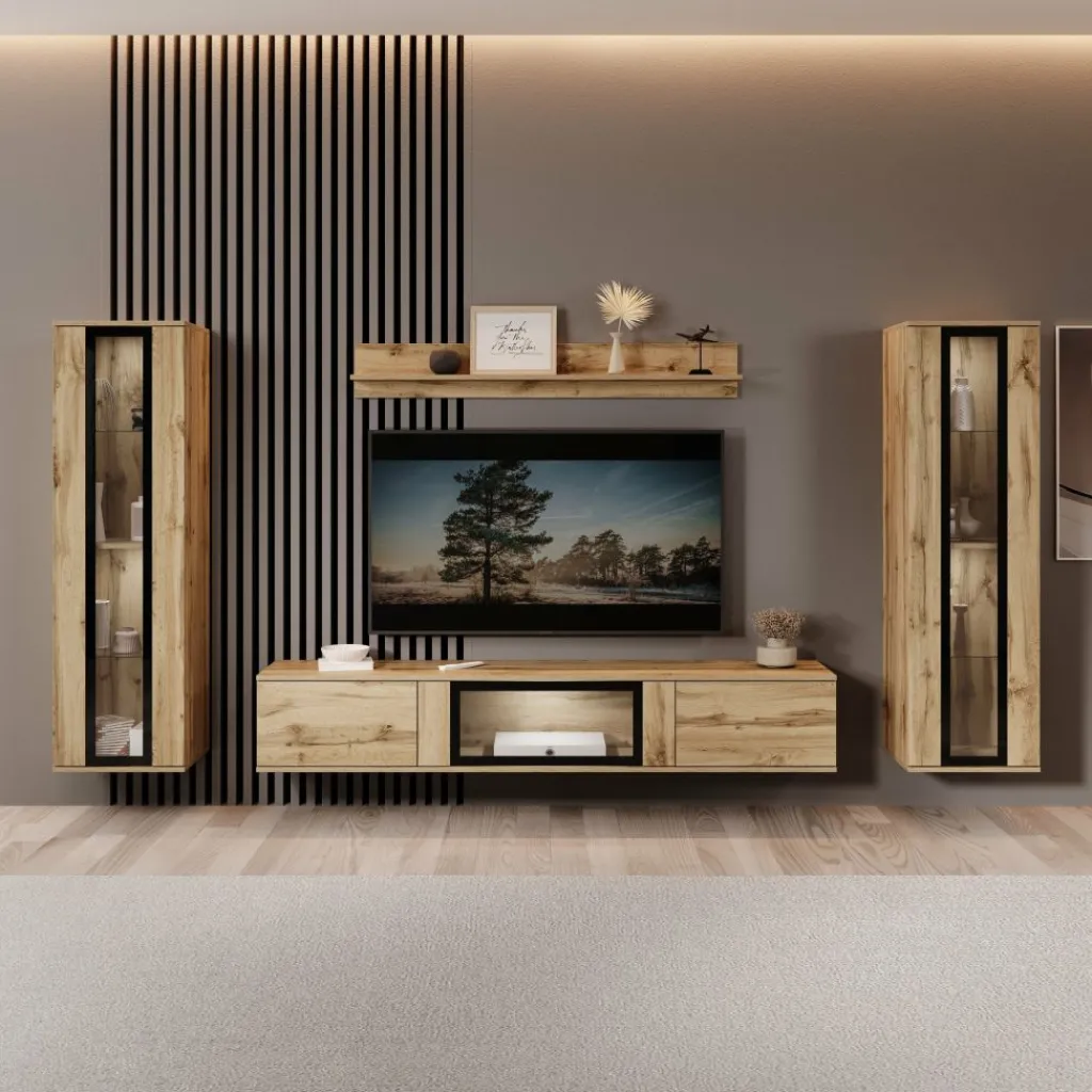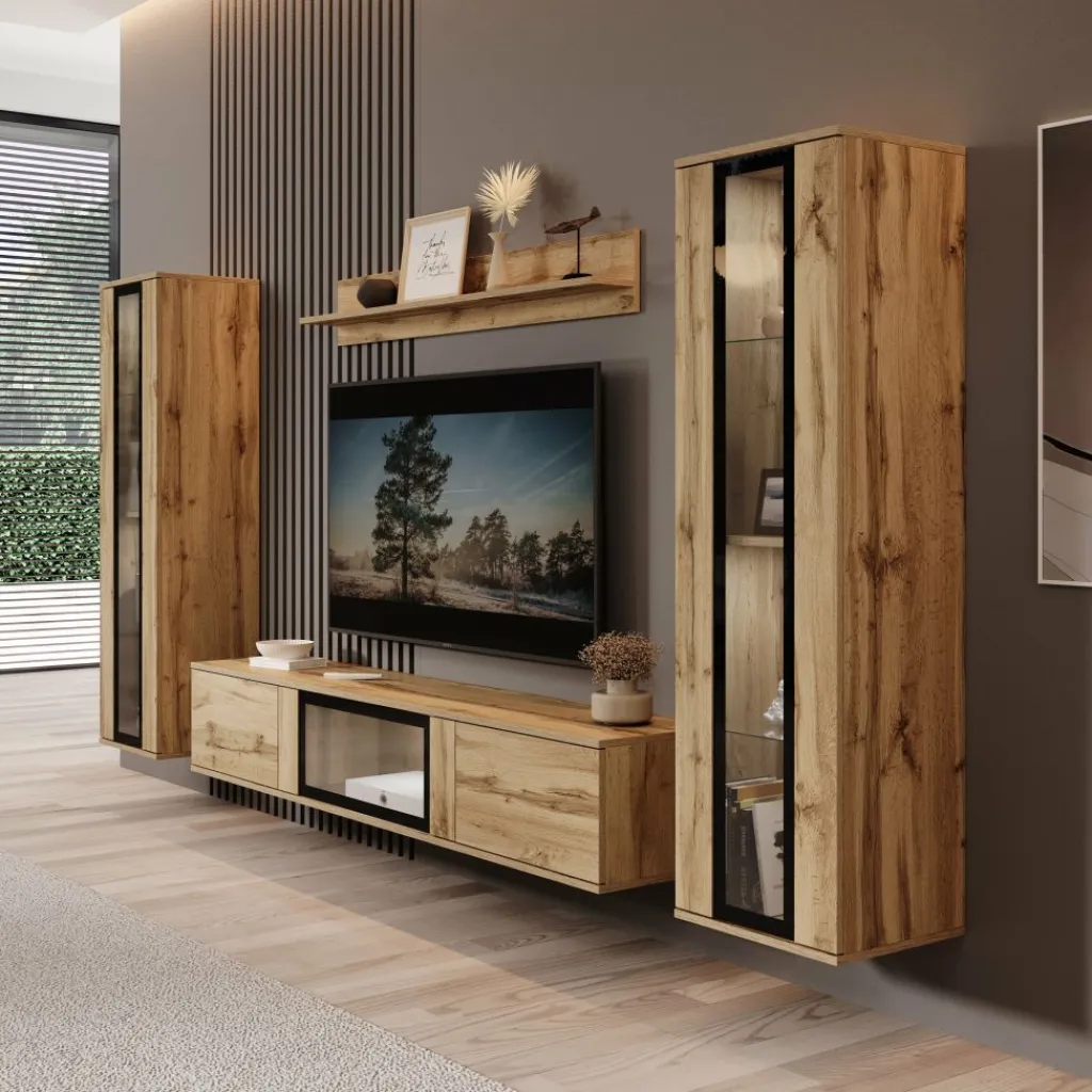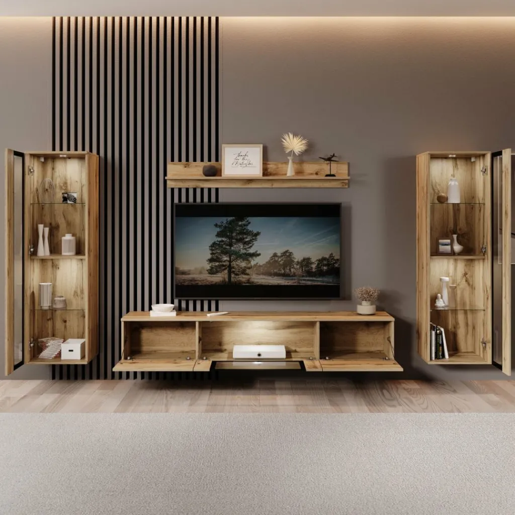 Met wandmeubel Capone in eiken kleur geef je jouw woonkamer een warme, stijlvolle uitstraling en profiteer je tegelijkertijd van slimme opbergruimte. Dit wandmeubel bestaat uit een tv-meubel met drie klepkasten, twee hoge vitrinekasten met glazen legplanken en een wandplank. De combinatie van het natuurlijke eiken decor en het strakke, greeploze design zorgt voor een moderne en toch huiselijke sfeer. Dankzij de ingebouwde LED-verlichting komen je favoriete accessoires goed tot hun recht achter de glazen deuren. Het meubel wordt zwevend gemonteerd, wat zorgt voor een ruimtelijk effect en een opgeruimde look.