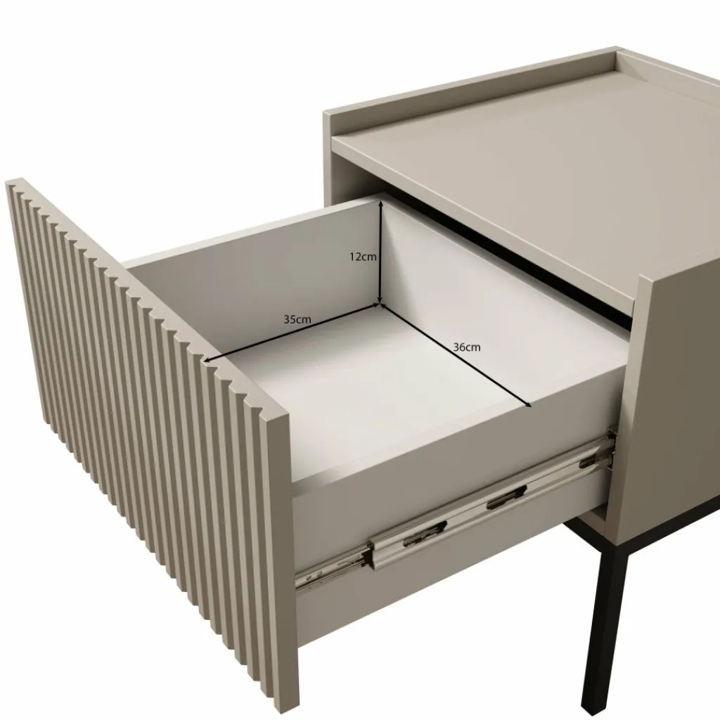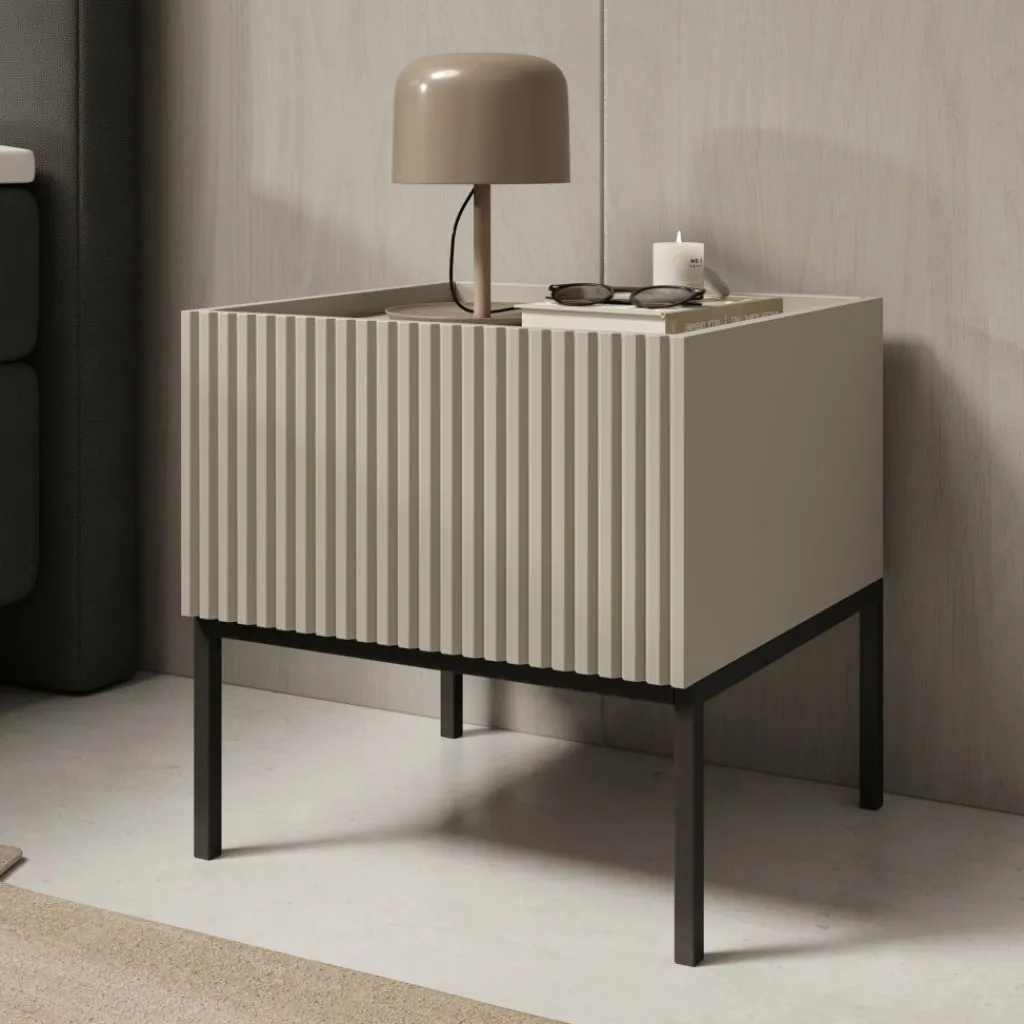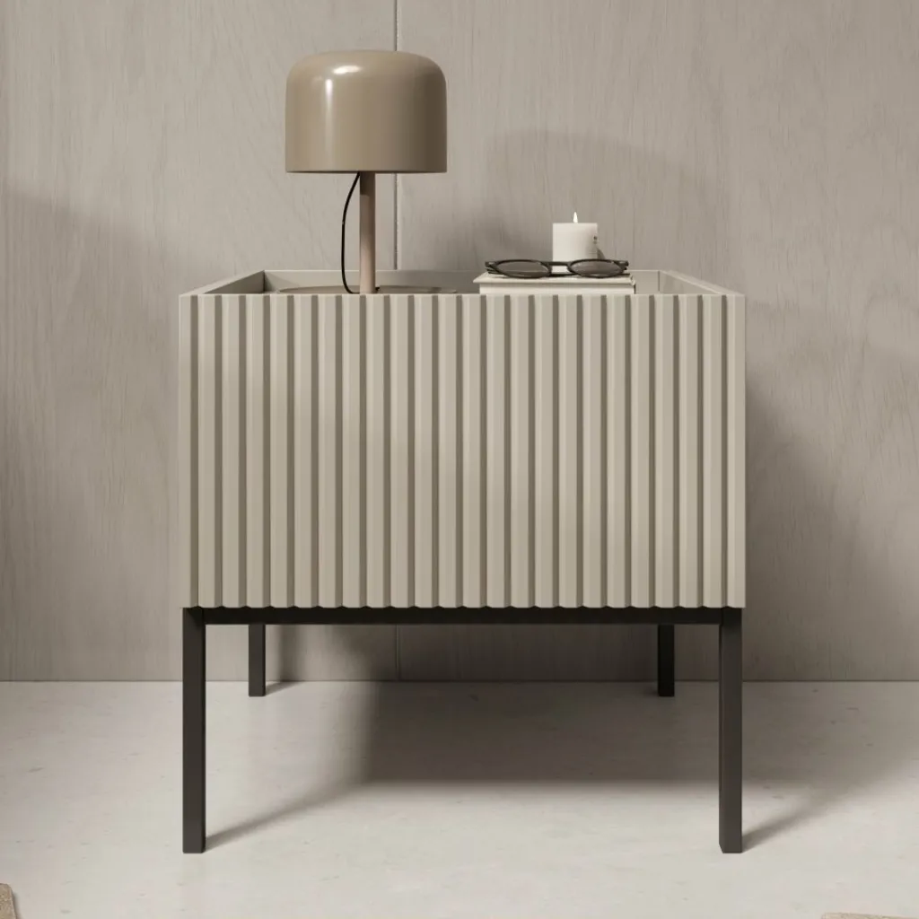 Het nachtkastje Capri in beige heeft een modern en verfijnd design dat perfect aansluit bij de gelijknamige beddenserie. De verticale groeven aan de voorzijde geven het meubel een stijlvolle, eigentijdse uitstraling, terwijl de zachte beige kleur zorgt voor een rustige en warme sfeer in de slaapkamer.