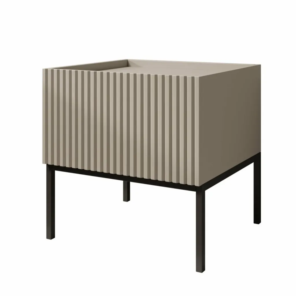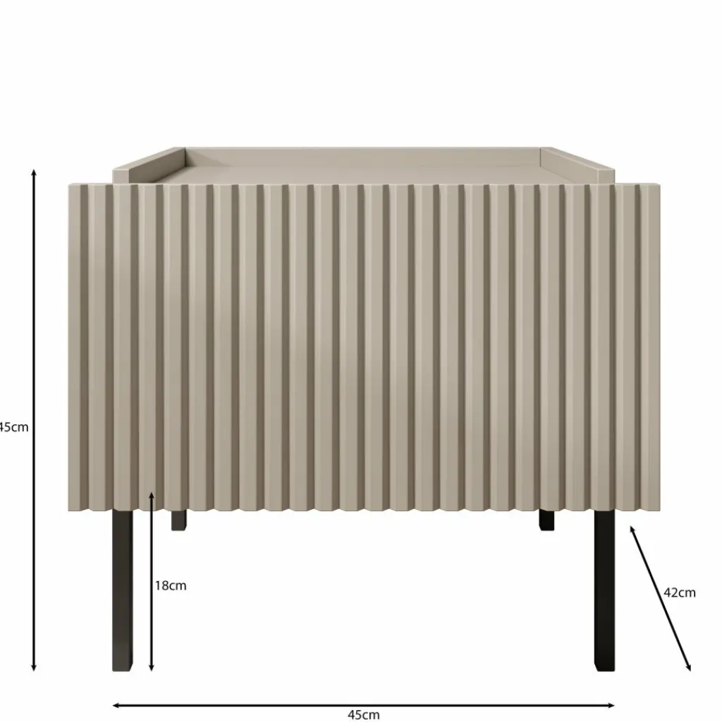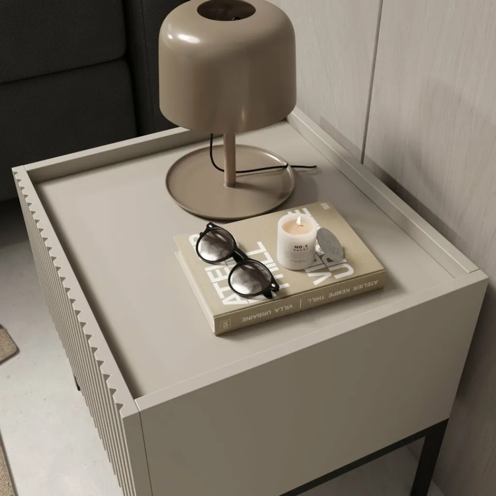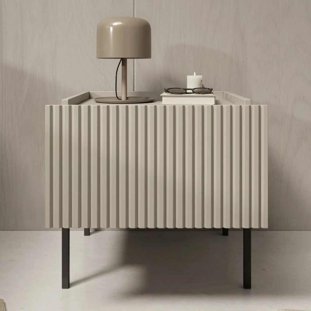 Het nachtkastje Capri in beige heeft een modern en verfijnd design dat perfect aansluit bij de gelijknamige beddenserie. De verticale groeven aan de voorzijde geven het meubel een stijlvolle, eigentijdse uitstraling, terwijl de zachte beige kleur zorgt voor een rustige en warme sfeer in de slaapkamer.