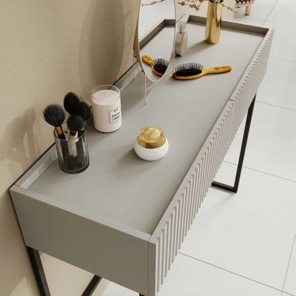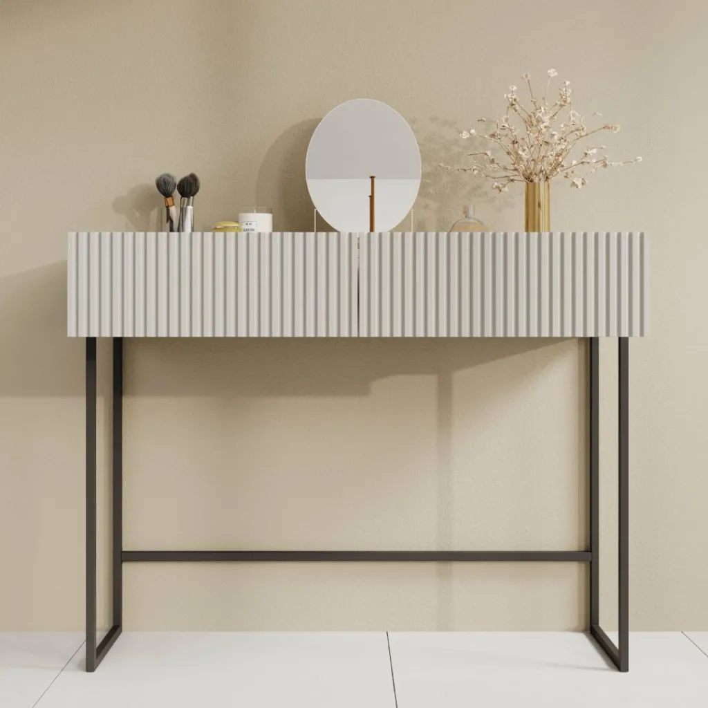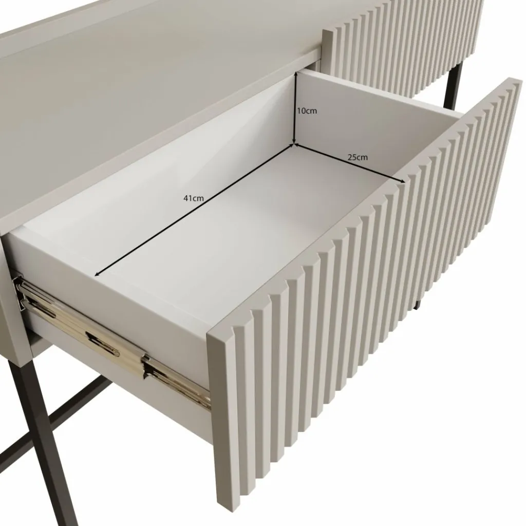 De Capri kaptafel in beige combineert elegantie en modern design. Het meubel heeft een strakke vormgeving met een subtiel geribbeld front, wat zorgt voor een stijlvol detail. De zachte beige kleur straalt rust uit en past moeiteloos in zowel moderne als minimalistische interieurs.
