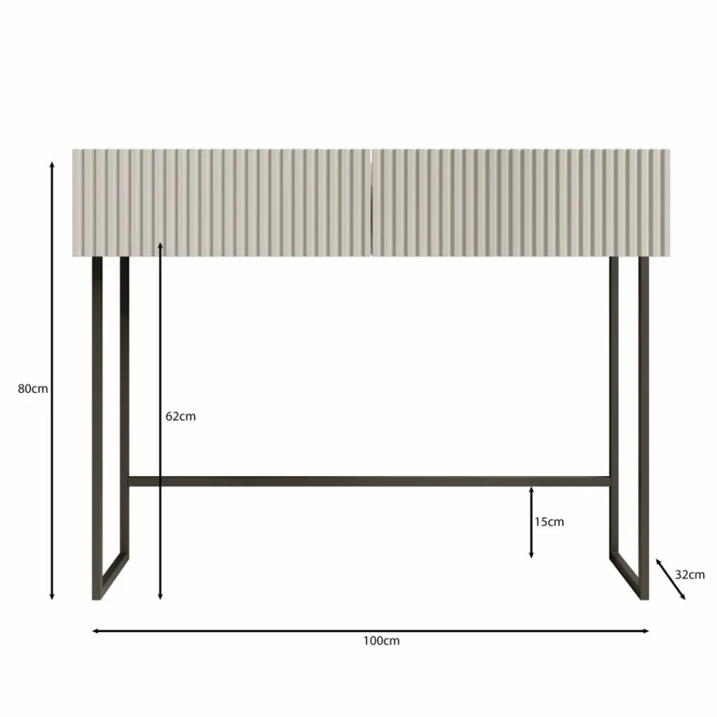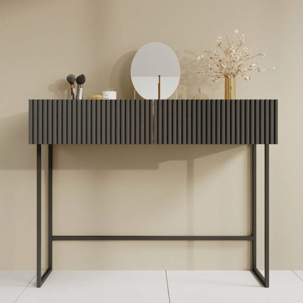 Dankzij het slanke zwarte metalen onderstel oogt de kaptafel luchtig en minimalistisch, terwijl het stevig en stabiel blijft. Het tafelblad biedt voldoende ruimte voor make-up, accessoires of decoratie.