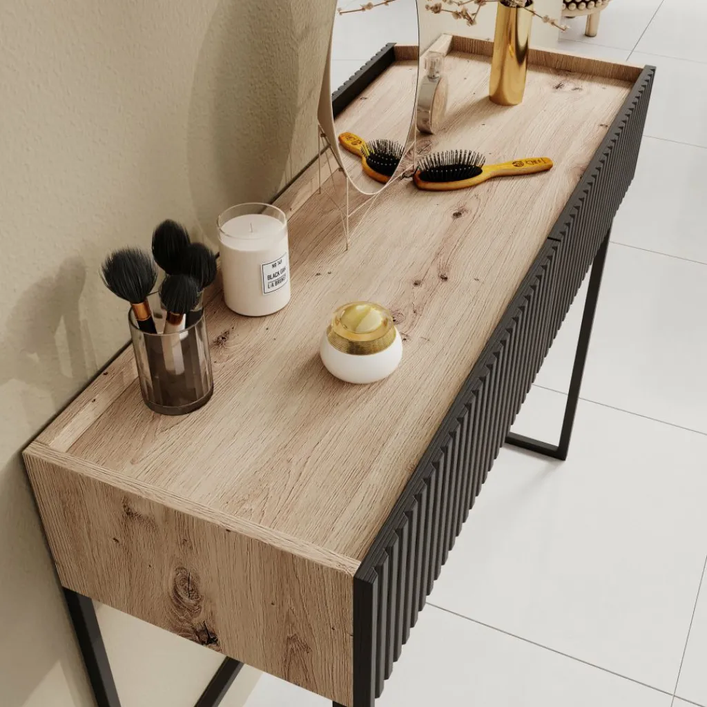 De Capri kaptafel in eiken met zwart front is een stijlvolle toevoeging aan elke slaapkamer of hal. De combinatie van warm eikenhout met een strak, geribbeld zwart front zorgt voor een moderne en elegante uitstraling.