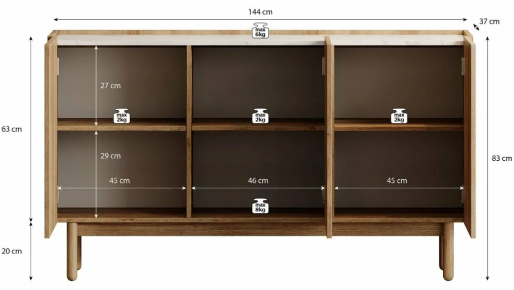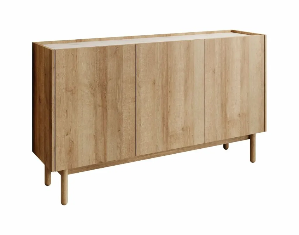Dressoir Cayenne is een opbergkast in Scandinavische stijl. Het dressoir is gemaakt van een stevige spaanplaat constructie met duurzaam FSC keurmerk. De kast heeft drie deuren met daarachter 6 opbergvakken. De deuren zijn greeploos.