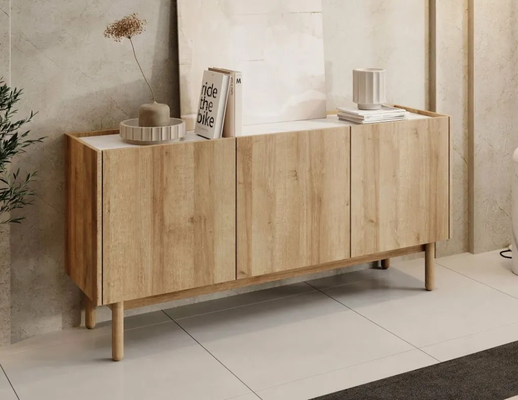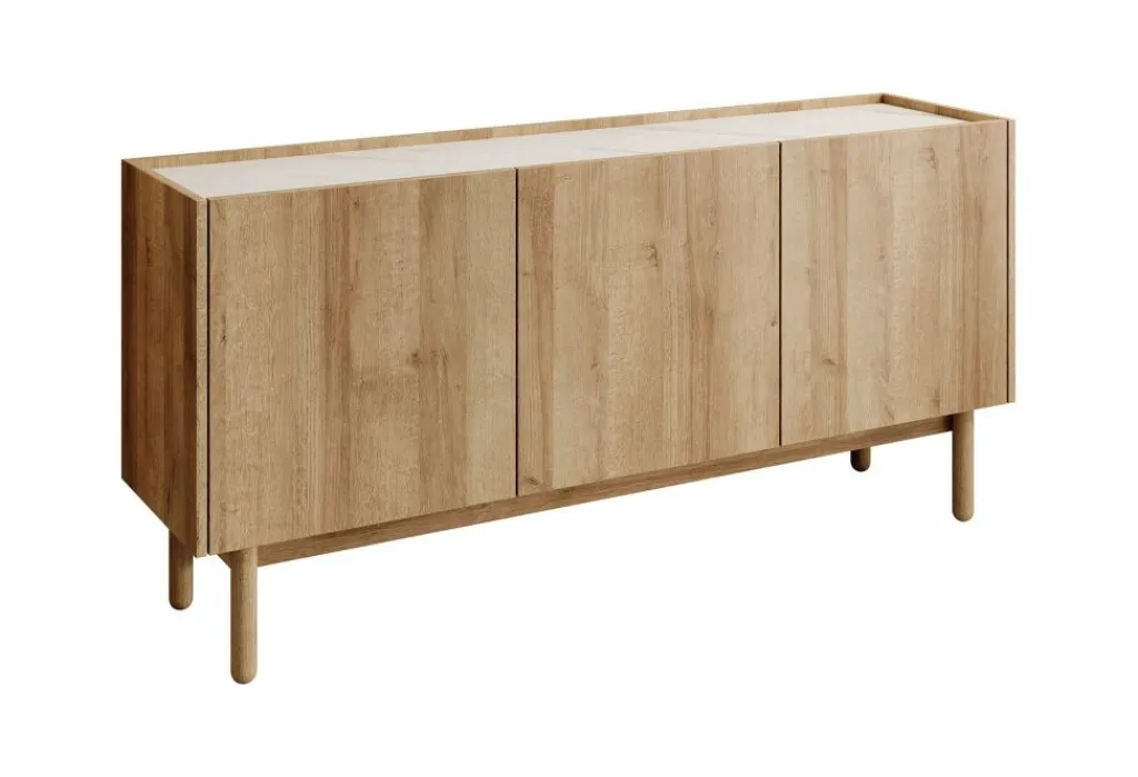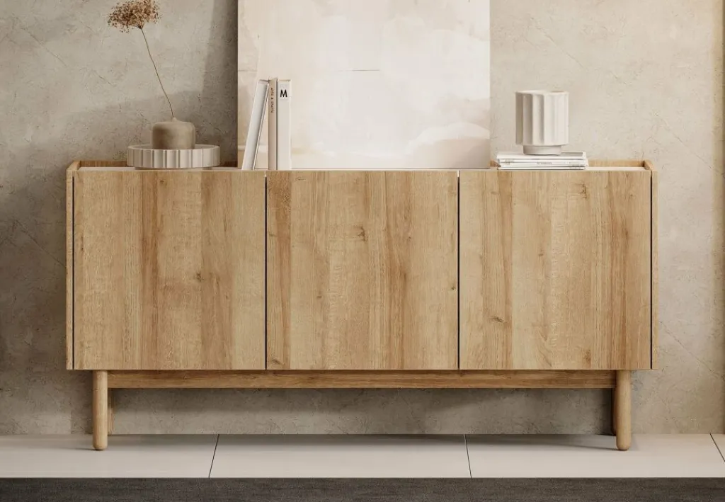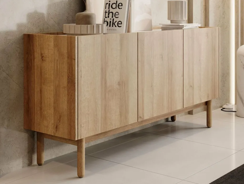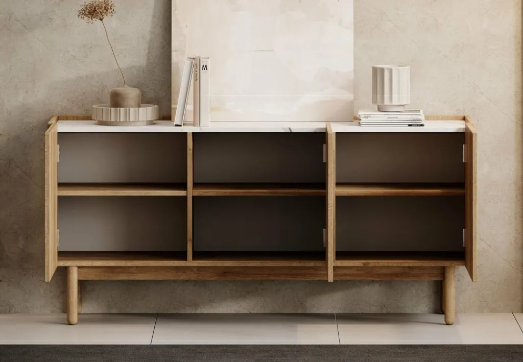 De kast heeft drie deuren met daarachter 6 opbergvakken. De deuren zijn greeploos.