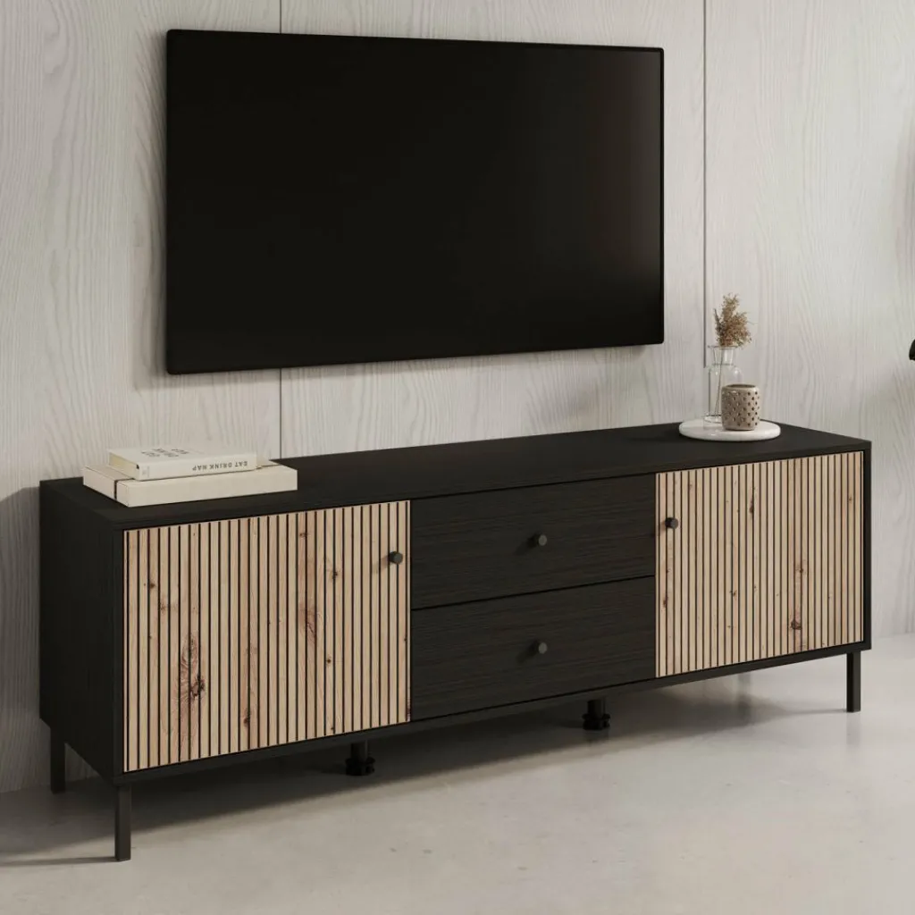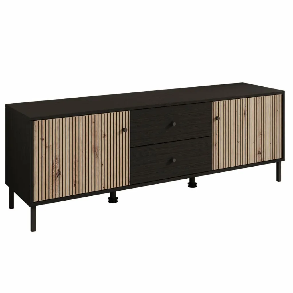 TV-Meubel Charles is een opbergkast voor onder de tv in een moderne, industriële stijl. De kast beschikt over 2 lades en 2 deuren die openen met zwarte knoppen. Achter de deuren zijn in totaal 2 opbergvakken te vinden. Het meubel is uitgevoerd in een zwart eiken met eiken kleur en staat op metalen poten met in het midden 2 extra pootjes.