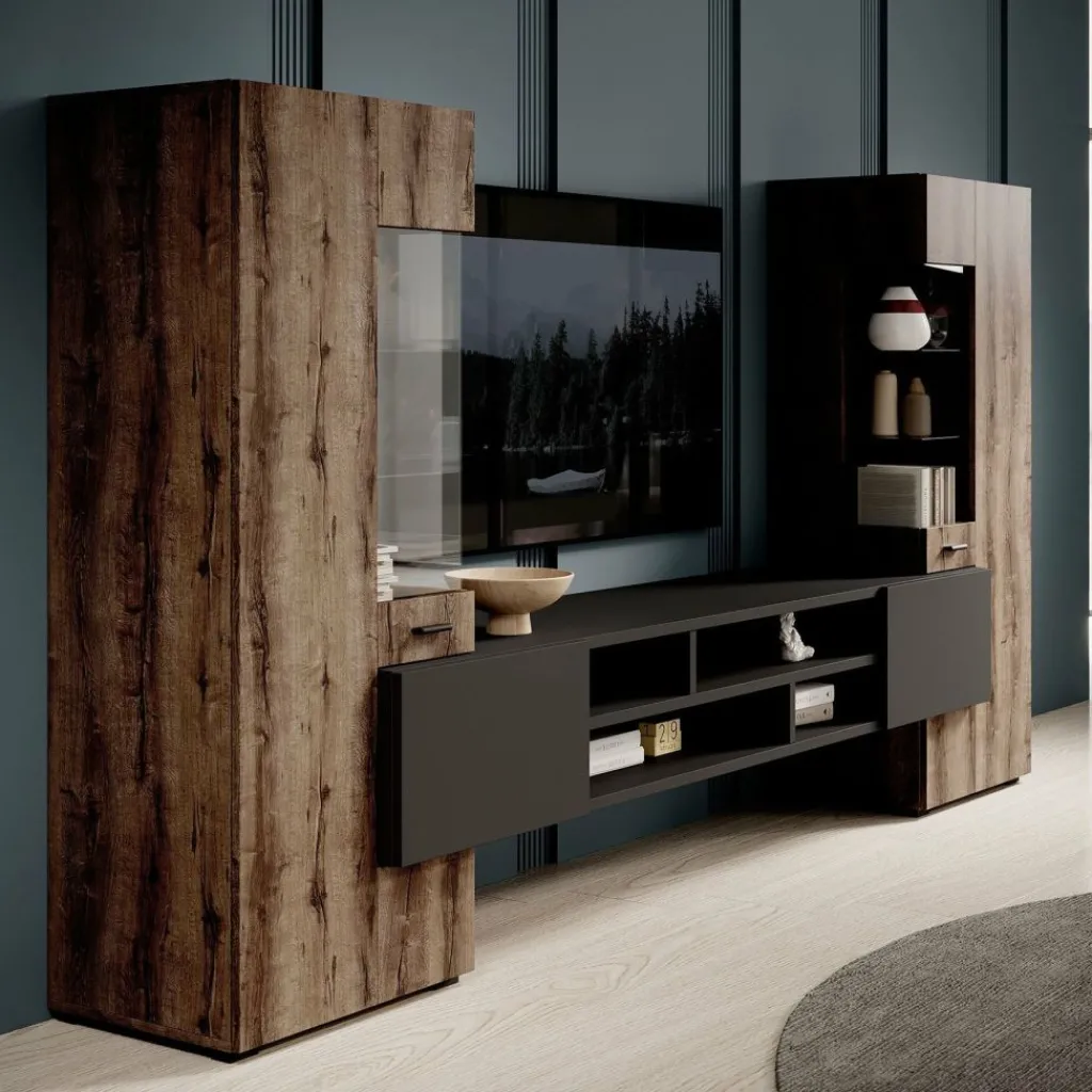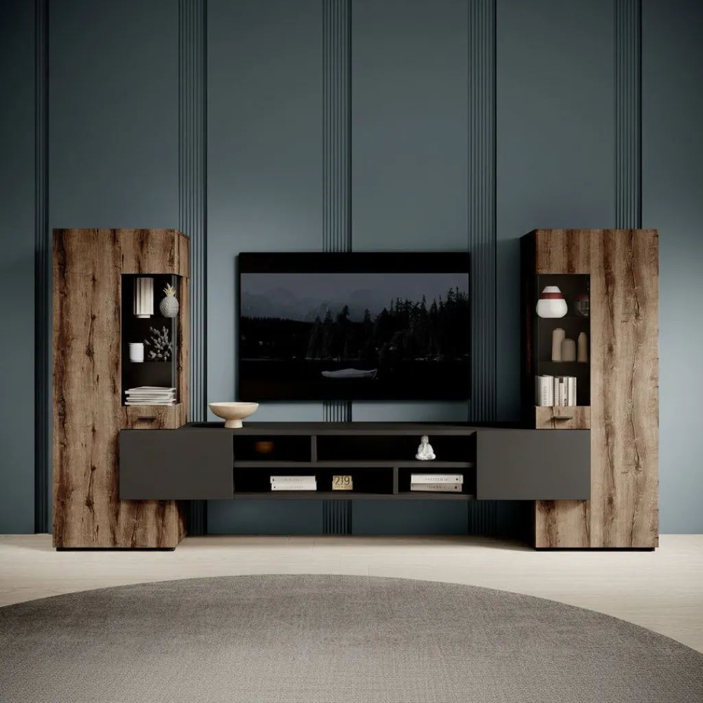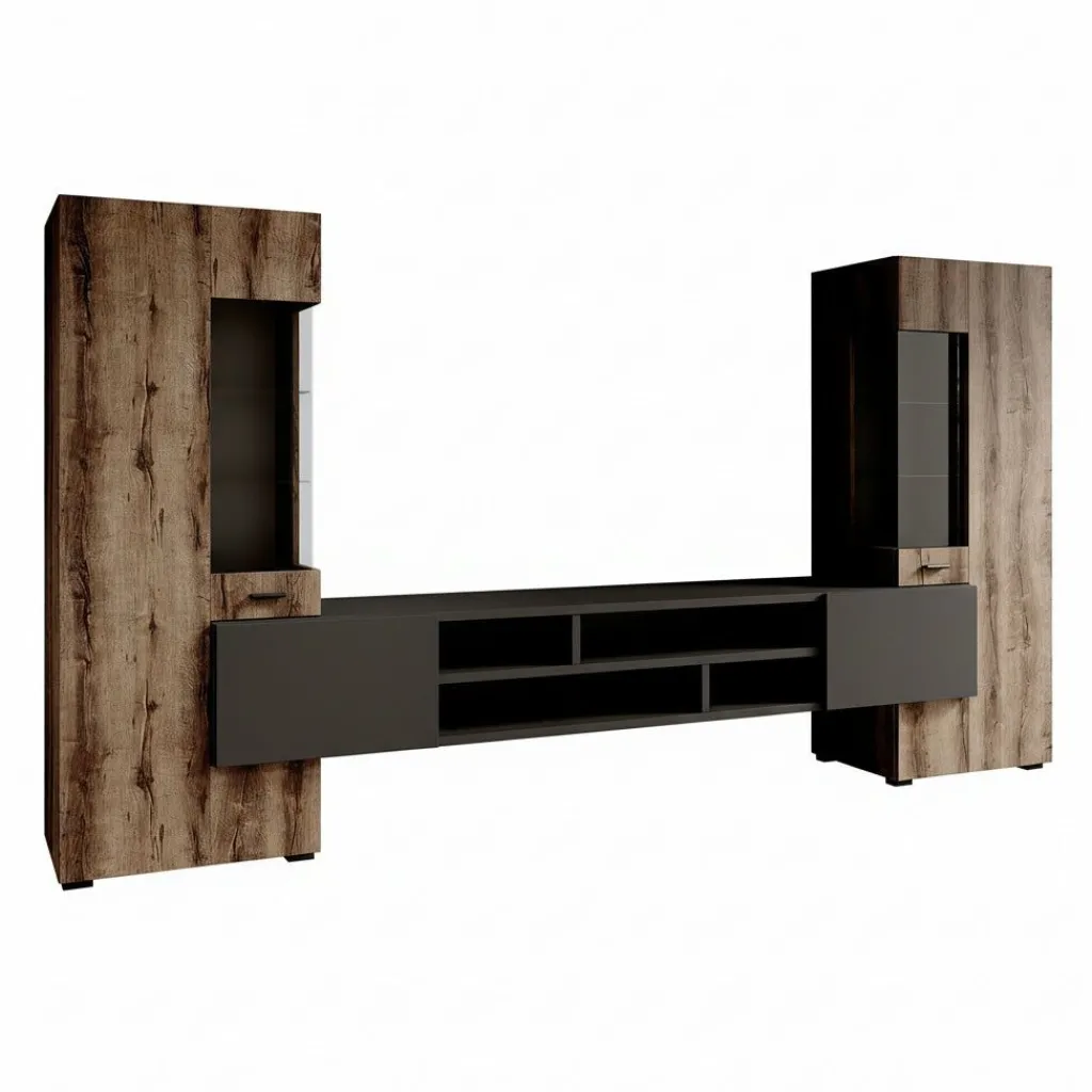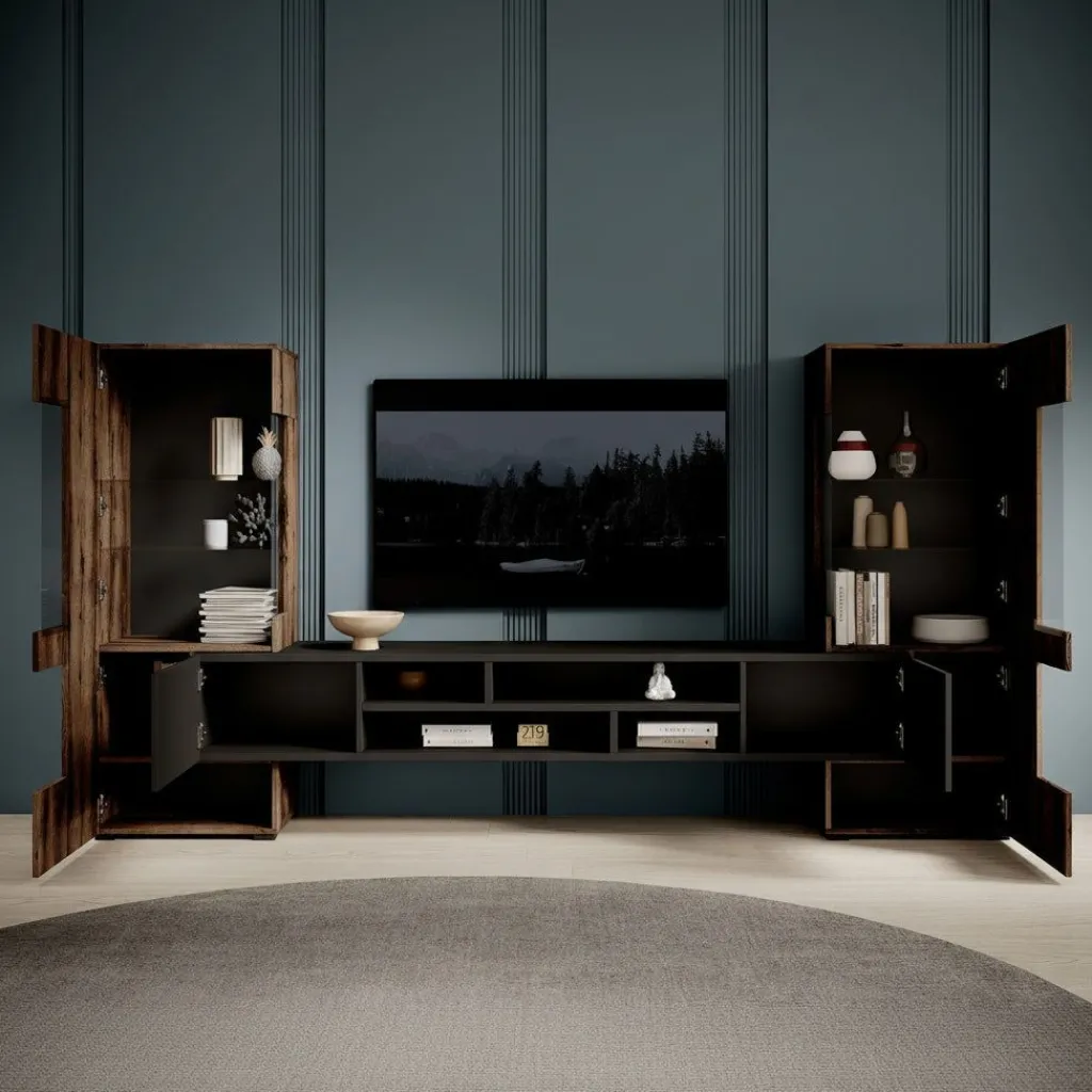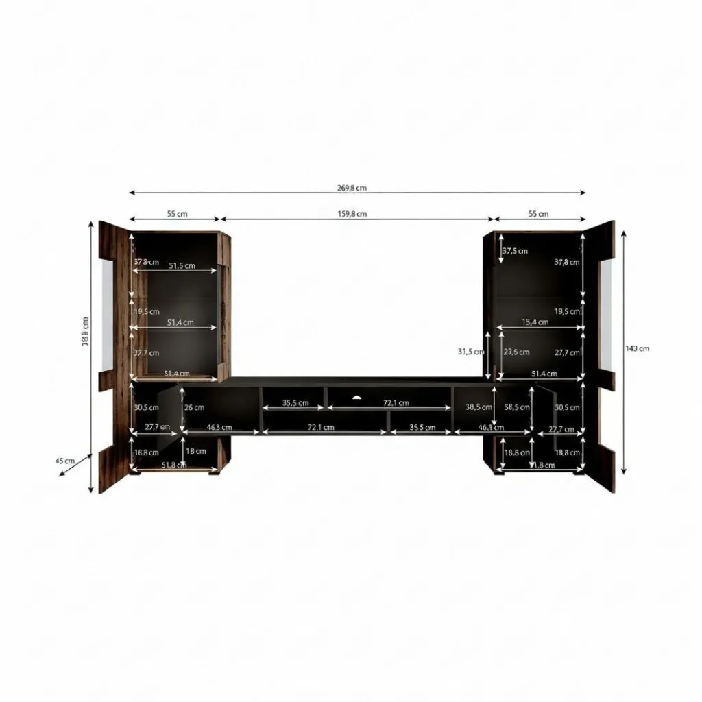 Het tv-meubel beschikt over 2 greeploze deuren en 6 opbergvakken. Beide kasten beschikken over een deur die je opent met een zwarte handgreep. In totaal is dit meubel 270 cm breed!