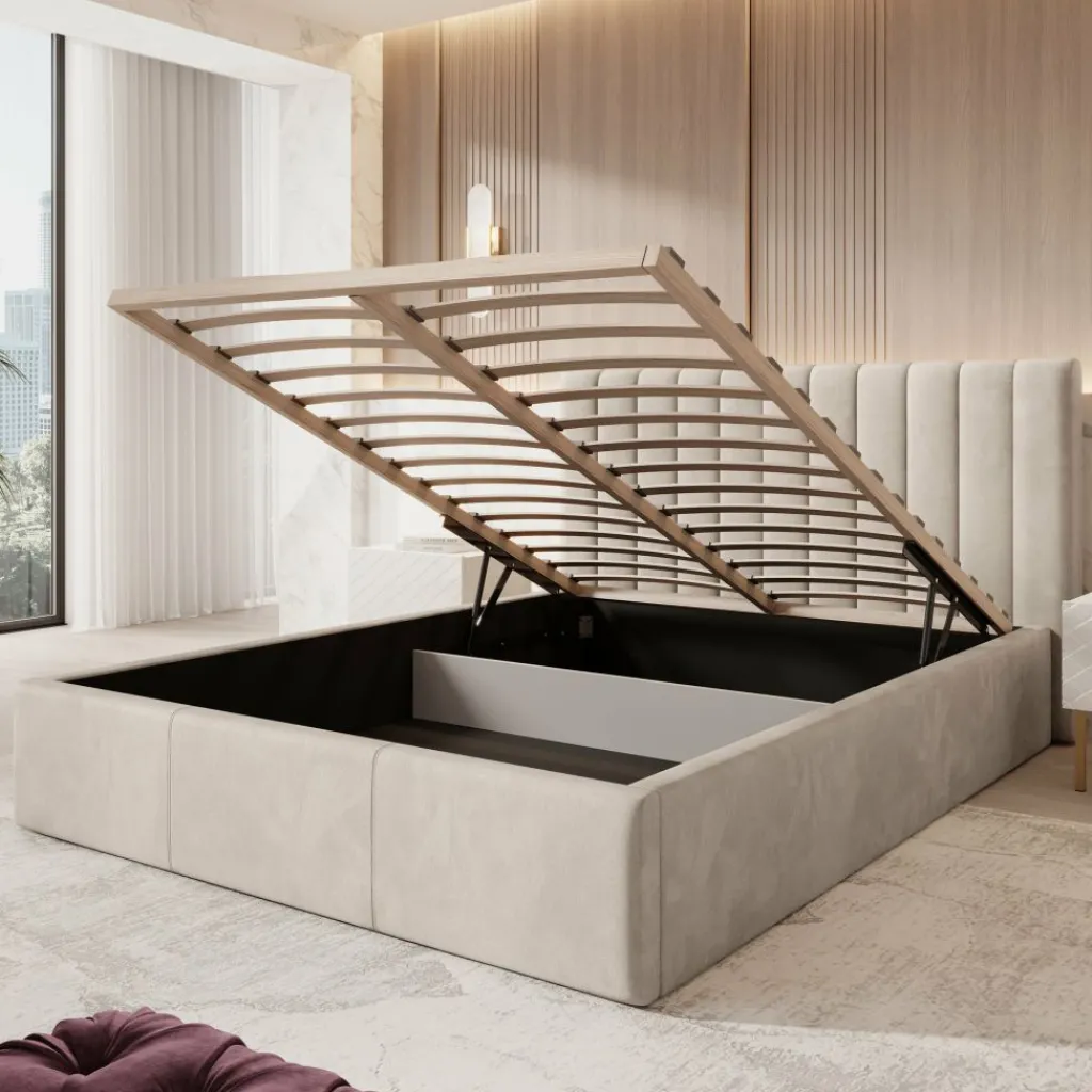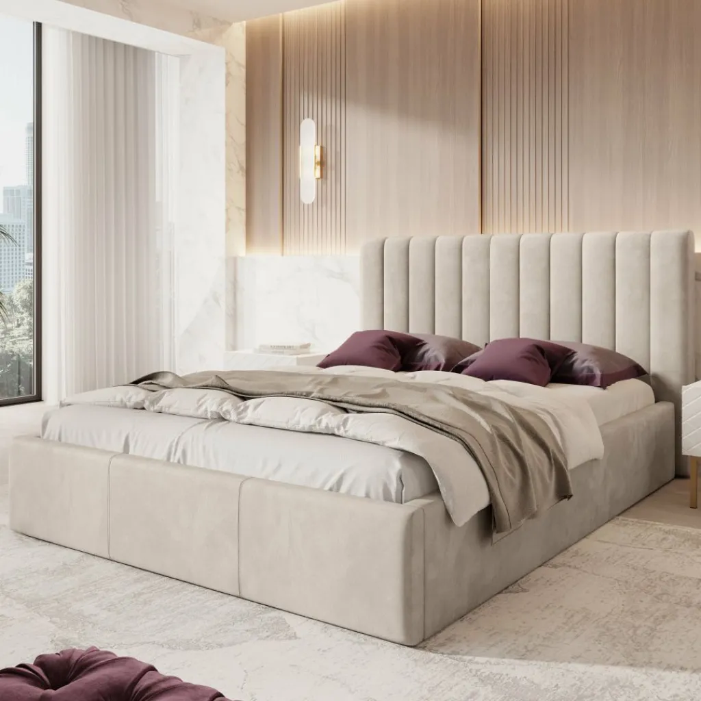 Tweepersoonsbed Chief is een modern bed in beige kleur, volledig bekleed met een sterke en onderhoudsvriendelijke velvet stof. Het hoofdbord is voorzien van verticale siernaden, wat het bed een luxe en elegante uitstraling geeft.