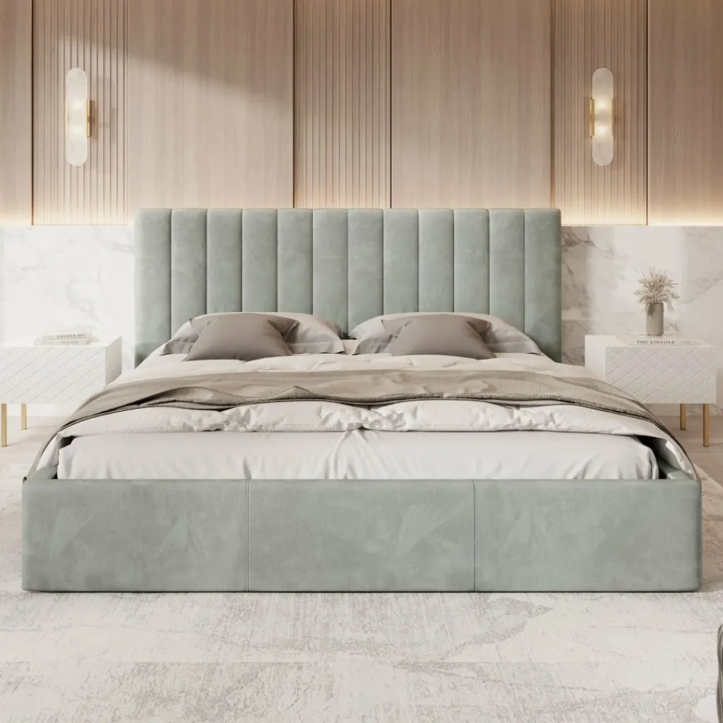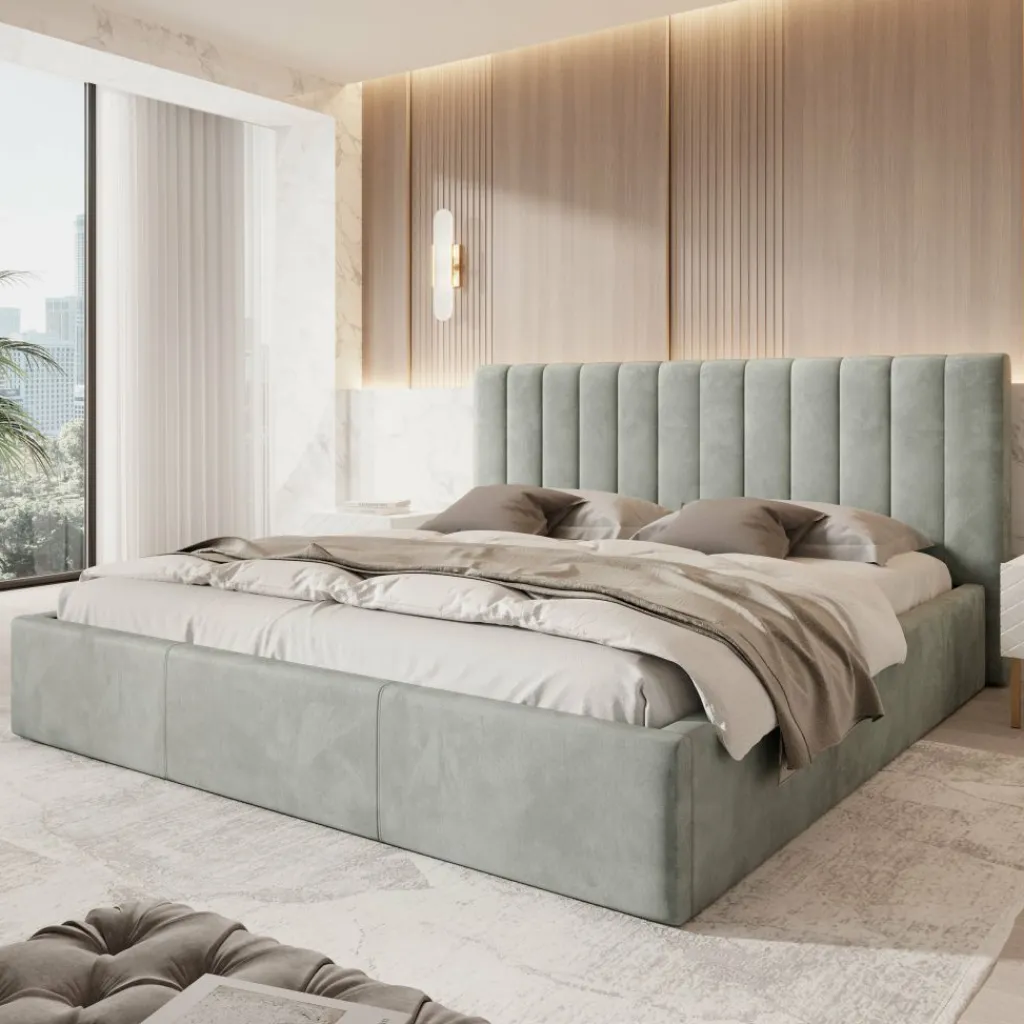 Tweepersoonsbed Chief is een modern bed in grijze kleur, volledig bekleed met een sterke en onderhoudsvriendelijke velvet stof. Het hoofdbord is voorzien van verticale siernaden, wat het bed een elegante uitstraling geeft.
