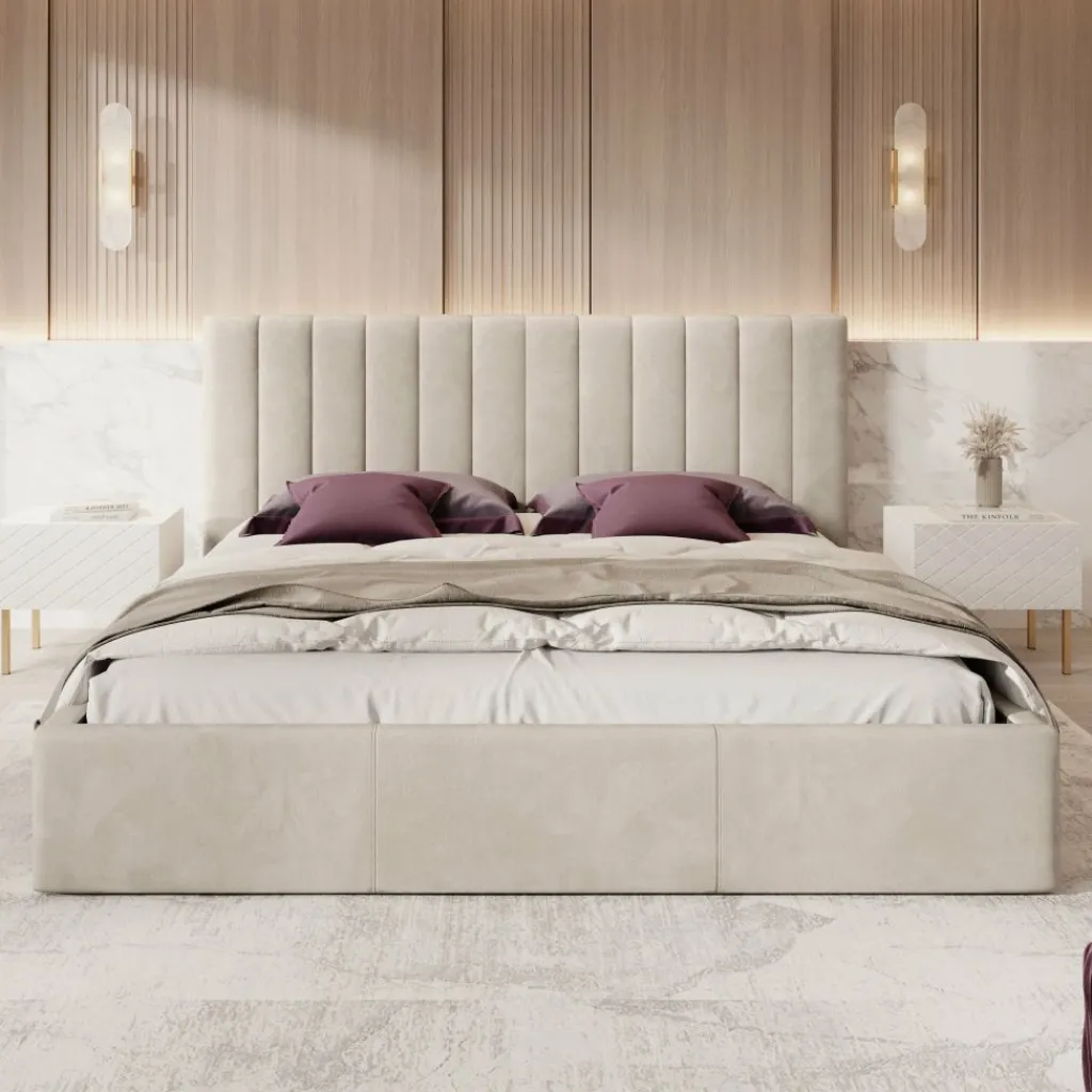 Tweepersoonsbed Chief is een modern bed in beige kleur, volledig bekleed met een sterke en onderhoudsvriendelijke velvet stof. Het hoofdbord is afgewerkt met verticale siernaden, wat het bed een stijlvolle en luxueuze uitstraling geeft.