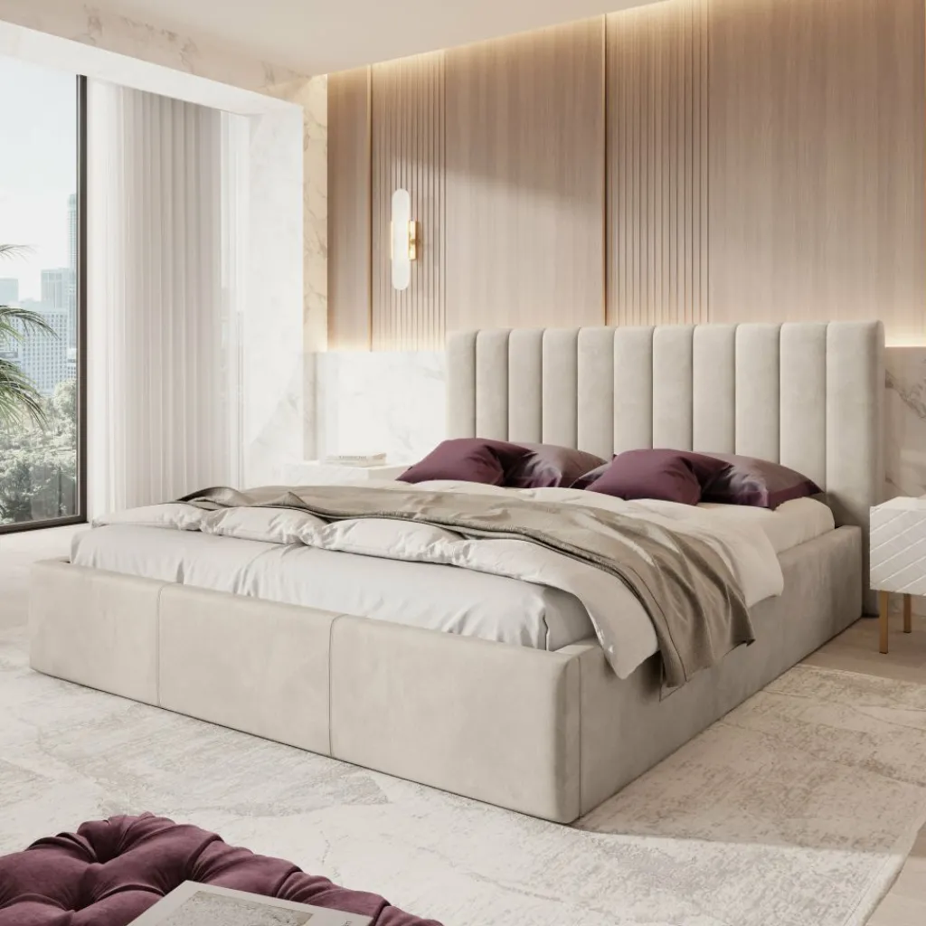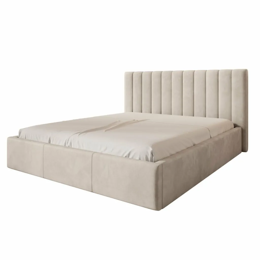 Tweepersoonsbed Chief is een modern bed in beige kleur, volledig bekleed met een sterke en onderhoudsvriendelijke velvet stof. Het hoofdbord is afgewerkt met verticale siernaden, wat zorgt voor een stijlvolle uitstraling.