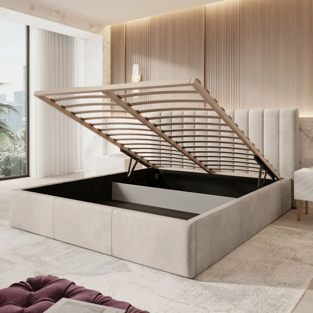 Onder de lattenbodem beschikt het bed over handige opbergruimte, ideaal voor het bewaren van beddengoed, kussens of andere spullen.