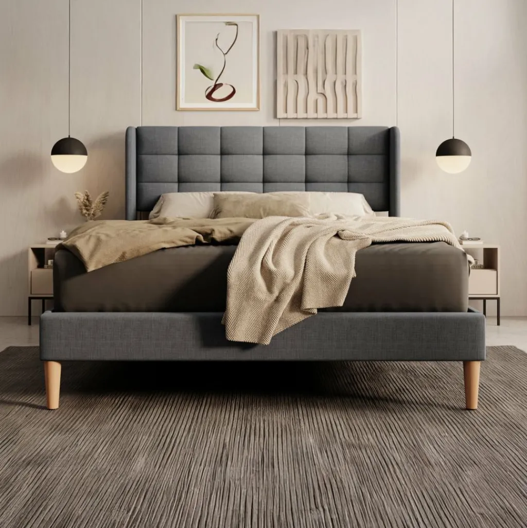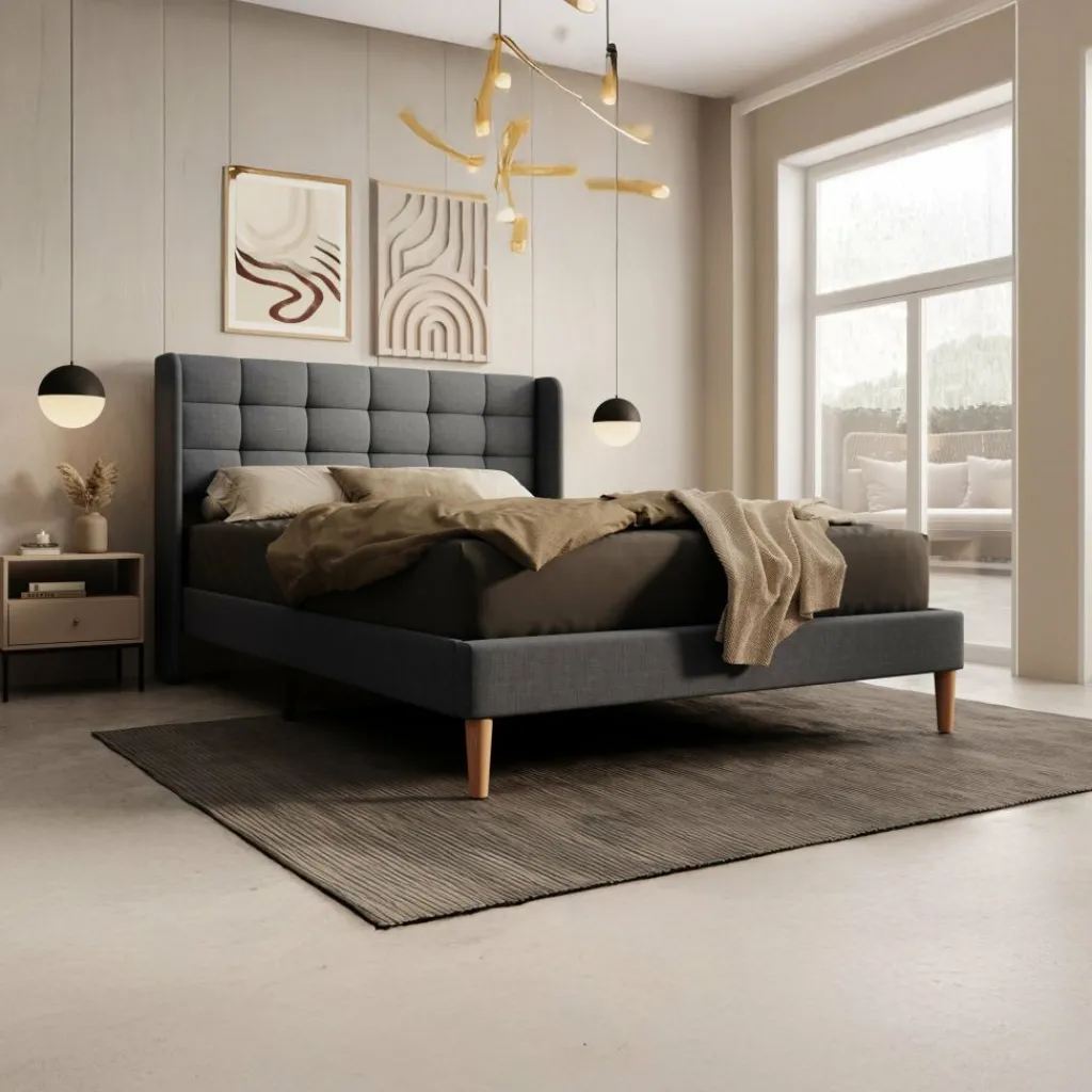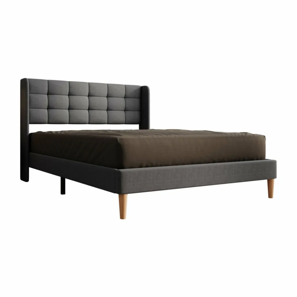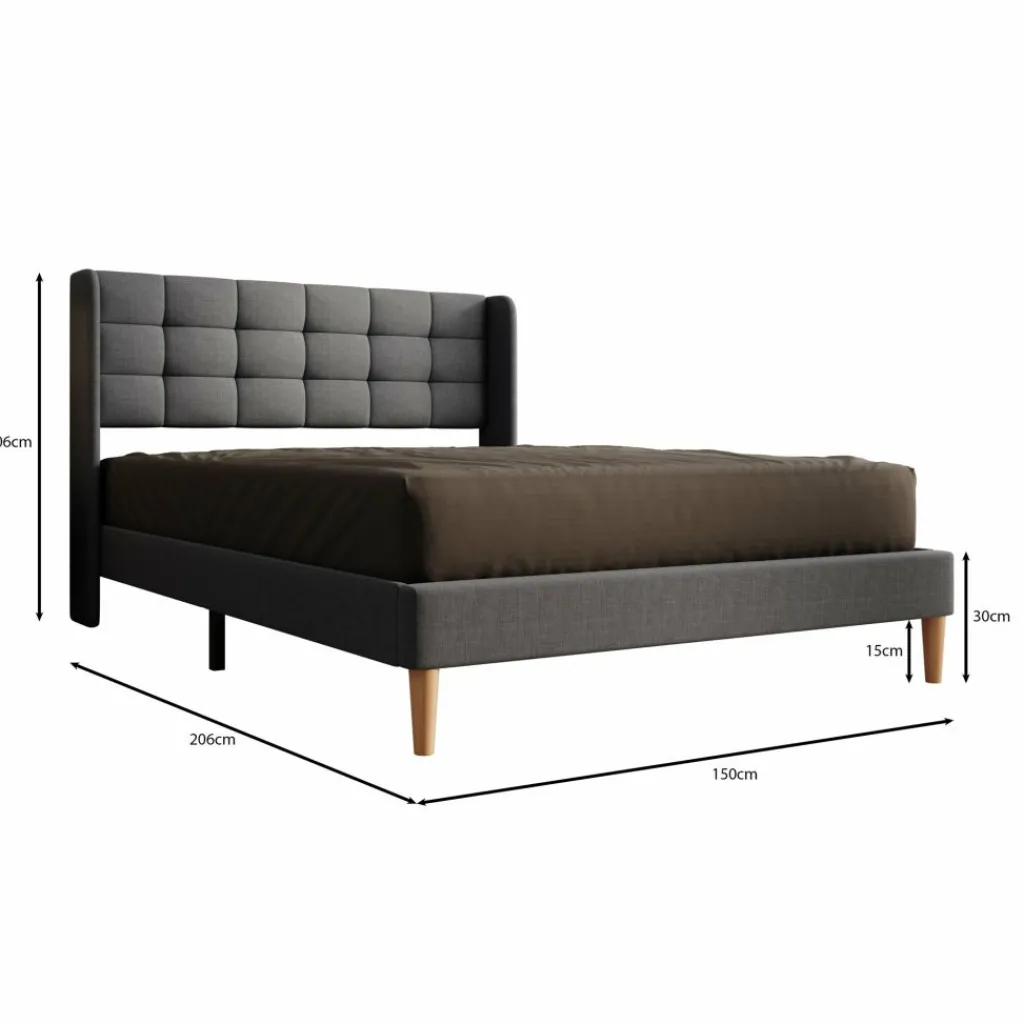 Tweepersoonsbed Christ is een bed geschikt voor matrasmaat 140×200 cm. Het bed is gemaakt van stof in de kleur grijs. De Christ wordt geleverd zonder matras. De lattenbodem is wel inbegrepen. Het bed staat op hoge, eikenkleurige pootjes en heeft een gecapitonneerd hoofdbord.