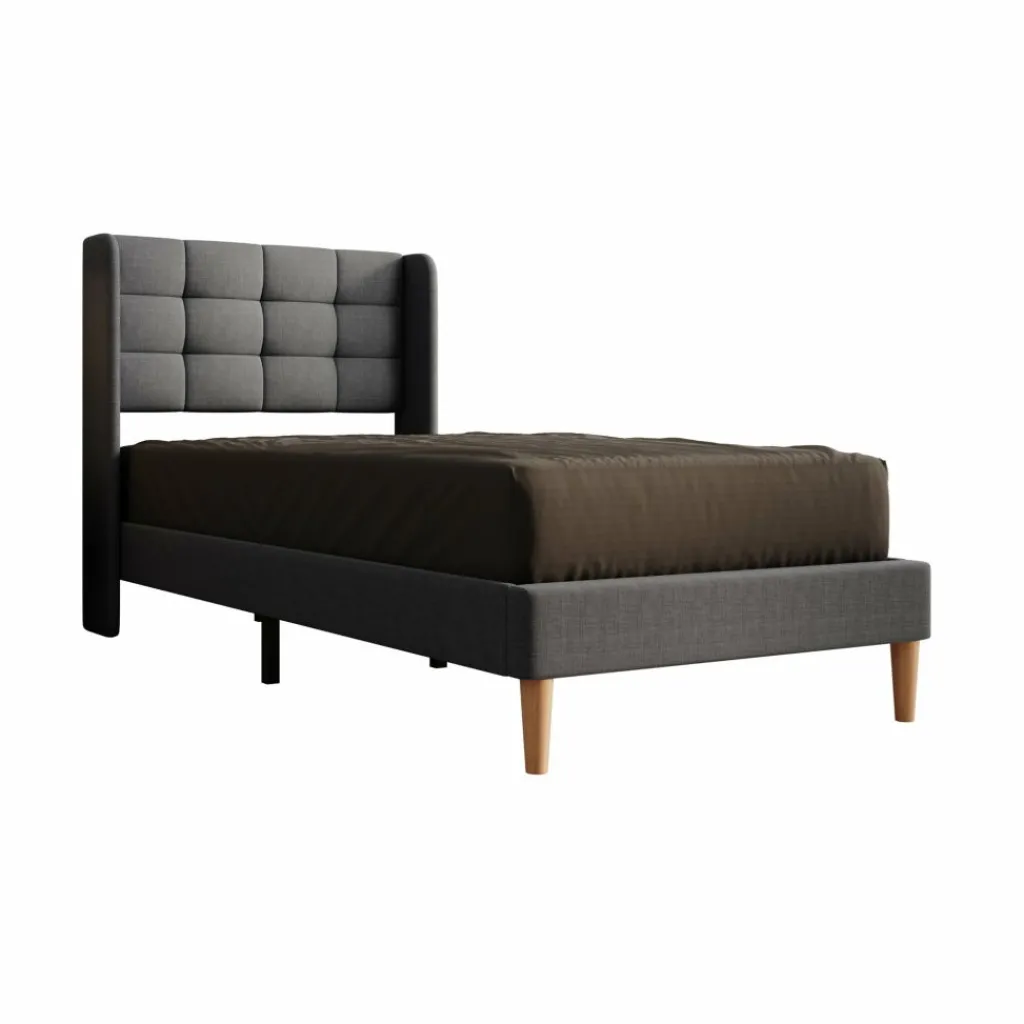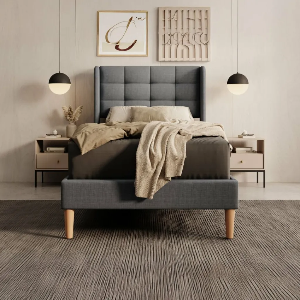 Eenpersoonsbed Christ is een bed geschikt voor matrasmaat 90×200 cm. Het meubel is gemaakt van stof in de kleur grijs. Het bed wordt geleverd zonder matras. De lattenbodem is wel inbegrepen. Het bed staat op hoge, eikenkleurige pootjes en heeft een gecapitonneerd hoofdbord.
