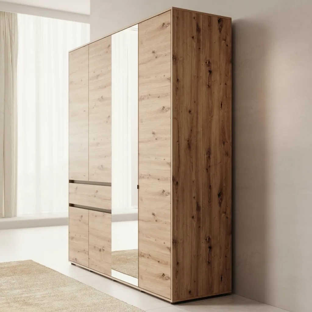 Cirelle 2 is een ruime kledingkast met een breedte van 183 cm en een hoogte van 211 cm. De uitvoering in eikenpatroon geeft het meubel een natuurlijke houtlook die goed past in zowel moderne als tijdloze slaapkamers.