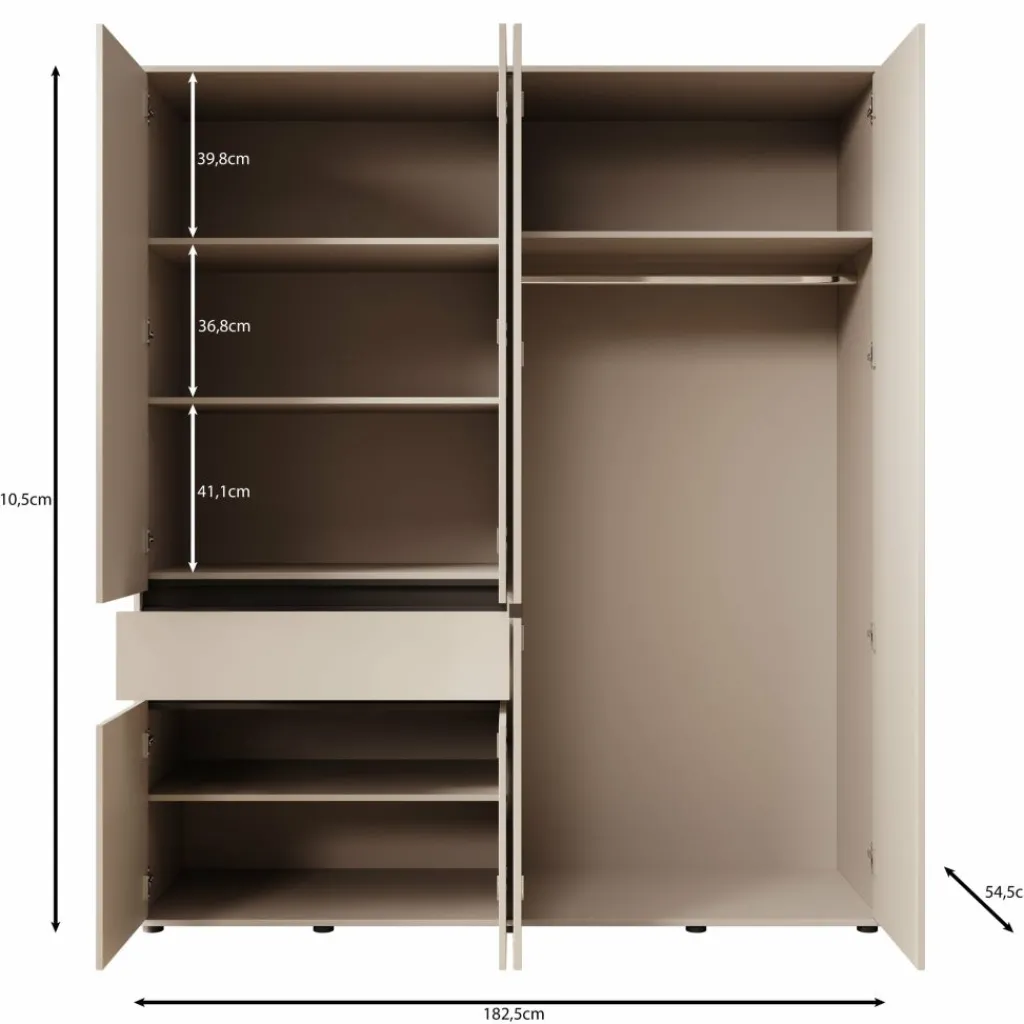 Achter de vier deuren bevindt zich een praktische indeling met meerdere legplanken en een hanggedeelte met roede. Hierdoor kun je kleding overzichtelijk ophangen en gevouwen opbergen. In het onderste gedeelte zijn lades geïntegreerd voor kleinere kledingstukken en accessoires, zodat alles netjes gescheiden blijft.