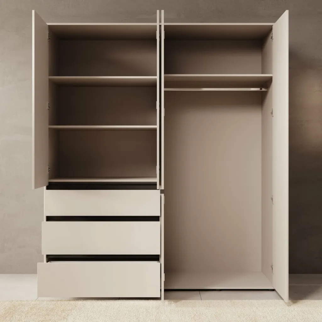 Achter de vier deuren is de kast praktisch ingedeeld met meerdere legplanken en een hanggedeelte met roede. De legplanken zijn geschikt voor het stapelen van kleding, dozen of beddengoed. Elke legplank heeft een maximaal draagvermogen van 5 kg. Ook de lades onderin de kast hebben een maximaal draagvermogen van 5 kg per lade, waardoor ze geschikt zijn voor lichtere kledingstukken en accessoires.