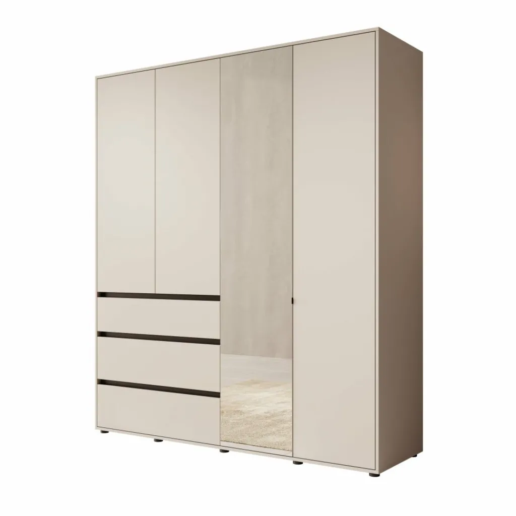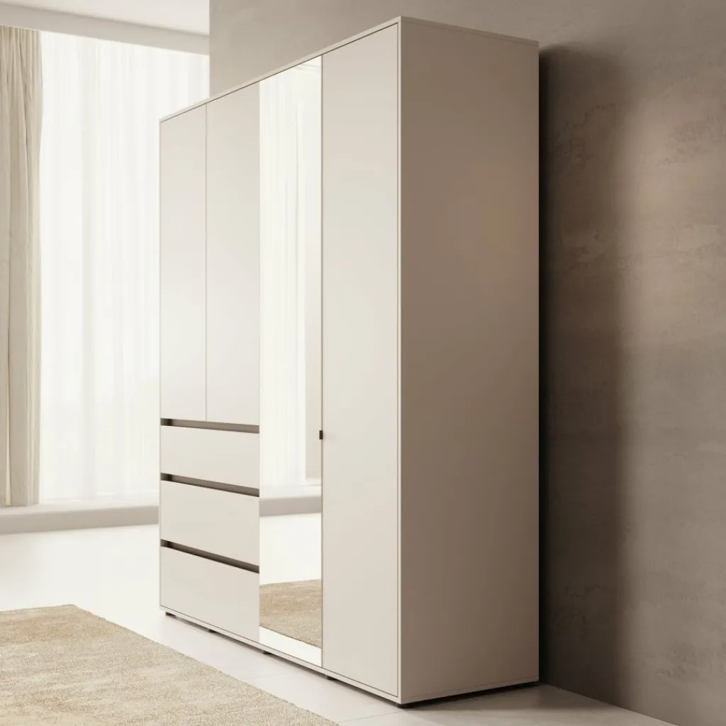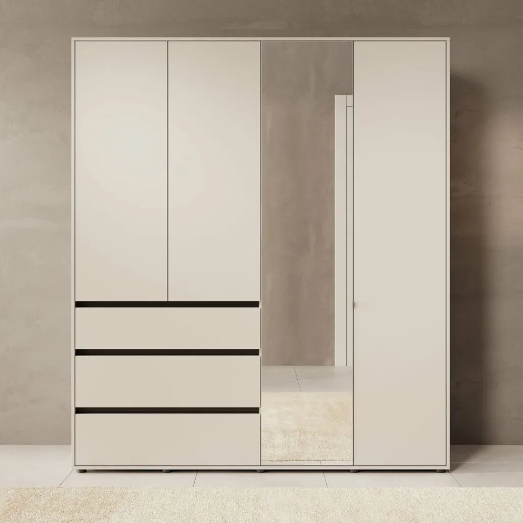 De combinatie van gesloten deuren en een spiegelpaneel op de voorzijde zorgt voor een functioneel geheel. De spiegel vergroot optisch de ruimte en is handig bij het aankleden. De beige afwerking geeft de kast een neutrale basis die eenvoudig te combineren is met verschillende kleuren en materialen in de slaapkamer.