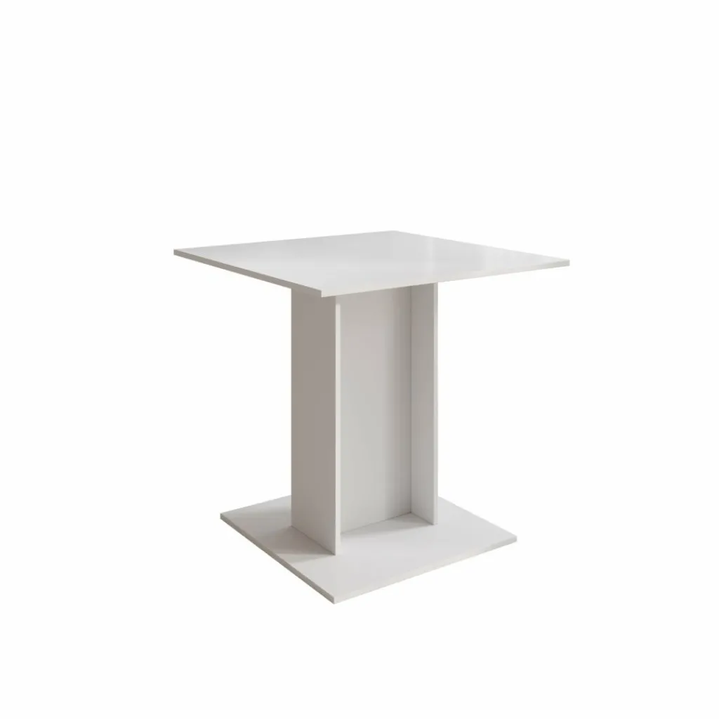 Het tafelblad en de voet zijn uitgevoerd in wit, wat zorgt voor een strakke en neutrale uitstraling die eenvoudig te combineren is met verschillende stoelen en interieurkleuren. De centrale kolompoot zorgt voor vrije beenruimte rondom, waardoor stoelen eenvoudig aangeschoven kunnen worden zonder hinder van tafelpoten op de hoeken.