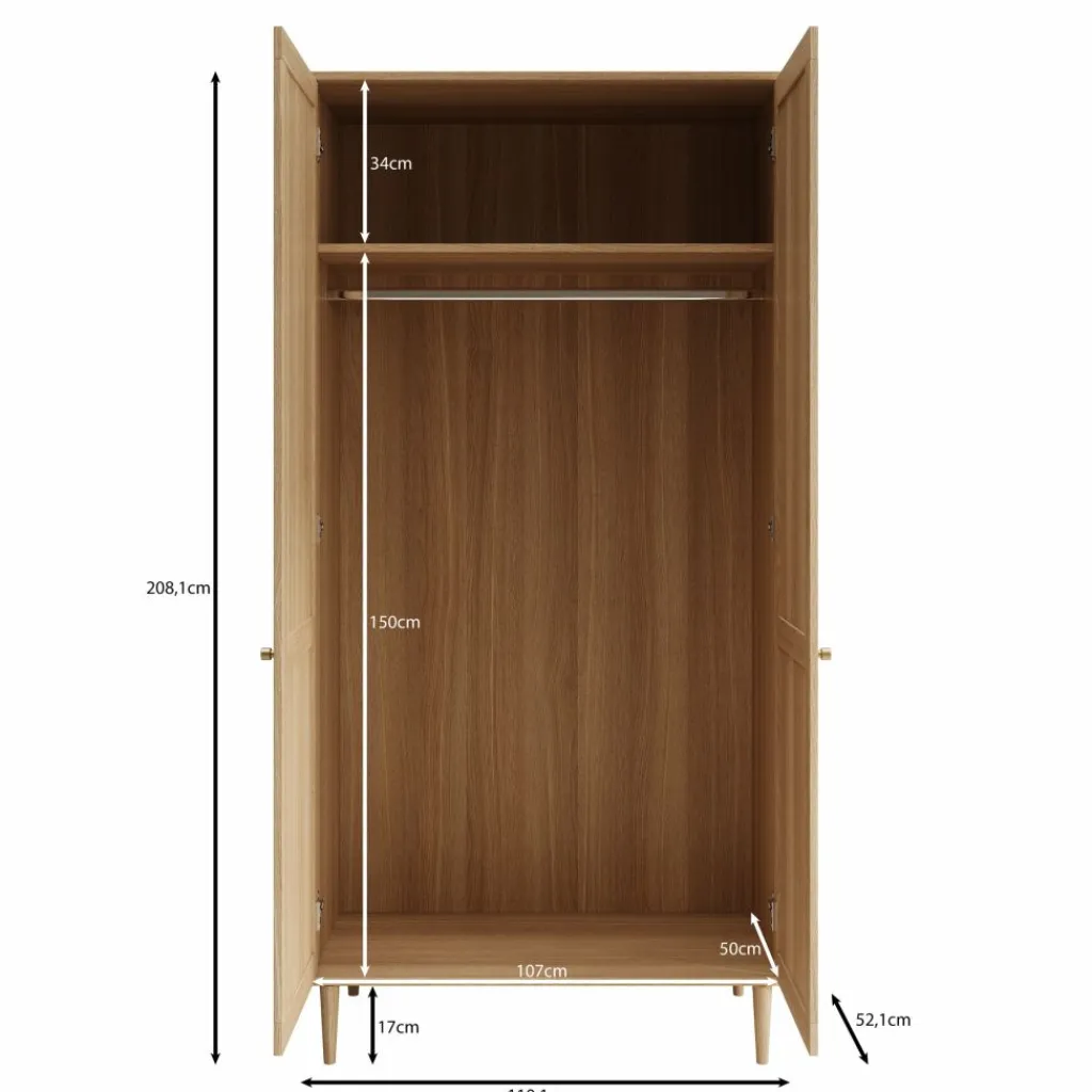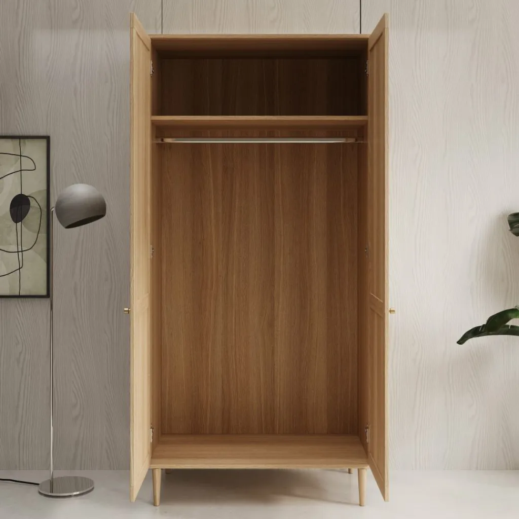 Achter de twee deuren bevindt zich een overzichtelijke indeling met een brede legplank bovenin en een kledingroede eronder. Dit maakt het mogelijk om kleding netjes op te hangen en onderin ruimte te gebruiken voor bijvoorbeeld tassen of opbergboxen. De kast staat op slanke houten poten, wat zorgt voor een open uitstraling en extra ruimte onder de kast.